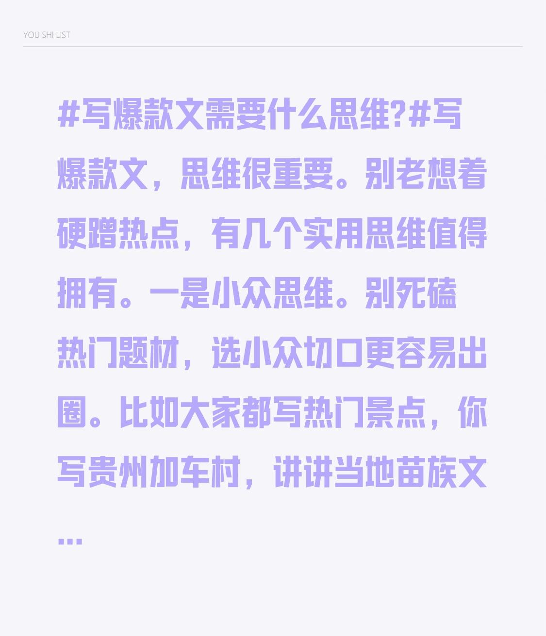 写爆款文需要什么思维?写爆款文,思维很重要。别老想着硬蹭热点,有几个实用思维值得拥有。 一是小众思维。别死磕热门题材,选小众切口更容易出圈。比如大家都写热门景点,你写贵州加车村,讲讲当地苗族文化和梯田美景,独特视角能吸引读者。 二是反向思维。观点别随大流,反向思考显新意。像别人说合群好,你说学会得罪人,人际关系反而更好,但得有事实支撑。 三是流量思维。理解流量本质,让爆款成为常态。流量意味着财富和资源,有流量才有话语权和变现机会。就像开店选人流量大的地方,写文也要吸引流量。