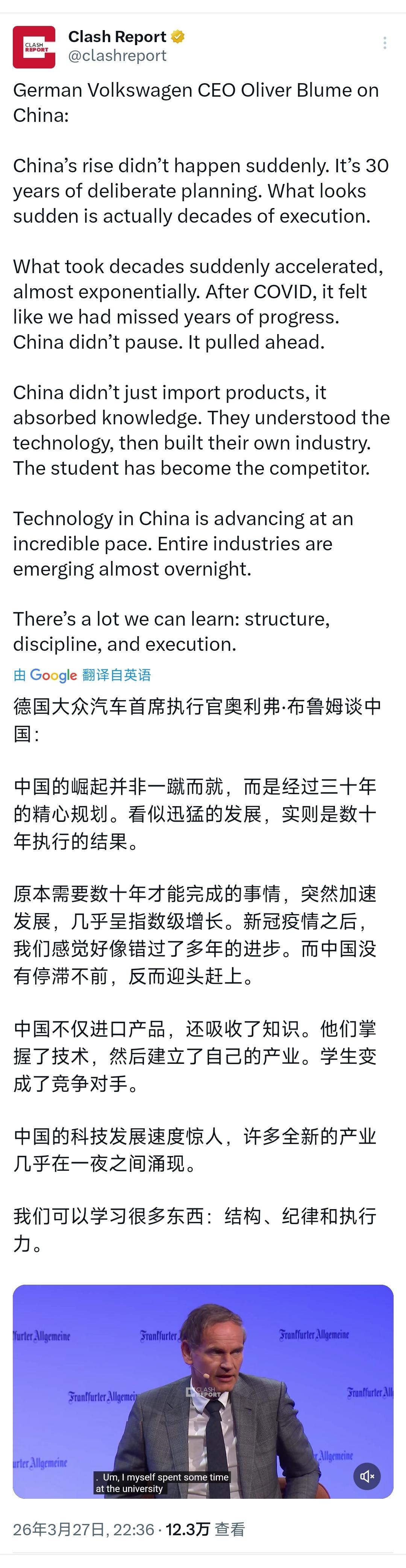 德国大众汽车首席执行官奥利弗·布鲁姆昨晚接受采访时谈到中国:“中国的崛起并非一蹴而就,而是经过三十年的精心规划。看似迅猛的发展,实则是数十年执行的结果。 原本需要数十年才能完成的事情,突然加速发展,几乎呈指数级增长。新冠疫情之后,我们感觉好像错过了多年的进步。而中国没有停滞不前,反而迎头赶上。 中国不仅进口产品,还吸收了知识。他们掌握了技术,然后建立了自己的产业。学生变成了竞争对手。中国的科技发展速度惊人,许多全新的产业几乎在一夜之间涌现。 我们可以学习很多东西:结构,纪律和执行力。” [机智]评几句:德国大众CEO奥利弗·布鲁姆对中国发展的评价,跳出了西方部分势力的偏见与短视,道出了一个最朴素的事实:中国的崛起从无捷径,唯有数十年如一日的精心规划与坚定执行。从引进技术到消化吸收,从跟跑学习到自主创新,中国用三十年时间完成了产业升级的跨越,新冠疫情的冲击更印证了中国发展韧性——当西方陷入停滞时,中国始终锚定发展目标稳步前行,这份定力与效率,正是西方诸多企业和国家所欠缺的。布鲁姆的清醒认知,打破了“中国发展靠捷径”的谬论,让世界看到中国崛起的底层逻辑,是脚踏实地的积累与矢志不渝的坚守。 布鲁姆直言要向中国学习结构、纪律和执行力,更显西方有识之士的务实与理性。中国从不吝于吸收世界先进成果,更善于将外来知识转化为自身发展的动力,从“学生”成长为“竞争对手”,背后是举国上下的协同发力与对创新的持续投入。反观西方部分国家,深陷内耗与短视的政治博弈,动辄以技术封锁阻碍发展,反而错失合作机遇。大众作为深耕中国市场的企业,深谙中国发展的精髓,其表态不仅是对中国发展模式的认可,更给西方世界提了醒:与其抱持偏见搞对抗,不如放下傲慢学经验,唯有正视中国的发展,才能在全球化浪潮中找到自身的发展坐标。