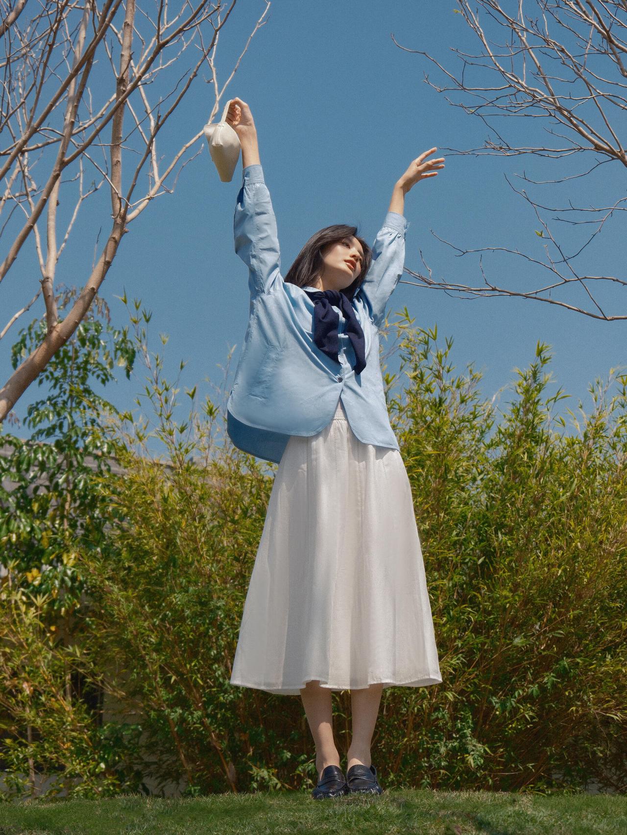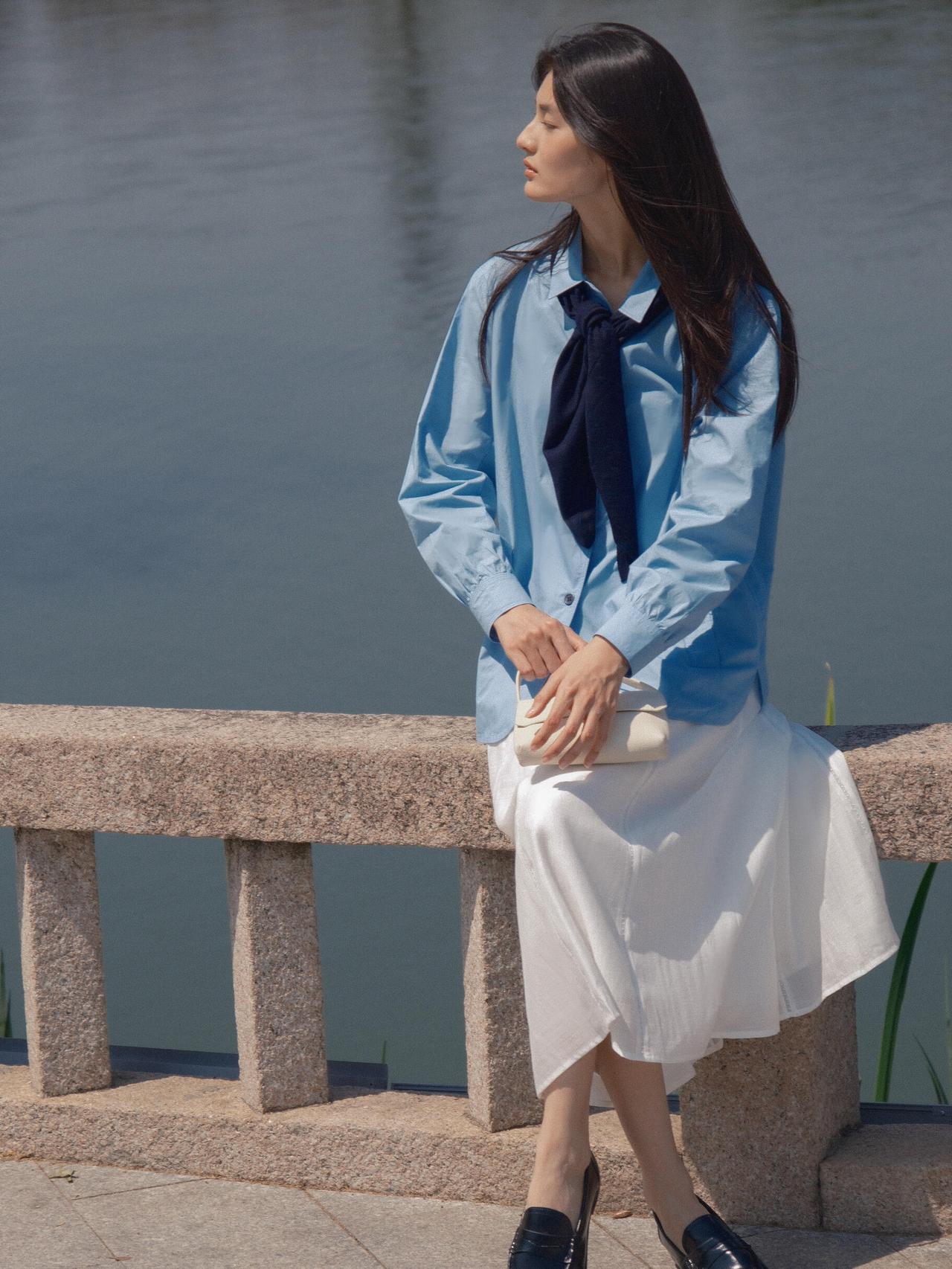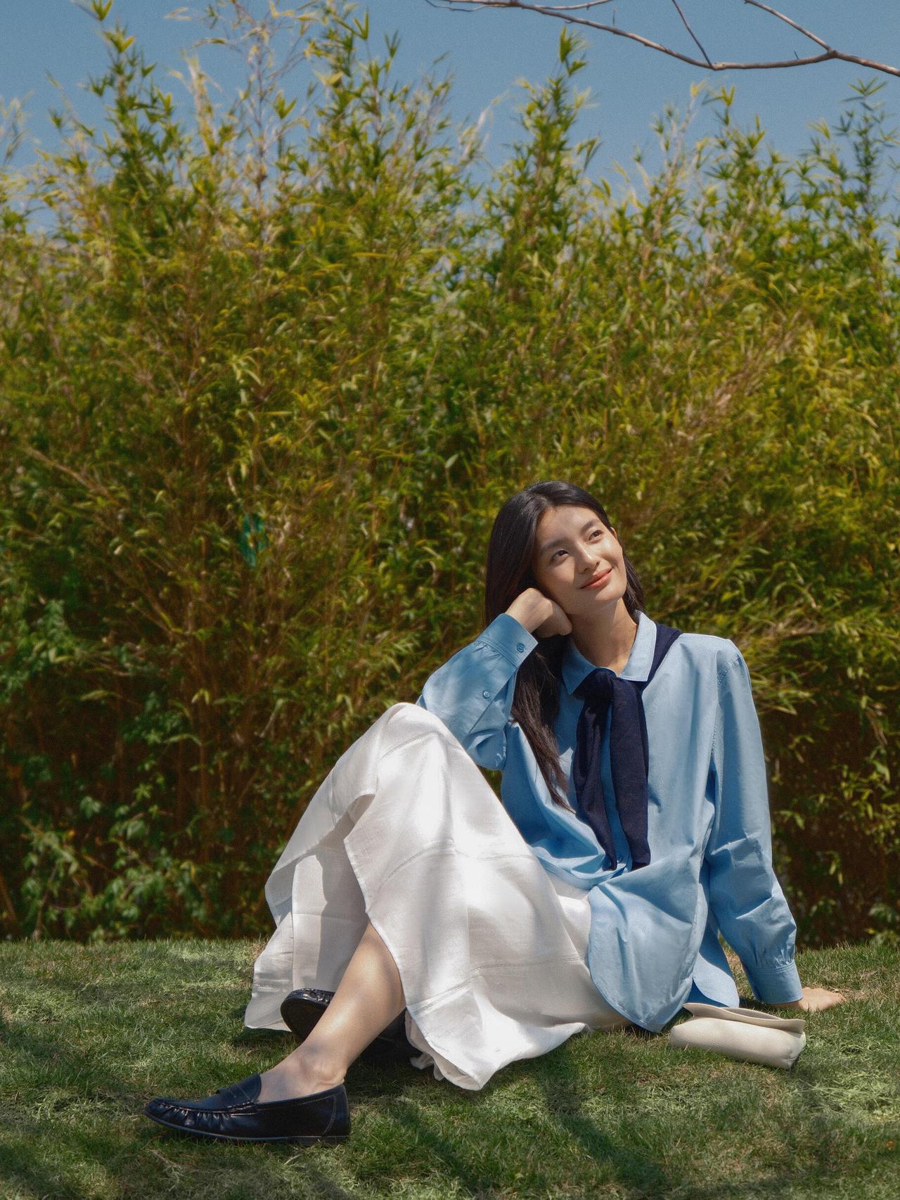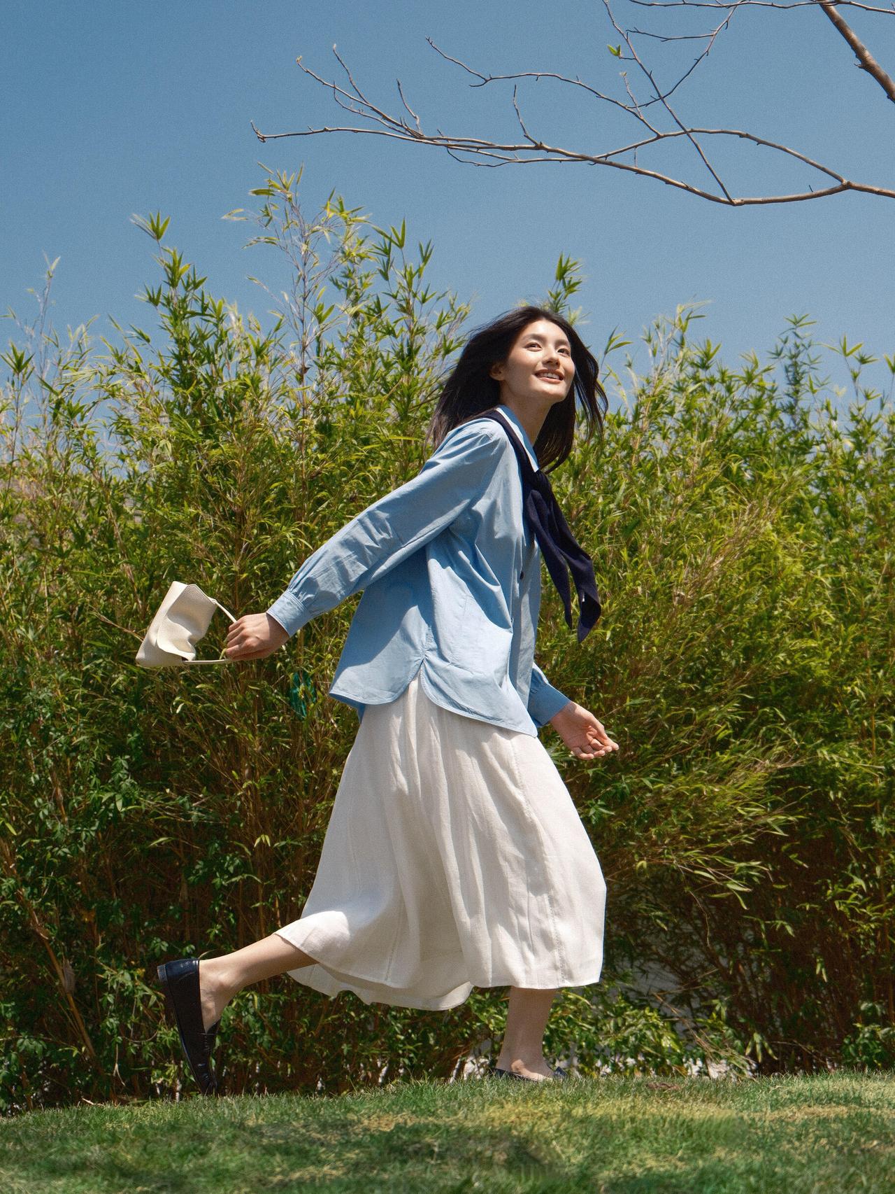 这组春日漫步少女人像,,画面以大面积自然绿为基底,搭配浅蓝衬衫与白色半裙,色彩上形成清新柔和的视觉对比,既贴合春日主题,又弱化了人物与环境的边界感,让整体氛围更具呼吸感。 构图上,摄影师灵活运用了多种经典人像构图:行走时采用三分法,将人物置于画面右侧,留白的自然环境延伸了空间感;倚靠绿植时用前景遮挡,通过虚实对比突出人物面部神态;坐在草坪与倚靠石栏时,则采用中心构图与对称构图结合的方式,让人物姿态更舒展,同时强化了画面的稳定感。光线选择上,多为侧光与侧逆光,既勾勒出人物发丝与衣物的轮廓,又在皮肤与布料上形成柔和的明暗过渡,避免了强光下的生硬感,让春日暖意更具象。 不足在于部分画面中人物手部姿态略显刻意,比如高举包包的镜头,与整体松弛的调性略有冲突;此外,水面场景的背景稍显杂乱,若能进一步简化背景,或利用大光圈虚化水面波纹,人物主体会更突出。整体而言,这组作品成功用生活化的场景与柔和光影,传递出春日里少女自在漫步的情绪,是氛围感人像的优质范本。