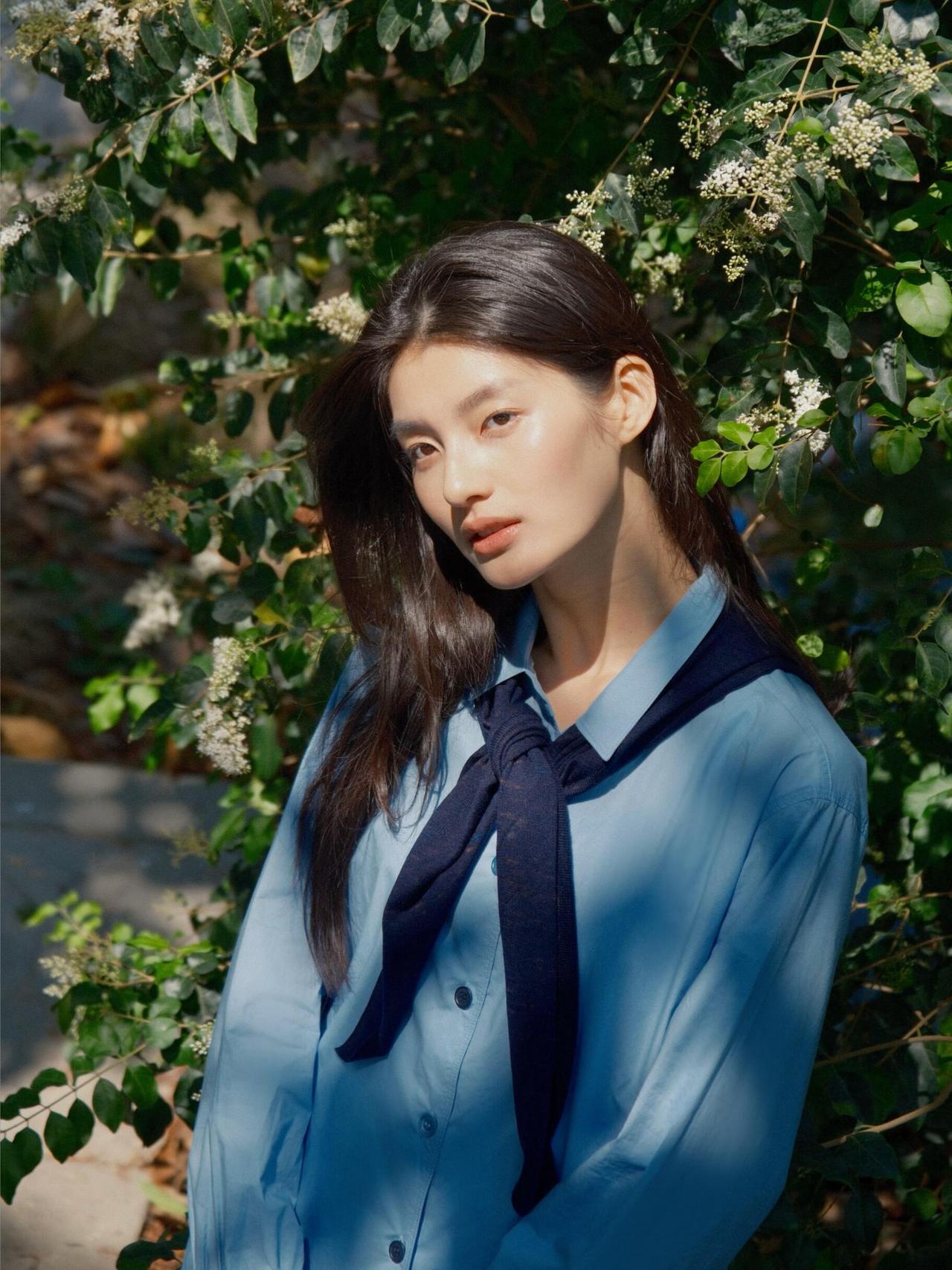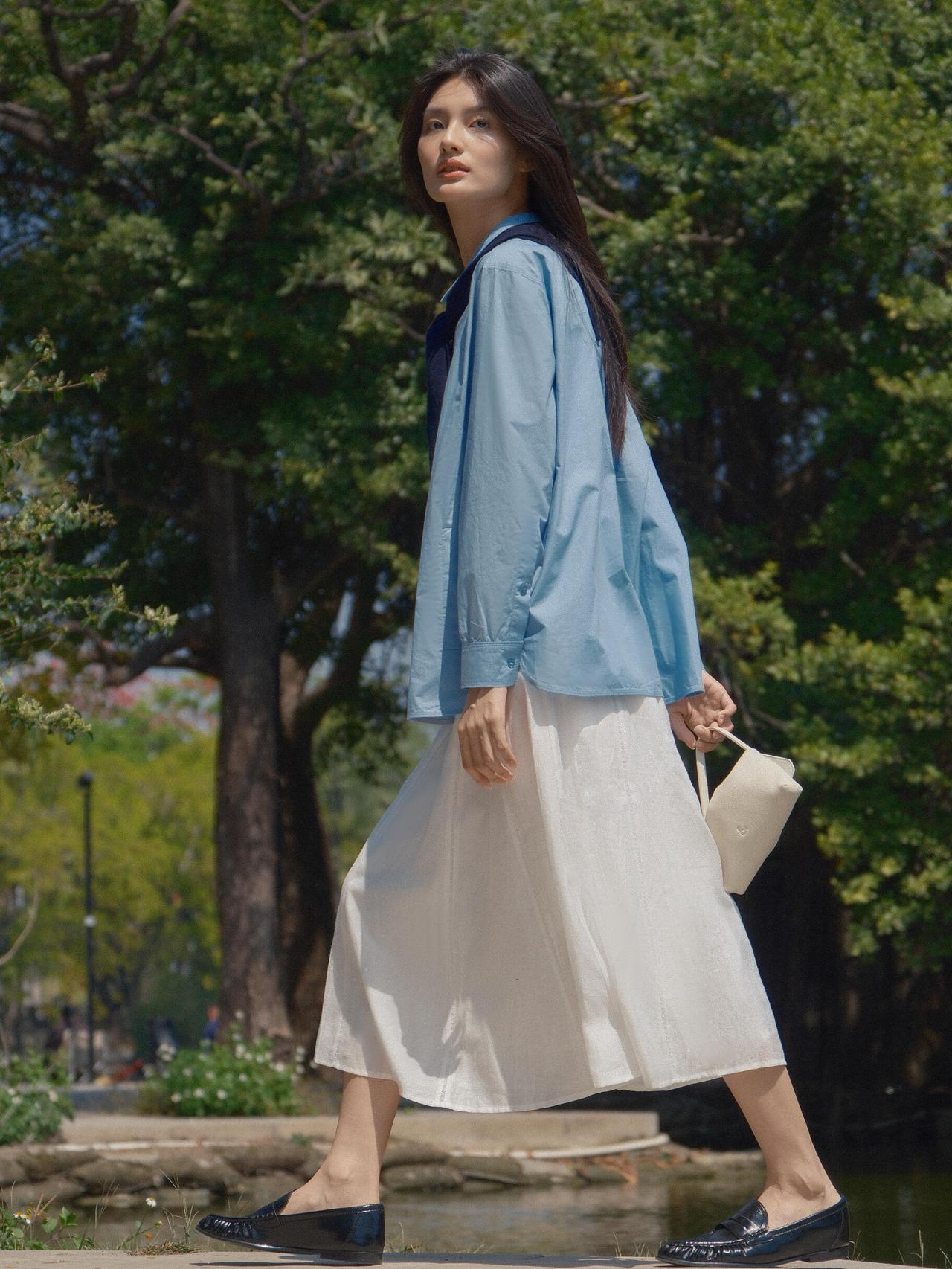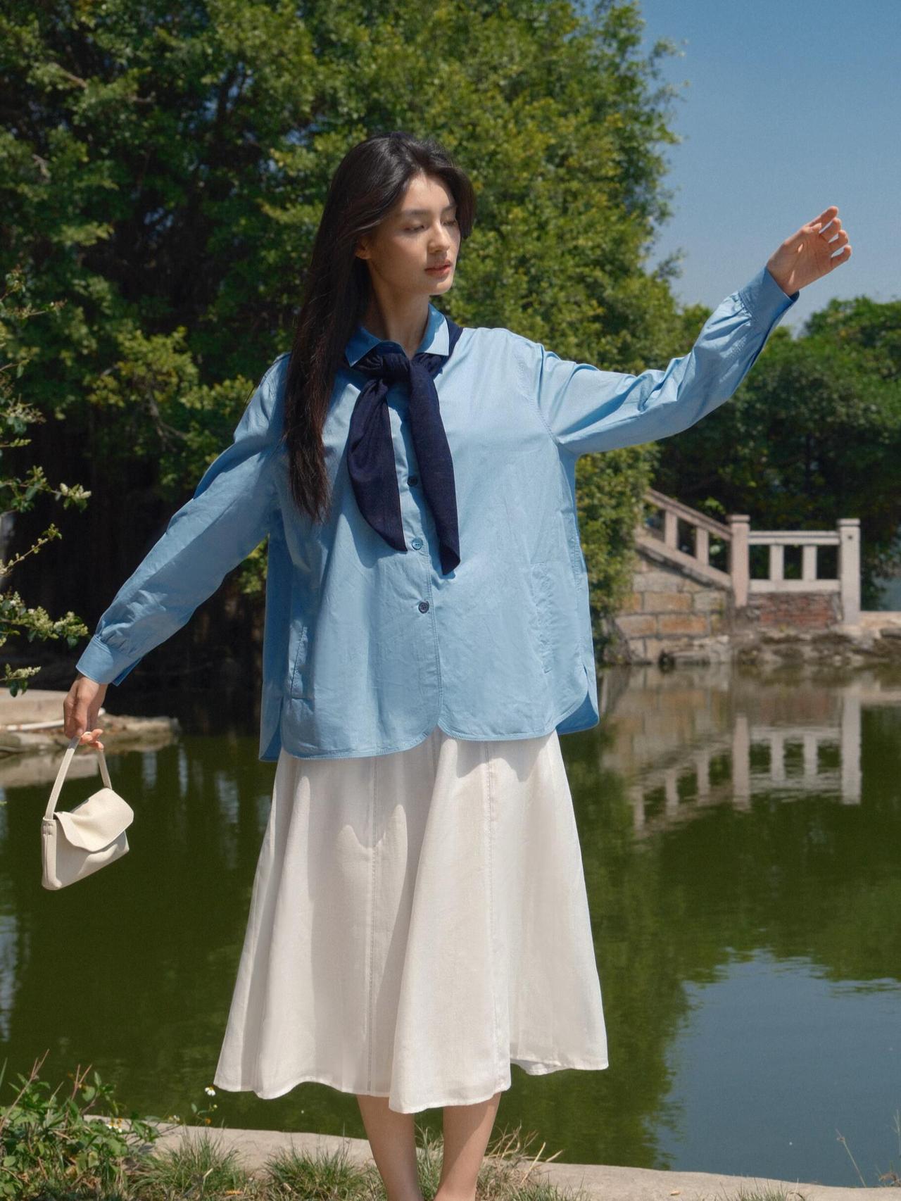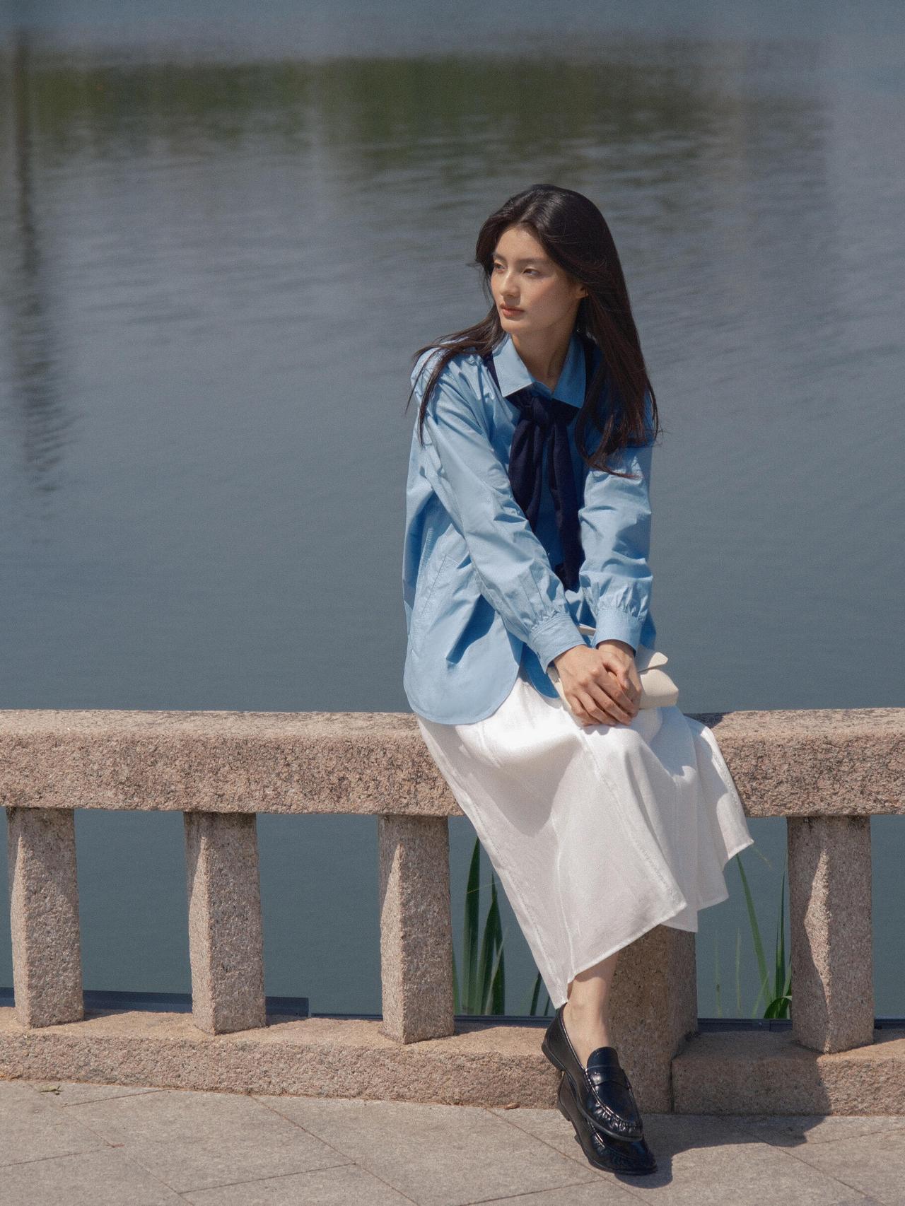 这组春日漫步少女人像,,画面以大面积自然绿为基底,搭配浅蓝衬衫与白色半裙,色彩上形成清新柔和的视觉对比,既贴合春日主题,又弱化了人物与环境的边界感,让整体氛围更具呼吸感。 构图上,摄影师灵活运用了多种经典人像构图:行走时采用三分法,将人物置于画面右侧,留白的自然环境延伸了空间感;倚靠绿植时用前景遮挡,通过虚实对比突出人物面部神态;坐在草坪与倚靠石栏时,则采用中心构图与对称构图结合的方式,让人物姿态更舒展,同时强化了画面的稳定感。光线选择上,多为侧光与侧逆光,既勾勒出人物发丝与衣物的轮廓,又在皮肤与布料上形成柔和的明暗过渡,避免了强光下的生硬感,让春日暖意更具象。 不足在于部分画面中人物手部姿态略显刻意,比如高举包包的镜头,与整体松弛的调性略有冲突;此外,水面场景的背景稍显杂乱,若能进一步简化背景,或利用大光圈虚化水面波纹,人物主体会更突出。整体而言,这组作品成功用生活化的场景与柔和光影,传递出春日里少女自在漫步的情绪,是氛围感人像的优质范本。