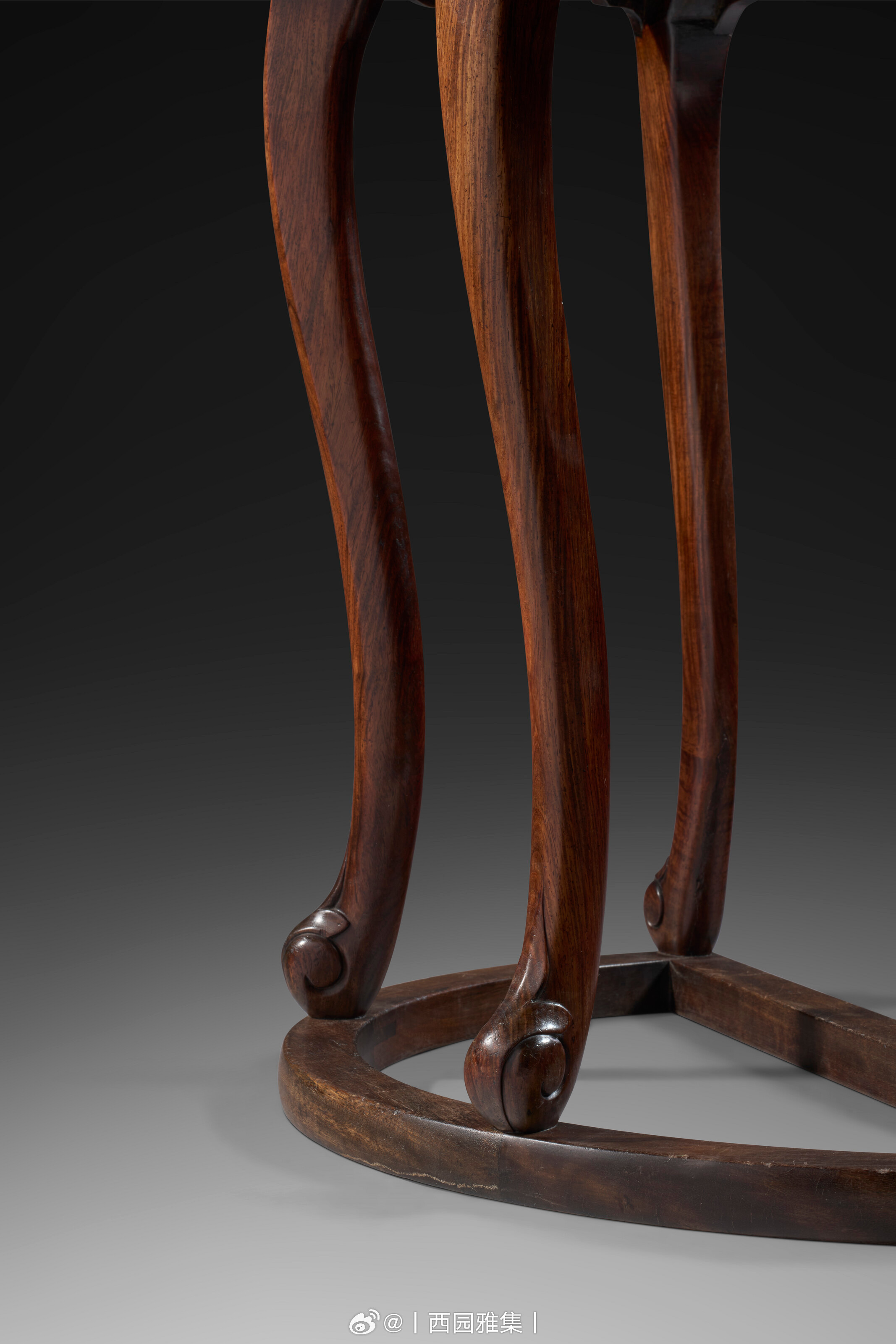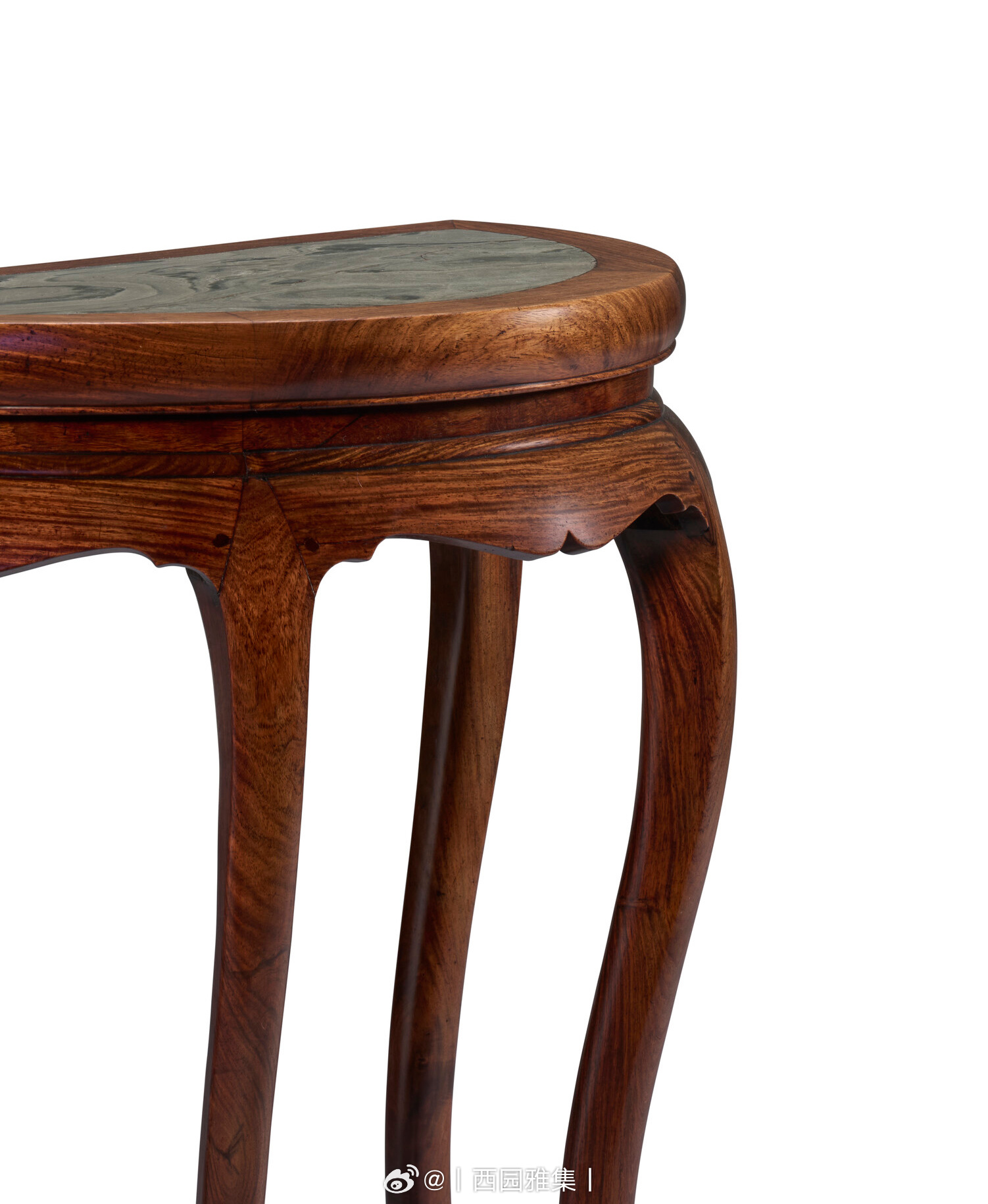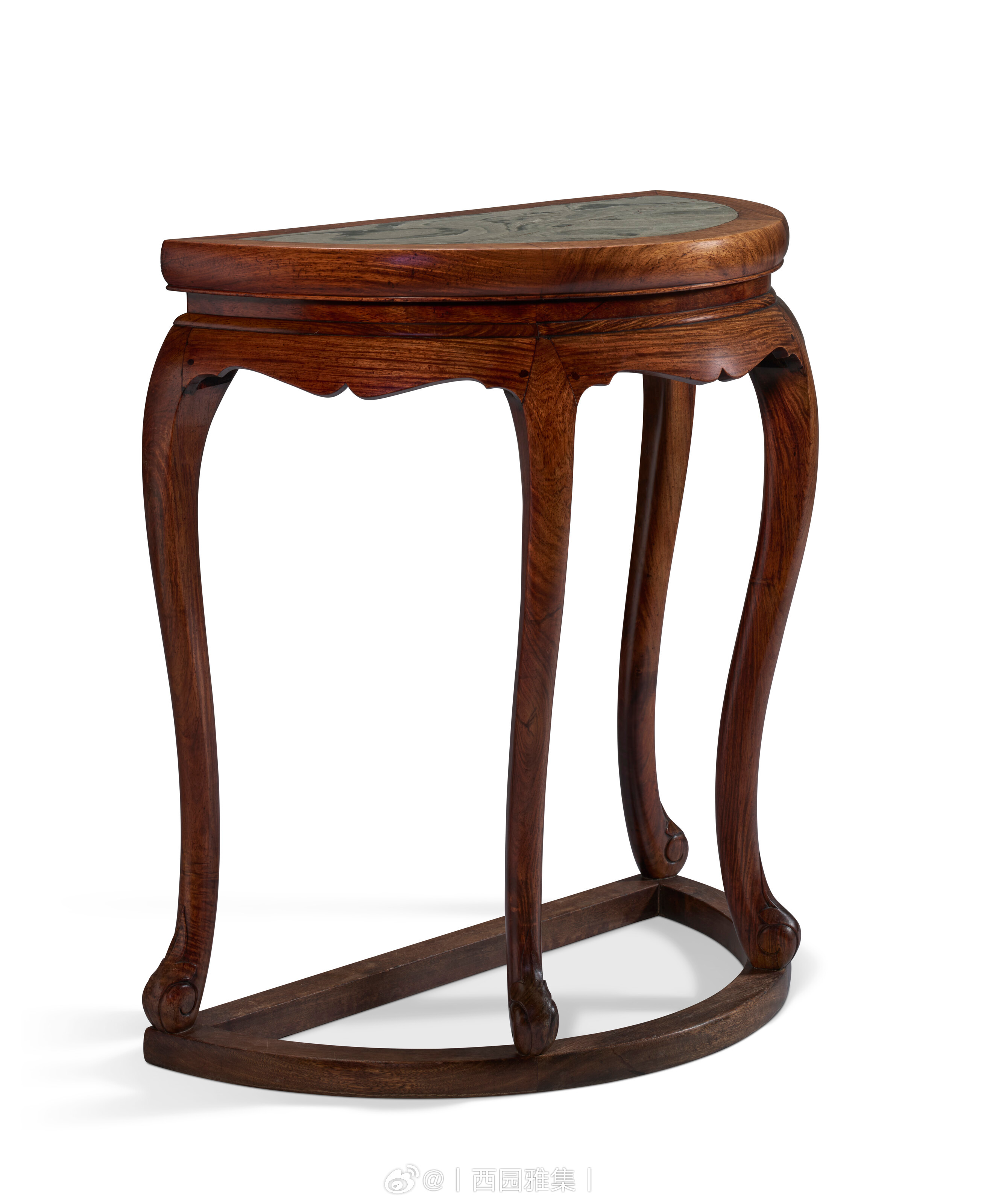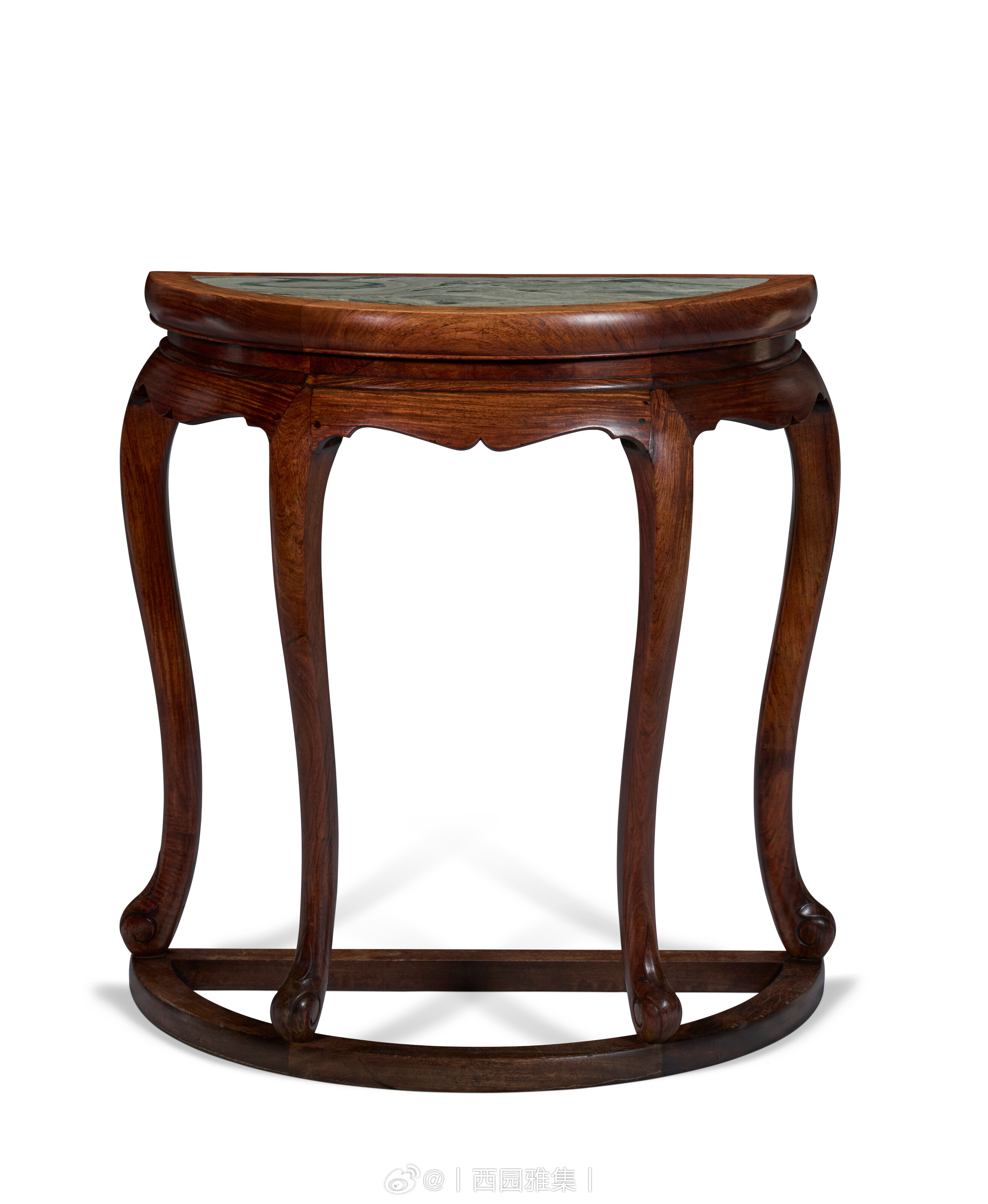 月牙、半月、半圆,顾名思义为圆月、圆形分半,多为成对製造,拼合成双。然细观本桌之三弯腿、马蹄足、足端卷草纹、背面线脚,可推断为单独製作,而非複桌之一。本桌选嵌绿色大理石面,为其一大特色。石製桌面易于清洁,防潮耐热,能抵香炉高温,不渗酒渍茶渍,无惧室外风化损伤,实用程度尤胜木面。牙子锼壶门式轮廓,清丽典雅,可与一具十七世纪黄花梨嵌绿云石酒桌之罕见造型比对,2024年3月22日经纽约佳士得拍卖,拍品编号1119。