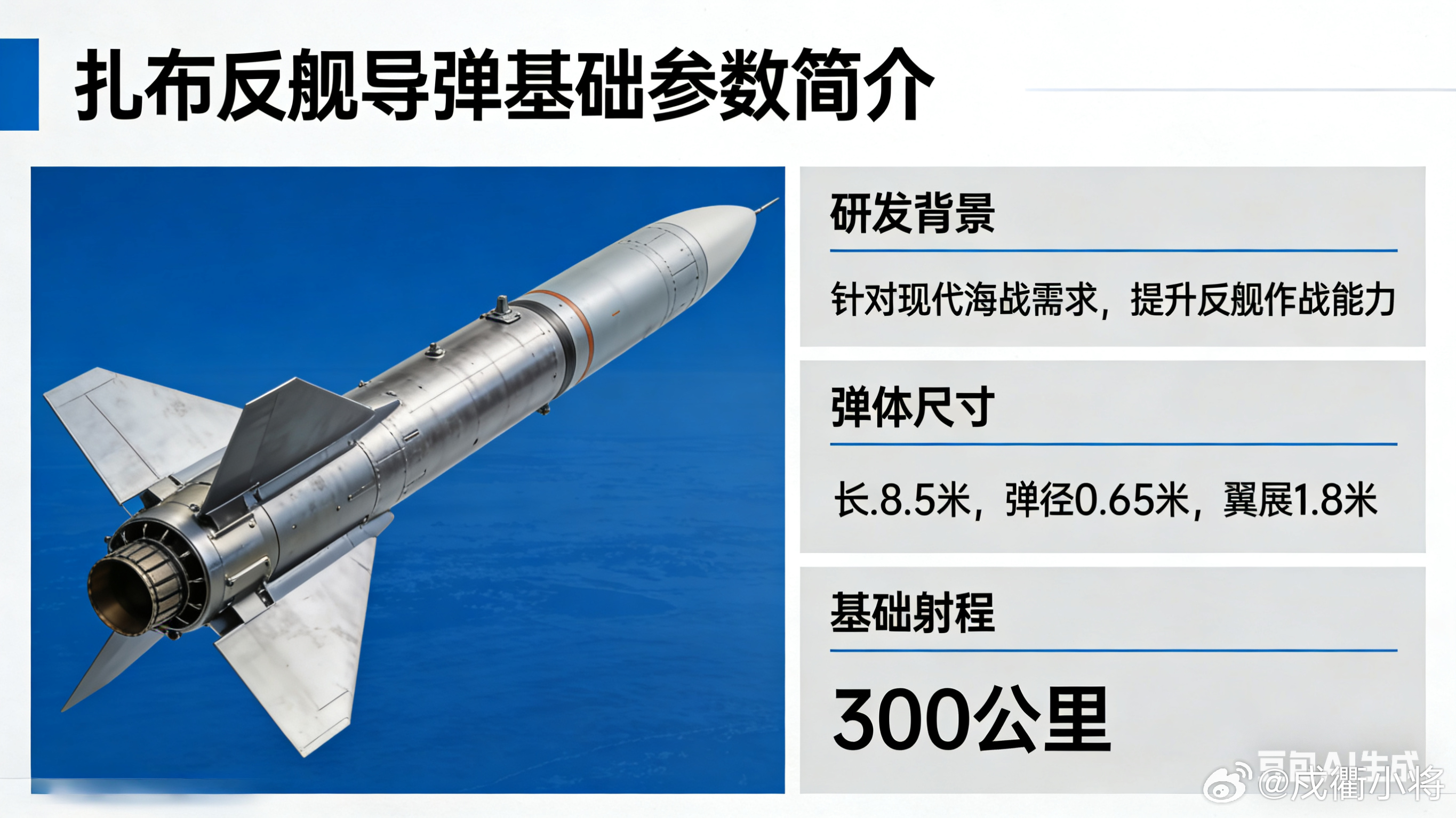 扎布(Zarb)是巴基斯坦海军的陆基机动亚音速反舰巡航导弹,名称意为“打击、命中”,2016年试射成功后正式列装,主要执行近岸反介入与区域拒止任务,用于封锁阿拉伯海沿岸海域。该导弹基于外贸反舰导弹技术国产化,与哈尔巴导弹技术同源,主要差异在进气道和发射平台。导弹全长约6.8米,弹径0.36米,重约1.3吨,飞行速度0.8马赫,射程约300公里,配备300公斤半穿甲高爆战斗部,可有效毁伤中型水面舰艇。采用惯性+卫星修正+主动雷达复合制导,抗干扰能力强,复杂海况下打击精度较高。该弹采用8×8越野卡车搭载三联装发射筒,机动与隐蔽性强,战场生存能力突出。在巴基斯坦海上作战体系中,扎布负责近岸防御,与远程导弹形成火力搭配,是其岸基反舰作战的核心装备之一。军事ai新视野ai创造营