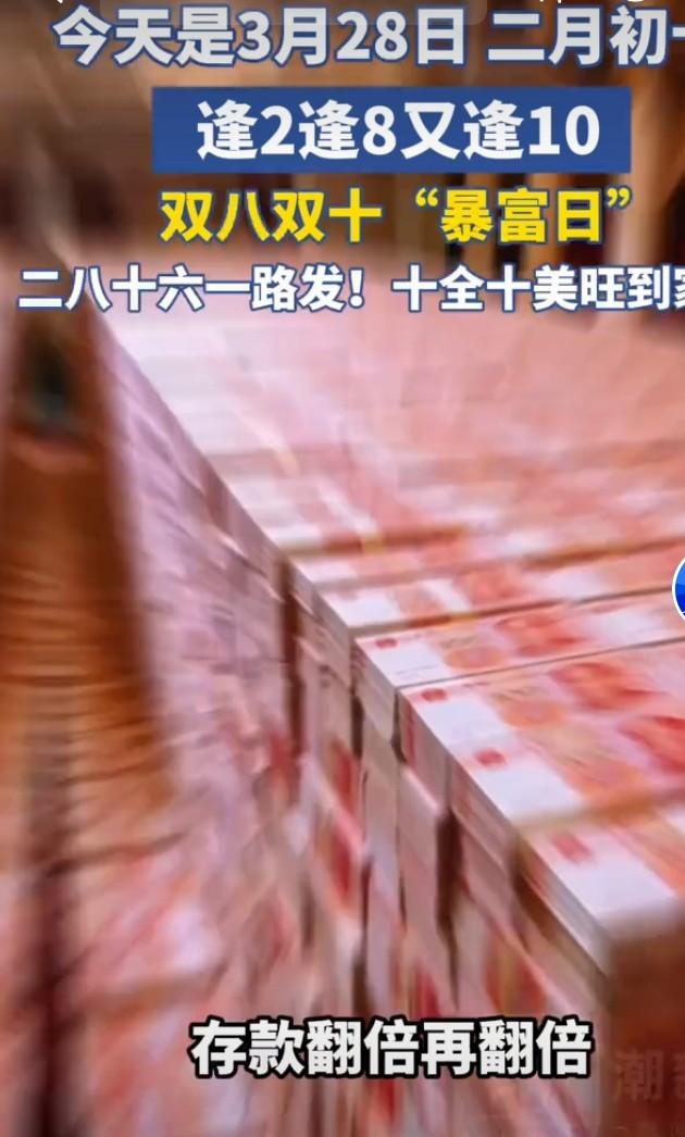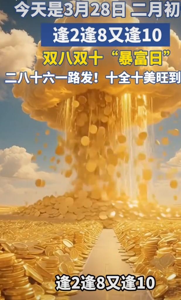 大家快来接住这泼天的富贵日,难得一遇的超级暴富日。 没错,今天3月28,二月初十,逢2逢8又逢10,双8双10“暴富日”,祝大家从此一路发发发。 先看看日期,公历3月28日,农历二月初十,这组数字凑在一起,简直是财神爷亲自排的吉祥局。 而我们也直接把今天定为双8双10暴富日,错过今天,再等这样的吉日可就难喽! 再掰扯一下这藏在日子里的发财密码: 且看公历,就占了2和8,“2”是好事成双、好运翻倍,“8”是八方来财、一路大发,单单一个28,就是“易发”的谐音,藏着轻松发财、顺遂得财的好兆头; 而农历二月初十,又占了2和10,“2”是双喜临门、福气成双,“10”是十全十美、事事圆满,再加上二月初十本就是民间传统的吉祥日,这一天本就自带纳福聚财的buff啊! 尤其更绝的是,今天双8相逢、双10相伴,8+8=发发,10+10=十全十美,逢2逢8又逢10,三重吉数叠加,双重仙神赐福,这样的日子,不是暴富日是什么? 俗话说“吉时遇吉日,财运挡不住”,今天的天时地利全占满,财运福气直接拉满格,不管你是平日里勤勤恳恳的打工人,还是努力打拼的创业者,亦或是守着家庭的宝妈、安享晚年的长辈,都能沾到这份富贵喜气! 虽然很多人觉得“暴富”是遥不可及的梦,其实也并非如此。。 因为我们盼的暴富,从不是一夜之间腰缠万贯的虚幻,而是日子越过越顺、钱包越来越鼓、烦心事越来越少的踏实; 是家人平安健康、财运细水长流、遇事总有贵人帮、出门总能遇好事的圆满。 今天这份泼天富贵,从来都不是专属某一个人,而是送给每一个认真生活、心怀期待的人。 从今天开始,看到每个人都会出门遇贵人,做事有章法,赚钱有门路,花钱有底气,存款数字慢慢涨。 从今天开始,每个人想吃的美食能吃到,想去的地方能抵达,家人无病无灾,生活有奔头有盼头,这就是最实在的“暴富”,这就是最珍贵的福气! 最后再喊一句:3月28暴富日,泼天富贵快接住!双8双10吉运到,从此发财没烦恼! 评论区留下“接暴富,一路发”,让我们一起见证好运降临,今年都能赚得盆满钵满,日子过得十全十美!