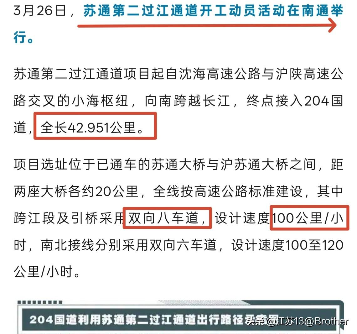 苏通二桥,即将正式开工!全长一个马拉松,直通南通新机场! 前天,苏通二桥的开工动员,成功举办。这意味着,南通很快将迎来又一座跨江大桥的正式开工。 此刻,距离苏通大桥的通车已经过去了近20年。回首20年的时光,每逢节假日,苏通大桥都拥堵不堪,承载着南来北往的归乡人归乡之路。 苏通二桥的位置选的很好,基本就在沪苏通大桥和苏通大桥的正中间,各20公里。八车道,限速100,在南通接入沈海高速的小海枢纽,在张家港接入国道204。 全程大概42.9公里,差不多就是一个全程马拉松的距离。 由于接入了小海枢纽,未来通达南通的兴东机场和新机场都是很方便的。可以走沈海高速去兴东,也可以转南通的二环高速,也就是绕城高速去新机场。 总之,苏通二桥不仅可以缓解苏通大桥的拥堵现状,还能给南通的立体交通带来更大的腾飞,具有深远的意义,非常值得期待!