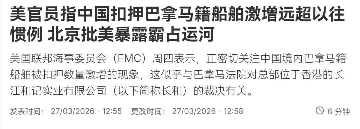 美方直接喊话中方!   美国人急了。海事委员会主席迪贝拉跳出来,指责中国疯狂扣押巴拿马货船。短短二十天,近七十艘船被按在中国港口。美国为啥替巴拿马喊冤?这背后是一场惊心动魄的暗战。   事情起因是巴拿马政府先掀了桌子。他们背信弃义,单方面撕毁合同,强行接管了中资企业长和港口的巨额资产。   这绝非普通商业纠纷,而是明目张胆的强盗行径。面对这种毫无底线的商业伙伴,中国绝不会咽下这口气。   反制来得雷厉风行。从三月八日开始,中国依法收紧了“港口国监督”的口袋。针对悬挂巴拿马国旗的船舶,安全检查力度直线飙升。   这波操作不仅合情合理,更是合法合规。既然巴拿马政府成了信用破产的高风险对象,我们自然要对你的船只严加防范。   对进出本国港口的船只进行严格安检,这是中国正当行使国家主权。捍卫自身权益,轮不到外人插嘴。   但美国人坐不住了。迪贝拉急吼吼地发表声明,指责中国做法“远超以往惯例”,是在搞“非正式指令”惩罚巴拿马。   他甚至搬出美国国内法,威胁要动用联邦海事委员会的权力,调查中国是否损害了美国的贸易利益。   美国这波“仗义执言”,真是为了保护巴拿马?别天真了。悬挂巴拿马国旗的货船,在美国集装箱贸易中占据着相当大的份额。   中国精准捏住巴拿马的软肋,直接让美国航运界感到了切肤之痛。美国急的是自己的钱袋子。   剥开表象,美国才是这场风波的幕后元凶。巴拿马运河是全球航运咽喉,更是美国的战略生命线。   美国绝不允许中国在自己的“后院”拉美地区扩大经贸影响力。怂恿巴拿马强抢中资港口,就是美国精心设下的连环局。   美国人的算盘打得很精。妄图通过操控运河咽喉,遏制中国的全球战略布局,逼迫中国在核心利益上妥协让步。   他们满世界搞“长臂管辖”,随便制裁别国。现在中国依法行使港口主权,美国却倒打一耙,双标玩得炉火纯青。   面对挑衅,中国这次的“精准反制”打得极其漂亮。没有直接升级政治对抗,也没有动用军事威慑。   就是在技术规则范围内,把合规检查做到极致。既名正言顺,又让巴拿马和背后的美国付出了实实在在的商业与战略代价。   大国博弈,拼的是定力和手段。巴拿马这面“方便旗”,现在已经成了烫手山芋。只要美国还想在拉美搞霸权排挤,中方的合法反制就不会停。   这不仅是对背信弃义者的严厉惩罚,更是给所有企图跟风作恶的势力立下规矩。