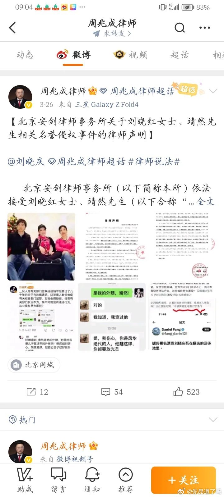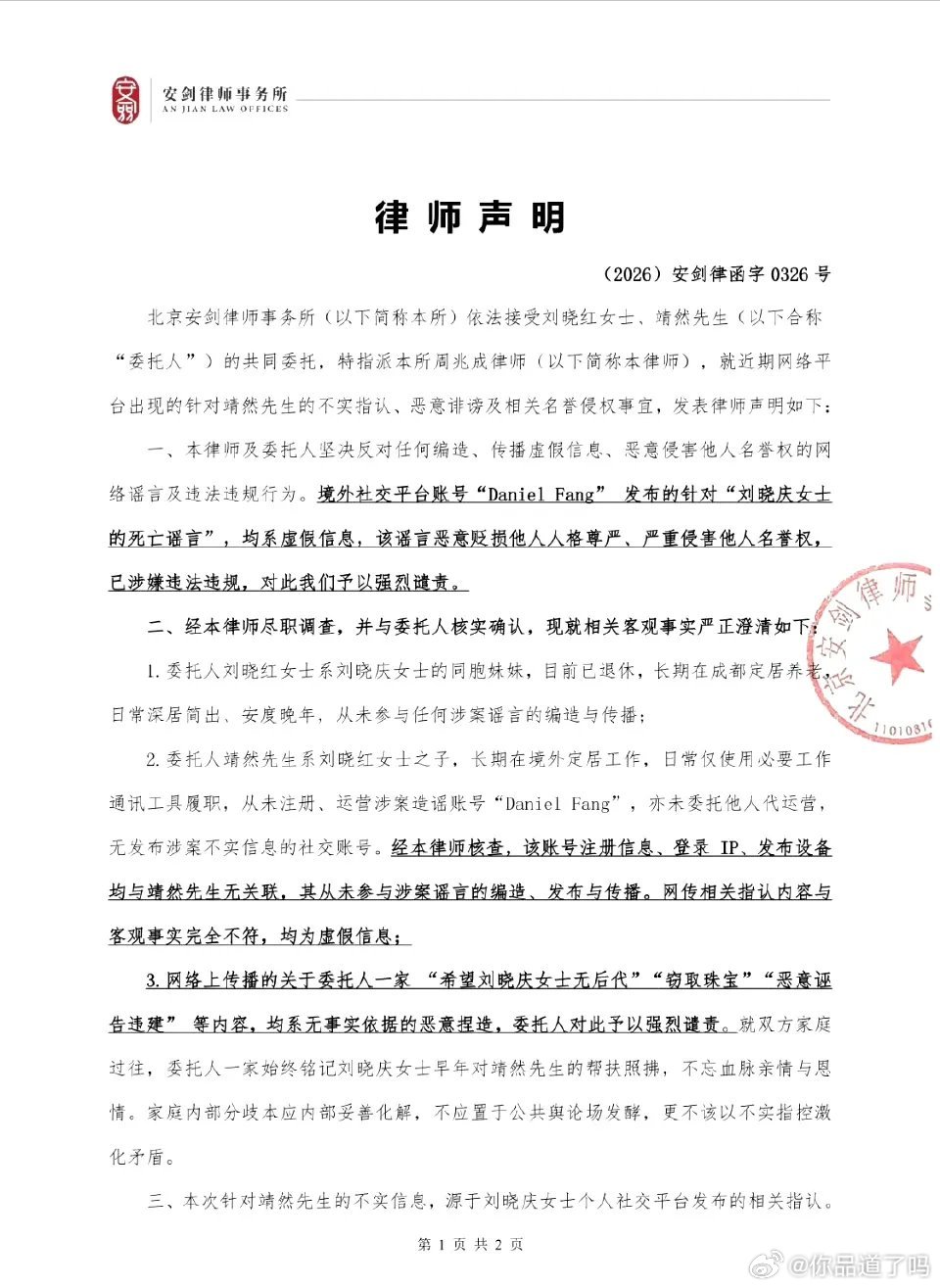 - 3月26日:靖然+母亲刘晓红(刘晓庆妹妹)委托律师发声明:- 靖然从未注册/运营造谣账号,IP/设备均无关 。- 否认举报违建、造谣死讯、“吃绝户”等所有指控。- 警告:再造谣将依法追责 。- 随后:刘晓庆删除两条相关动态。是非曲直刘晓庆公开指控亲属造谣,对方用律师声明强硬否认并反指其侵权,刘晓庆删帖,目前无实锤证据,双方各执一词 。