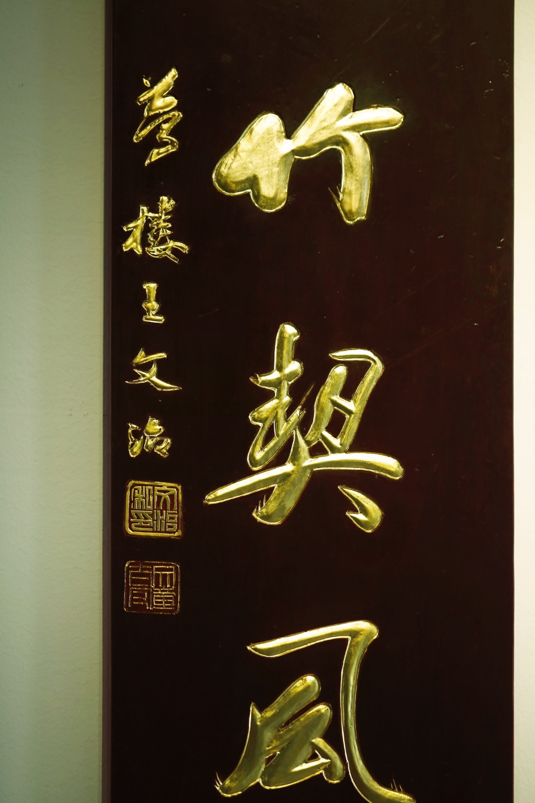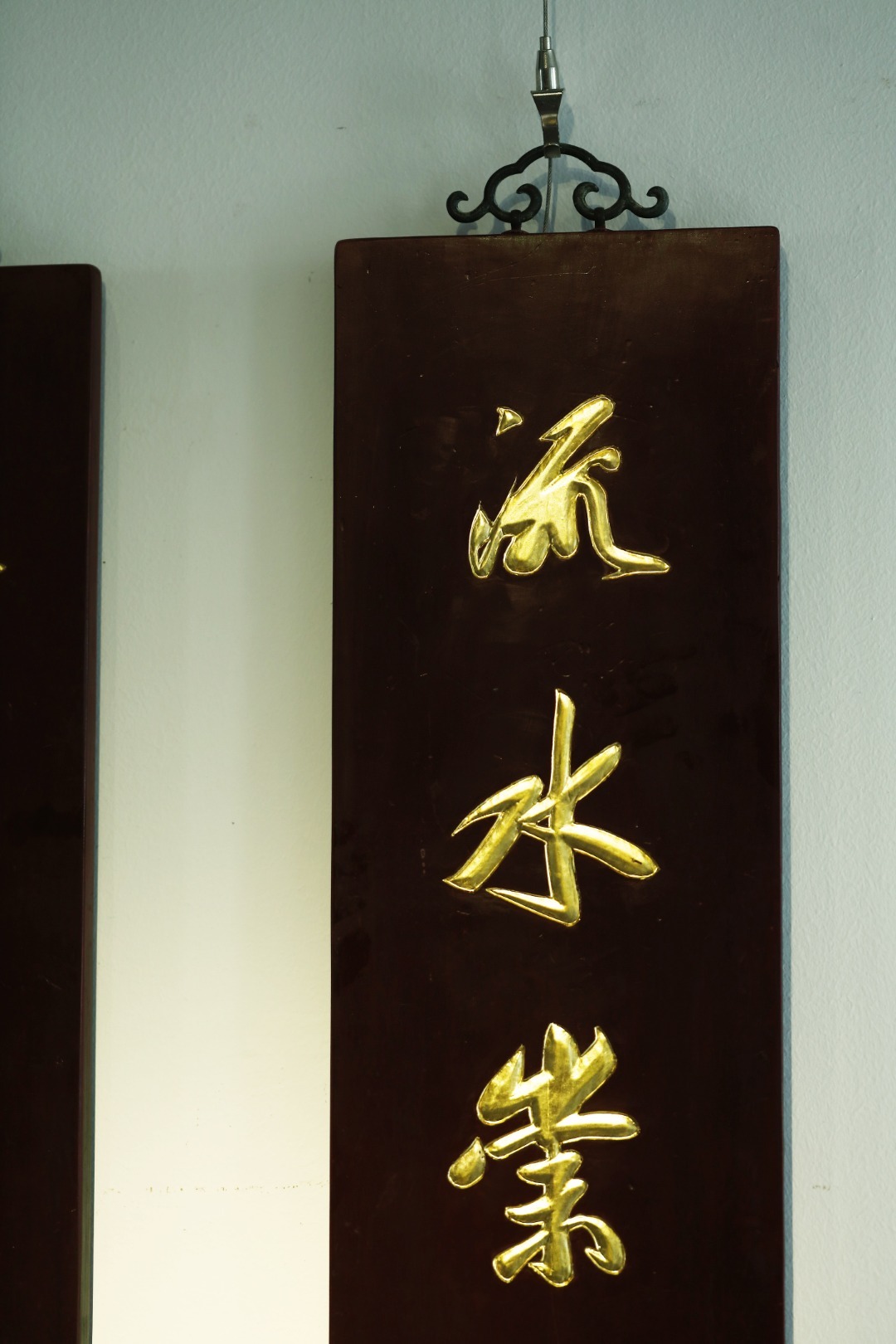 老楠木新作,形制古雅,手工阴阳刻,后贴真金箔;释文:“流水崇山怀作者,春兰幽竹契风人。”悬于文房雅室,可添静雅之韵。