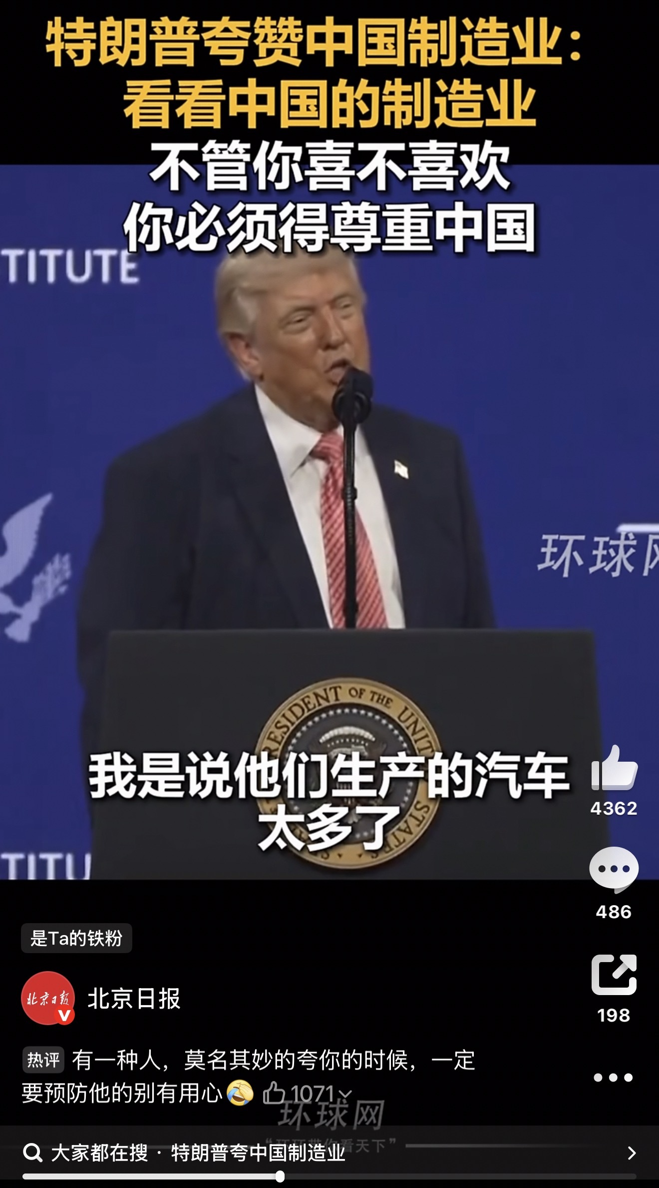 特朗普称必须尊重中国比赛谁造的少是什么意思?你重说!