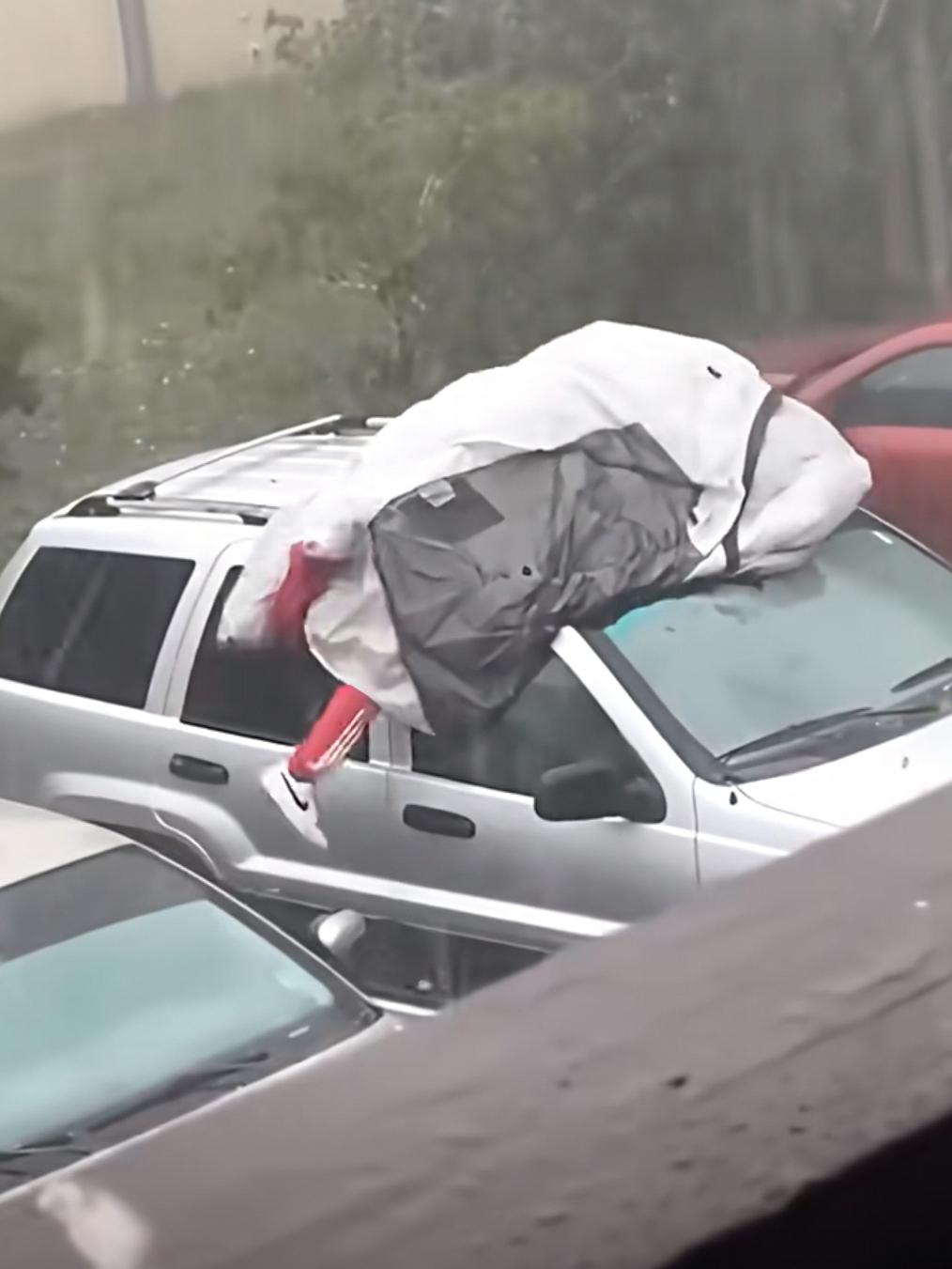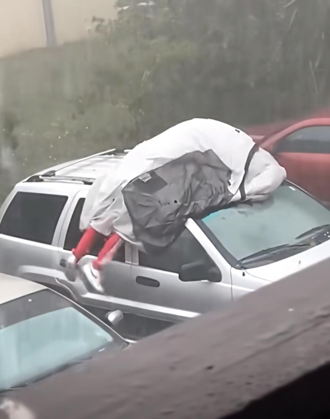 美国这哥们看来是真爱惜自己的座驾! 佛罗里达州不养闲人,当冰雹突然而至,这哥们为了爱车也是拼了,来不及打开车衣,他就钻里面,把自己当成海绵,为车挡冰雹! 这冰雹个头不小,给这位兄弟砸得滋哇乱叫。 旁边房子里的邻居都被这滑稽的一幕笑死了! 但是我们好像都理解了,如果车坏了,那就是天塌了,修车就可能占用房租的费用,没钱交房租,那就彻底跌入斩杀线了。 车就怕冰雹砸
