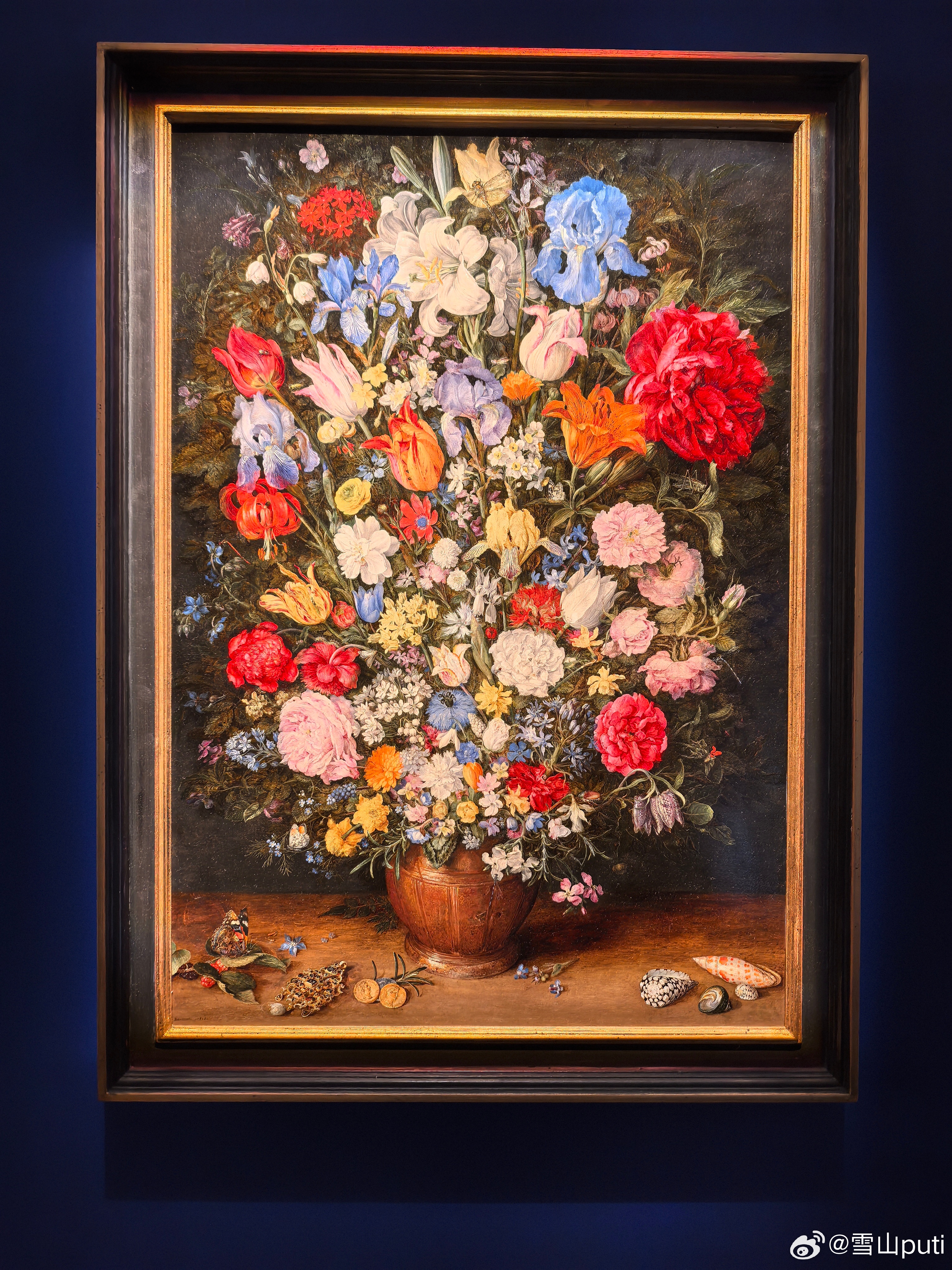 图6是佛兰芒画家老扬·布鲁盖尔(Jan Brueghel the Elder,又称“天鹅绒布鲁盖尔”)的花卉静物画,作品名为《静物:木台上赤陶瓶中的绚烂花卉,伴一簇仙客来、几颗钻石及蓝宝石》(也常被称为《陶瓶里的花束》),创作于1606–1609,木板油画,是ambrosiana博物馆镇馆名作之一。 称为“老”,因为还有小扬·勃鲁盖尔,其画作也收藏于此。