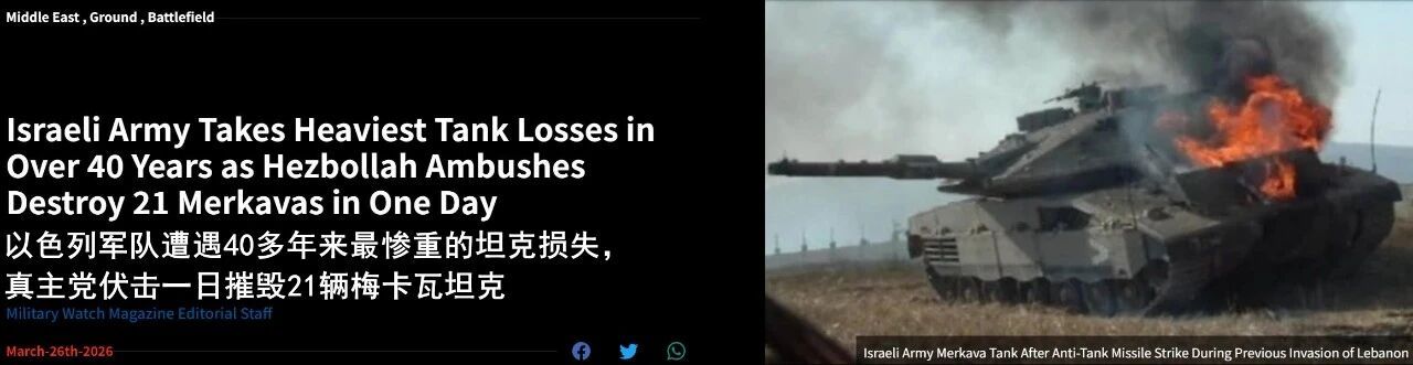 一天之内,21辆梅卡瓦坦克被摧毁!这是以色列装甲部队40多年来最惨重的损失。据美媒《军事观察杂志》披露,黎巴嫩真主党武装使用FPV无人机,在一天之内摧毁了以色列21辆梅卡瓦主战坦克。FPV传回的图像很清晰,这些梅卡瓦坦克,连防无人机措施都没有,活该被打爆。熟悉军事的朋友都知道,梅卡瓦坦克是以色列自主研发的“国宝级”装甲武器。它是以色列在这个强敌环伺的中东立足的根本,更被西方军事界长期誉为“世界上防护力最强的坦克”。梅卡瓦的设计理念是“乘员生存率第一”,远超传统坦克的“火力优先”或“机动优先”。它拥有独特的“引擎前置”布局,将沉重的柴油发动机和传动系统布置在车体前部。这意味着,即便车体正面被击穿,巨大的发动机模块也会充当额外的“盾牌”,吸收并阻挡大量弹片和冲击波,为后面的四名乘员提供额外生存窗口。这种“舍车保帅”的设计在全球坦克界独树一帜,极大提升了战场存活率。此外,梅卡瓦车体采用厚达数百毫米的复合装甲,并配备了以色列自主研发的“金钟罩”级主动防护系统。能通过雷达侦测来袭的反坦克导弹或火箭弹,并自动发射拦截弹将其在半空中引爆。长期以来,这种“神级”防护让以色列装甲部队自信满满,认为梅卡瓦能在中东任何战场上“所向披靡”。然而,这次真主党的打击,彻底撕开了它在现代战场上的脆弱面纱。梅卡瓦的惨败,并非因为它的装甲不够厚,而是遭遇了教科书级的“降维打击”。据报道,真主党此次使用的主力武器正是FPV自杀式无人机。这种无人机造价低廉,却能以第一人称视角精准操控,像“空中狙击手”一样绕过正面装甲,从顶部或侧后方薄弱处发起致命攻击。毕竟,发动机盖不住天灵盖。梅卡瓦引以为傲的主动防御系统,在面对这种非传统威胁时,往往陷入尴尬境地。要么探测失效,要么反应不及。更致命的是,以军坦克尚未全面加装反无人机“笼网”或电子干扰装置,留下了致命空档。值得一提的是,2023年底以军对哈马斯的行动中,梅卡瓦虽也遭受损失,但哈马斯装备简陋,损失相对“可控”。然而,这次以军面对的是真主党的“尖刀”—拉德万特种部队。这支部队曾在叙利亚内战中历经多年实战磨砺,擅长复杂地形下的山地伏击、步炮协同与近距离突击,积累了丰富的反装甲作战经验。更重要的是,他们手握伊朗源源不断供应的先进反坦克导弹和无人机,战术远超哈马斯。战场录像显示,这是一场精心策划的教科书式伏击。拉德万部队首先利用侦察无人机,诱骗以军装甲纵队进入狭窄的山谷通道,随即切断其退路。紧接着,FPV无人机群如蜂群般袭来,瘫痪头尾车辆,将整支车队困死在“杀伤区”内。最后,反坦克导弹雨点般覆盖,以军装甲连被打得根本找不到北。估计到死都没想明白,怎么我被别人包饺子了?面对如此惨重的损失,以色列总参谋长埃亚尔·扎米尔在内阁会议上彻底破防了,抱怨以色列军队“正在走向崩溃”。因为在加沙、黎巴嫩、叙利亚、约旦河西岸等多条战线疲于奔命,作战任务却还在迅速增长,预备役部队已经坚持不下去了。照此下去,以军不仅难以维持日常战备,恐怕连本土防御的重任都将难以为继。瞧见了吧,在不对称的现代战场上,即便是再牛的坦克,也会变成移动的铁棺材。