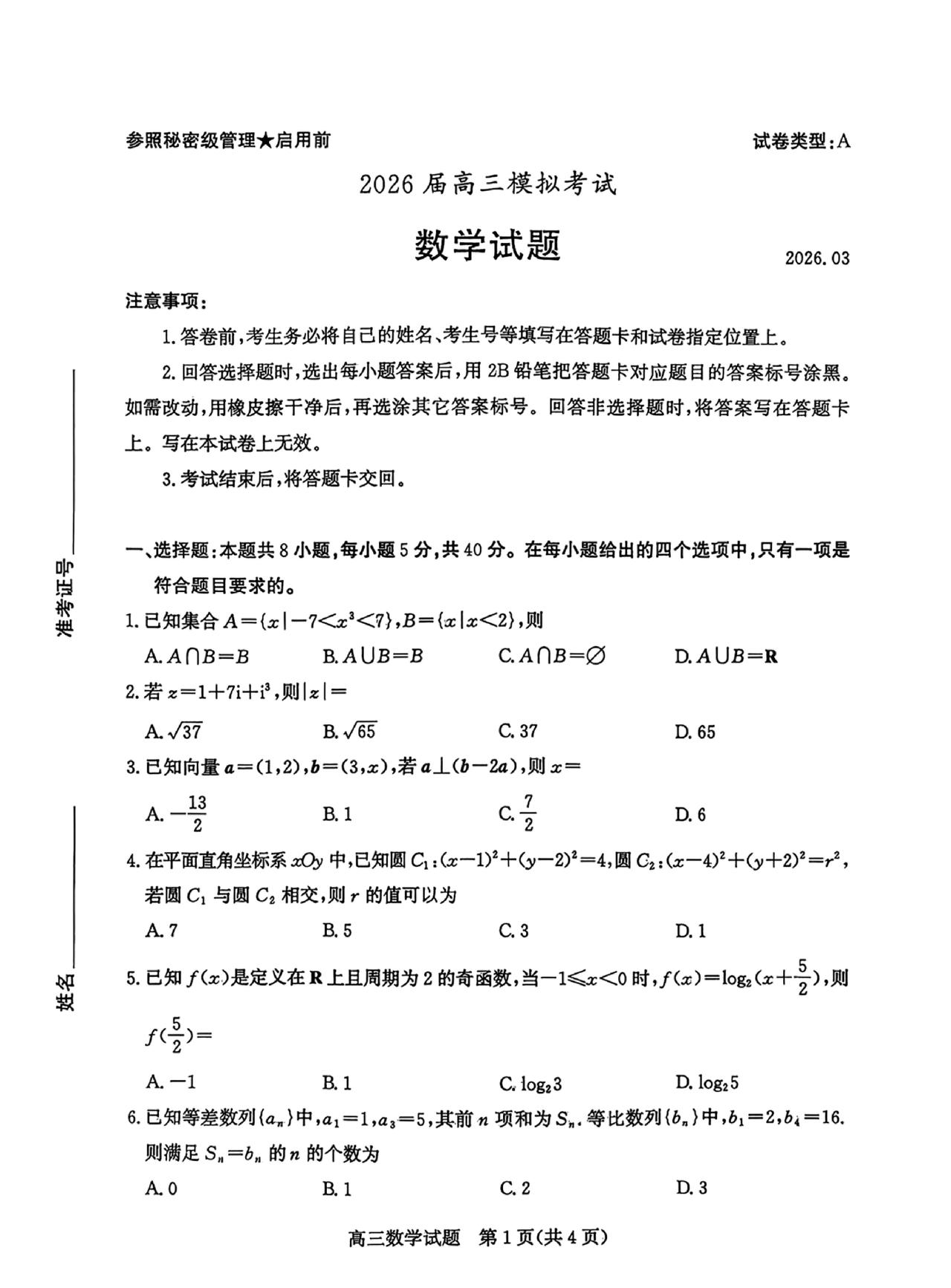 山东省2023级普通高中数学试题和山东省枣 庄 市2023级高三模拟考试数学试题