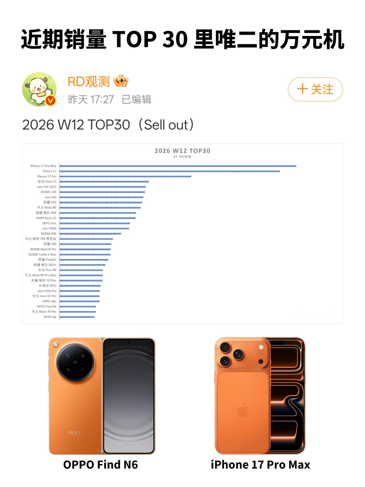 手持iPhone,还有必要买安卓折叠屏吗? 说实话,眼馋折叠屏好久了,用了这么多年苹果手机实在有点腻 但账号照片文件啥的都在iPhone上,也不想就这么全换了,所以就打算iPhone+安卓折叠屏双持,看了好多款之后,最后选择入了OPPO Find N6,体验有点出乎意料哦 用了好几天,我现在的用机模式已经很固定了,iPhone主要用来社交、录像,平常聊天就用苹果,账号也不用转来转去,要录像啥的苹果也比较好一点 Find N6主要是用它的大屏,看剧看视频真的很爽!而且办公体验也会好很多,看文档、表格视野大不少,还有AI手写笔的手写批注,分屏多应用也有全景自由派,方便太多了 而且Find N6感觉就跟嵌入苹果生态一样,Airpods能直接连,还能远程控制Mac,跟iPhone也能碰一碰互传文件,苹果用户用起来那是完全可以无缝切换的 整体感觉还是很香的,1w出头拿下16+1tb版本的,iPhone顶配也差不多这个价,买个折叠屏还是很香的嘛,考虑到后面内存还要涨价,现在买大内存更赚啊,而且看到近期的手机销量排行榜中,Top30机型里只有iPhone17 PM和Find N6,感觉自己没买错啊。