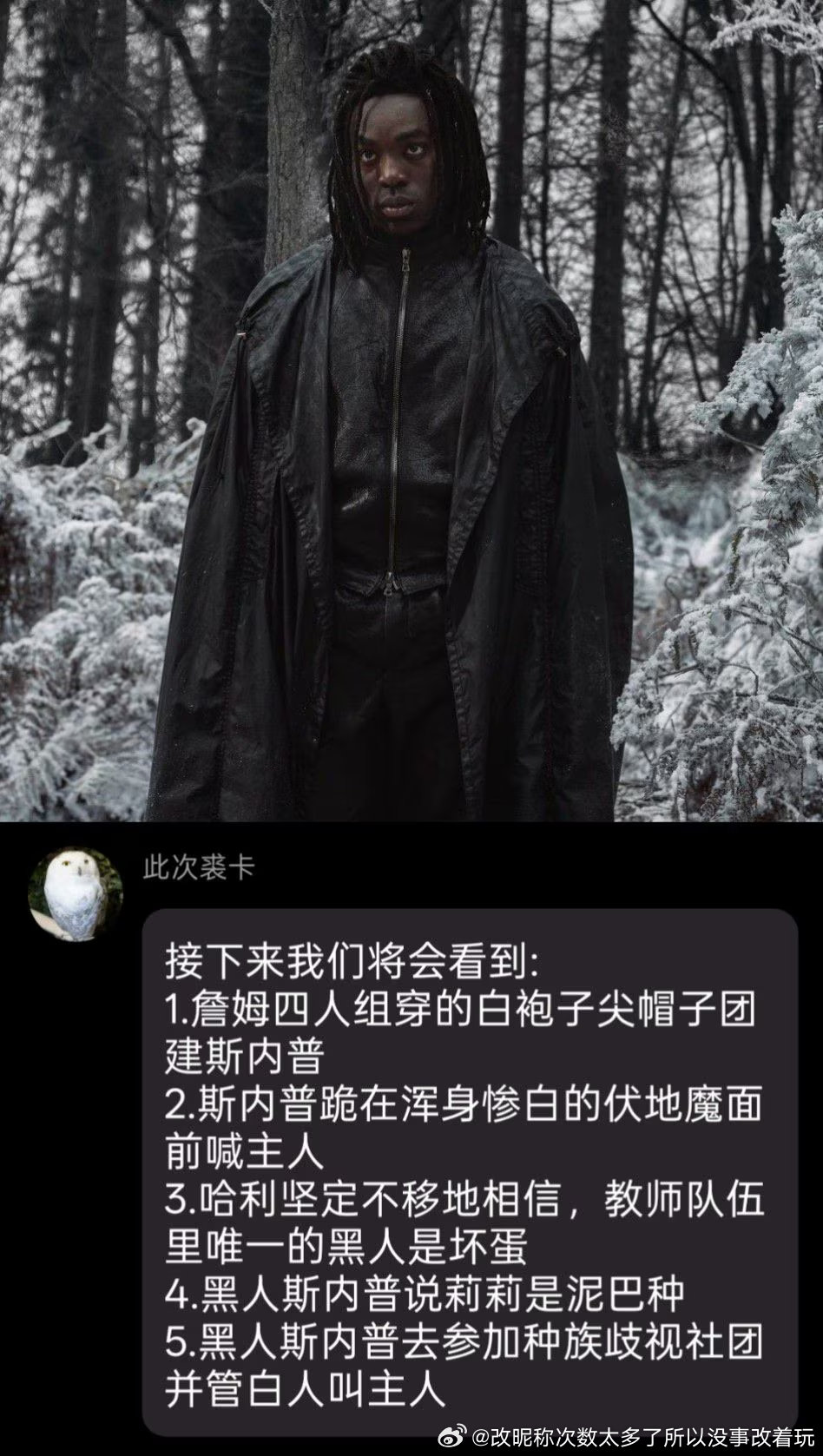 我晕看图1我还不信他们不敢不政治正确的,所以每次都故意挑丑丑的黑人演最不能让黑人演的角色,比如还有黑雪公主和小黑稠鱼,既迎合了政治正确又给大众营造黑人都丑的刻板印象黑人来演很烦的厌恶感,明明还是不少好看的黑人的——但是斯内普白雪公主这种好看的黑人也不行,明明还是有不少黑人能演的角色的,比如纳威和四人组的鼠还有斯普劳特这些二线教授等等,还有海格这种换个和蔼的黑人高胖大叔感觉毫不违和