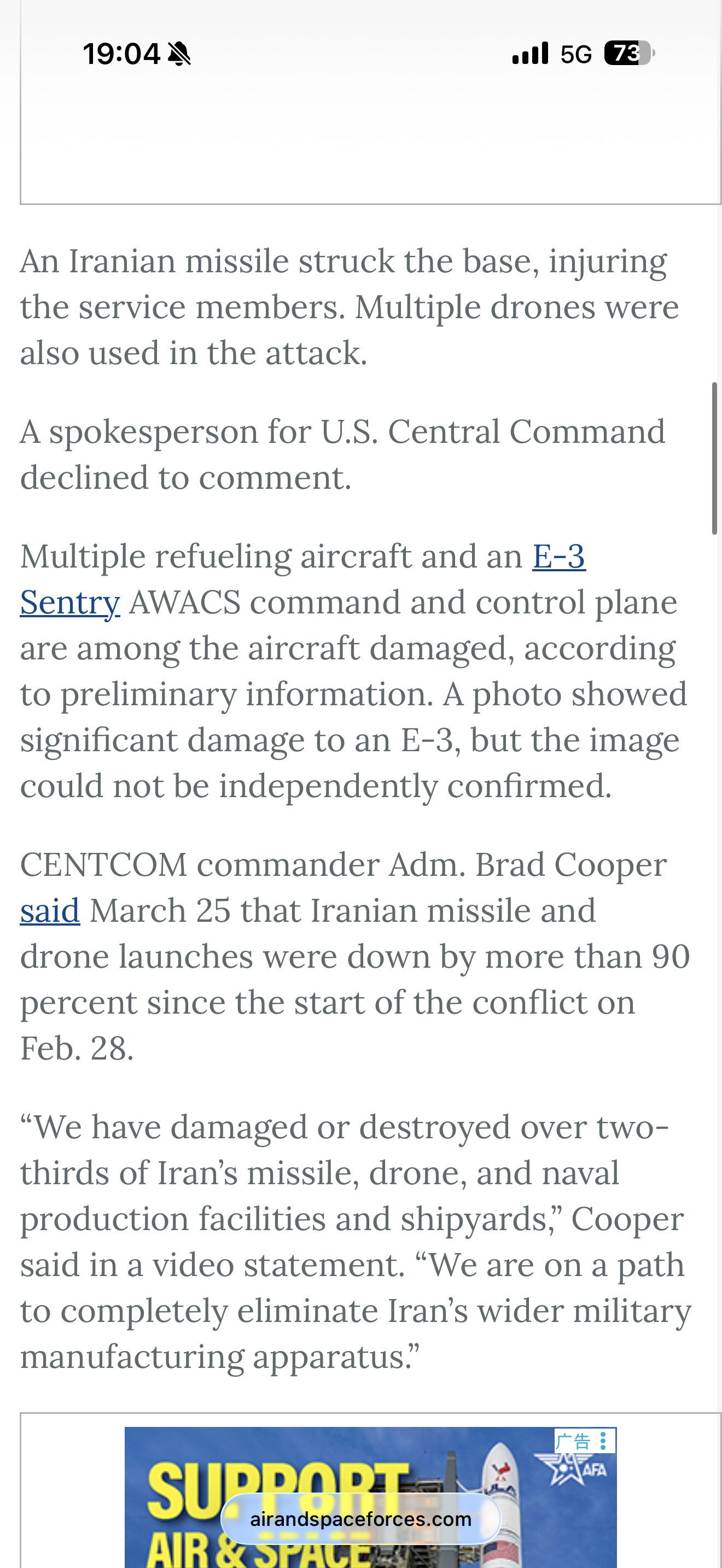 美国空军与太空部队杂志报道,3月27日伊朗对沙特苏丹王子空军基地的打击中,摧毁数架KC-135R加油机和1架E-3预警机。