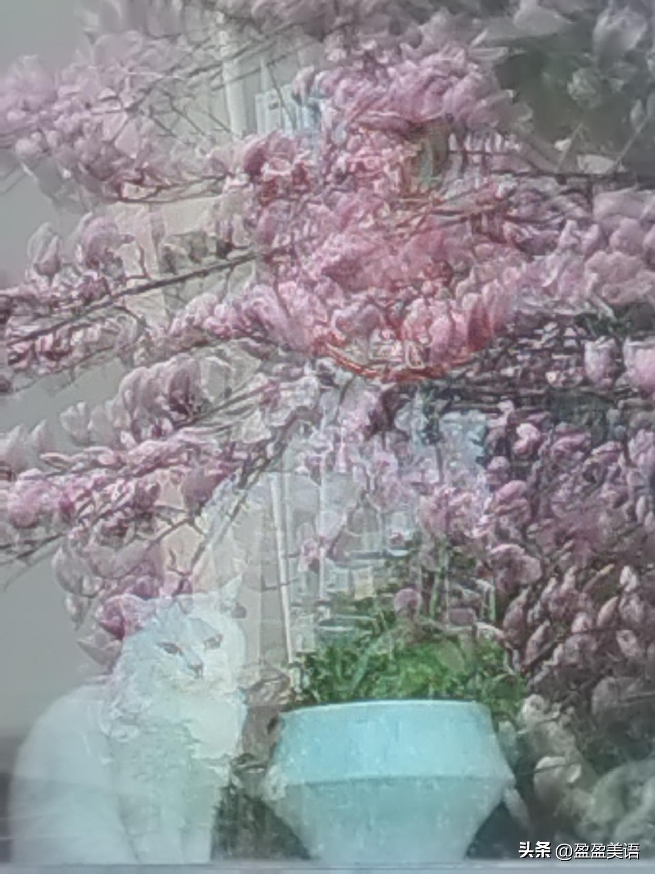 春天来了! 窗外的玉兰花,窗内的大白猫,蝴蝶兰,在窗子里荡呀荡……