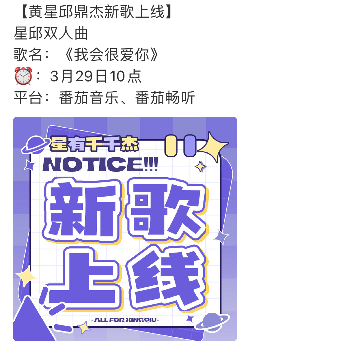 黄星邱鼎杰 我会很爱你 黄星、邱鼎杰双人歌曲《我会很爱你》即将上线⏰ 发布时间:3月29日 10:00