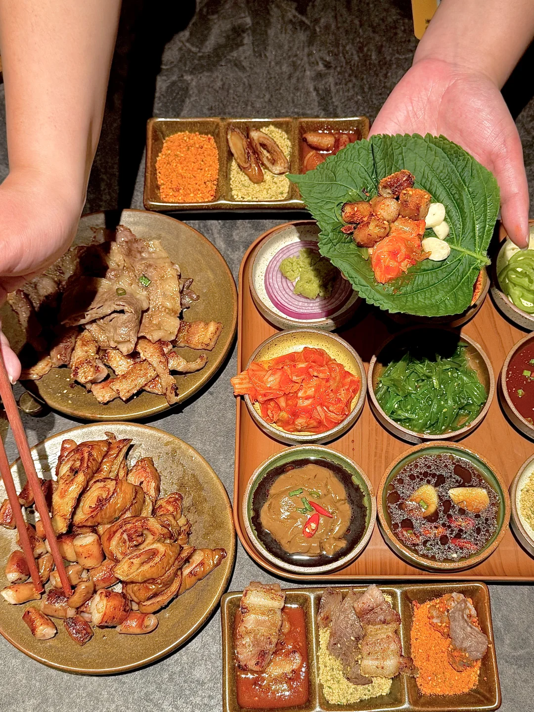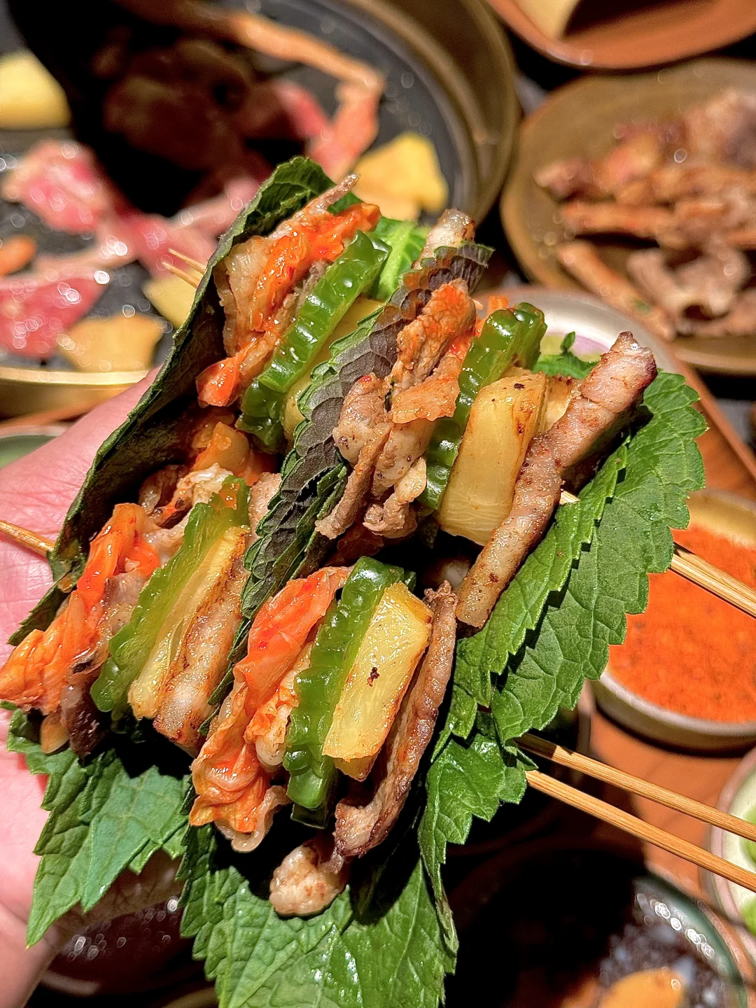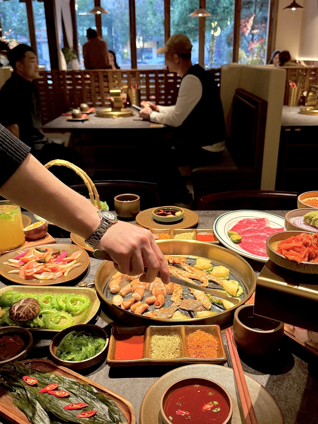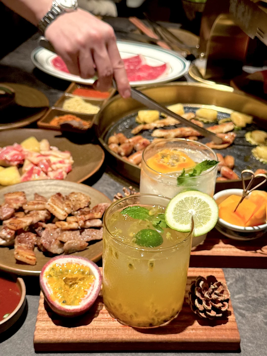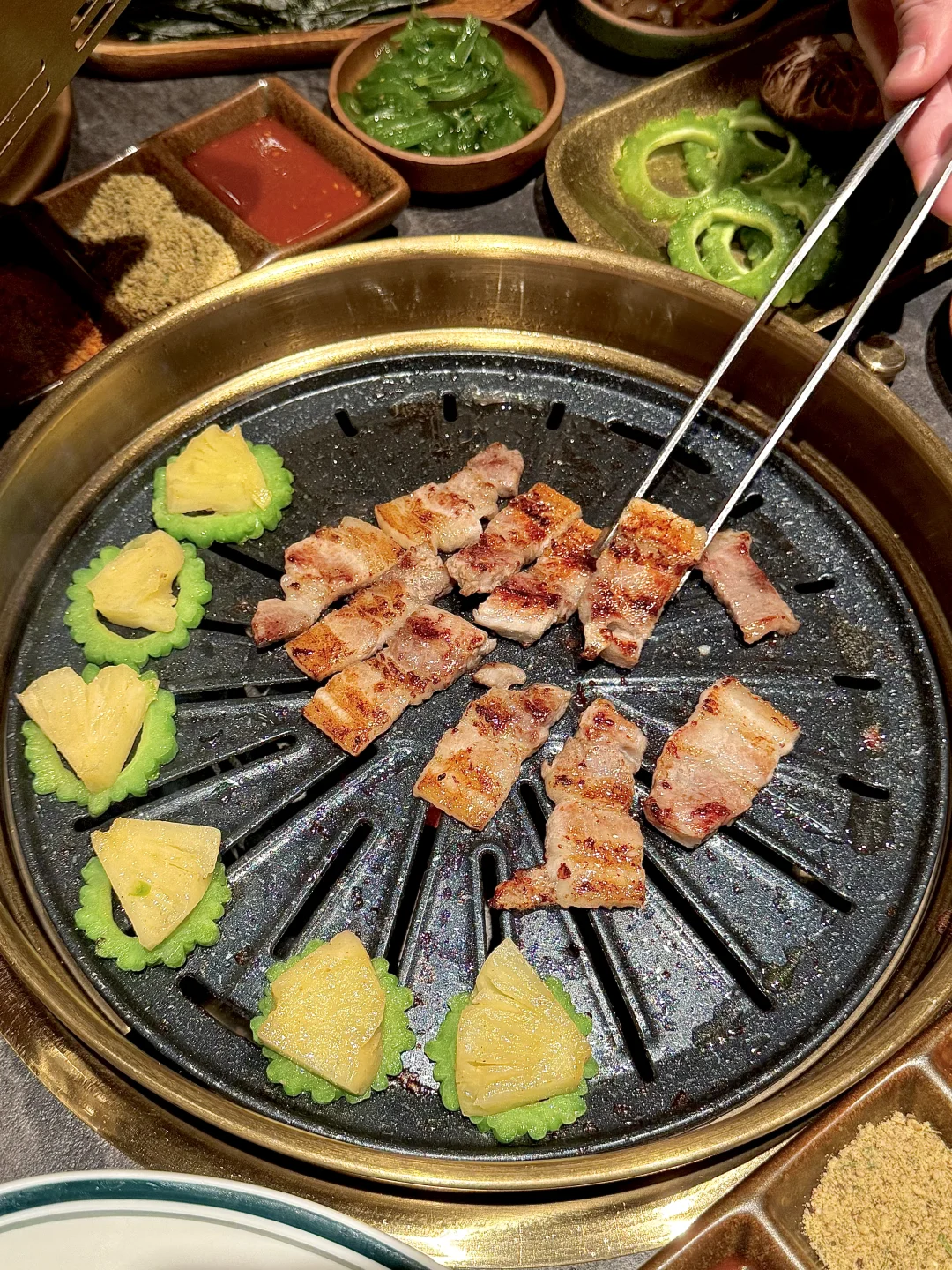 下班就想和朋友吃点热乎烤肉,这家东北烤肉环境舒服又轻松,很适合年轻人小聚。 点名夸烤小肠,大肠头,菠萝拌肉,松柏肉,已经成为我必点了 苏子叶里包上烤好的肉,苦瓜,菠萝+东北小料,入口感觉天都亮了ju吼次!! 和朋友酷酷一顿炫,新的饮品也很有心,清爽解腻 还有帮烤,氛围自在,和朋友边吃边聊好惬意呢,是会常来的宝藏小店……