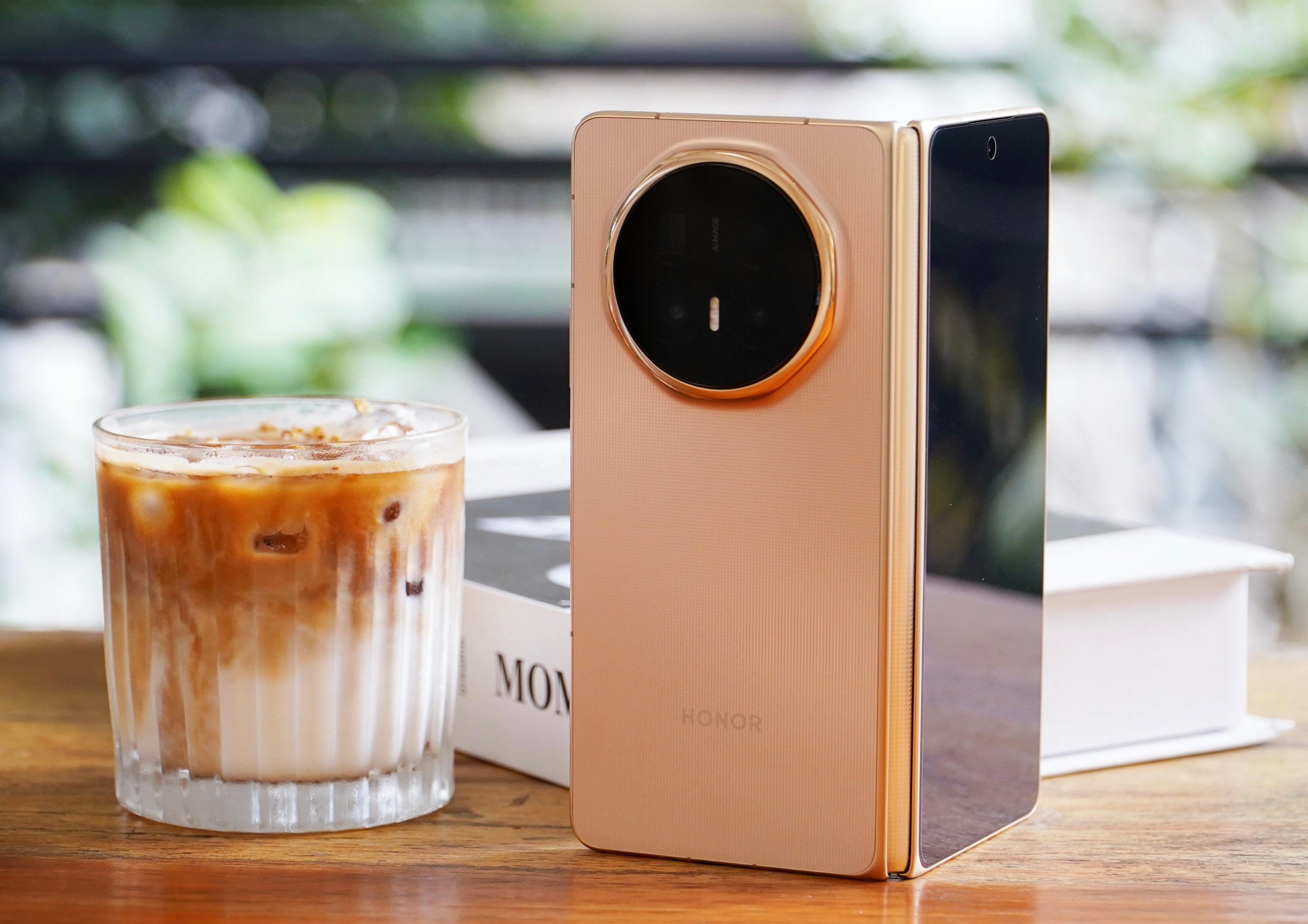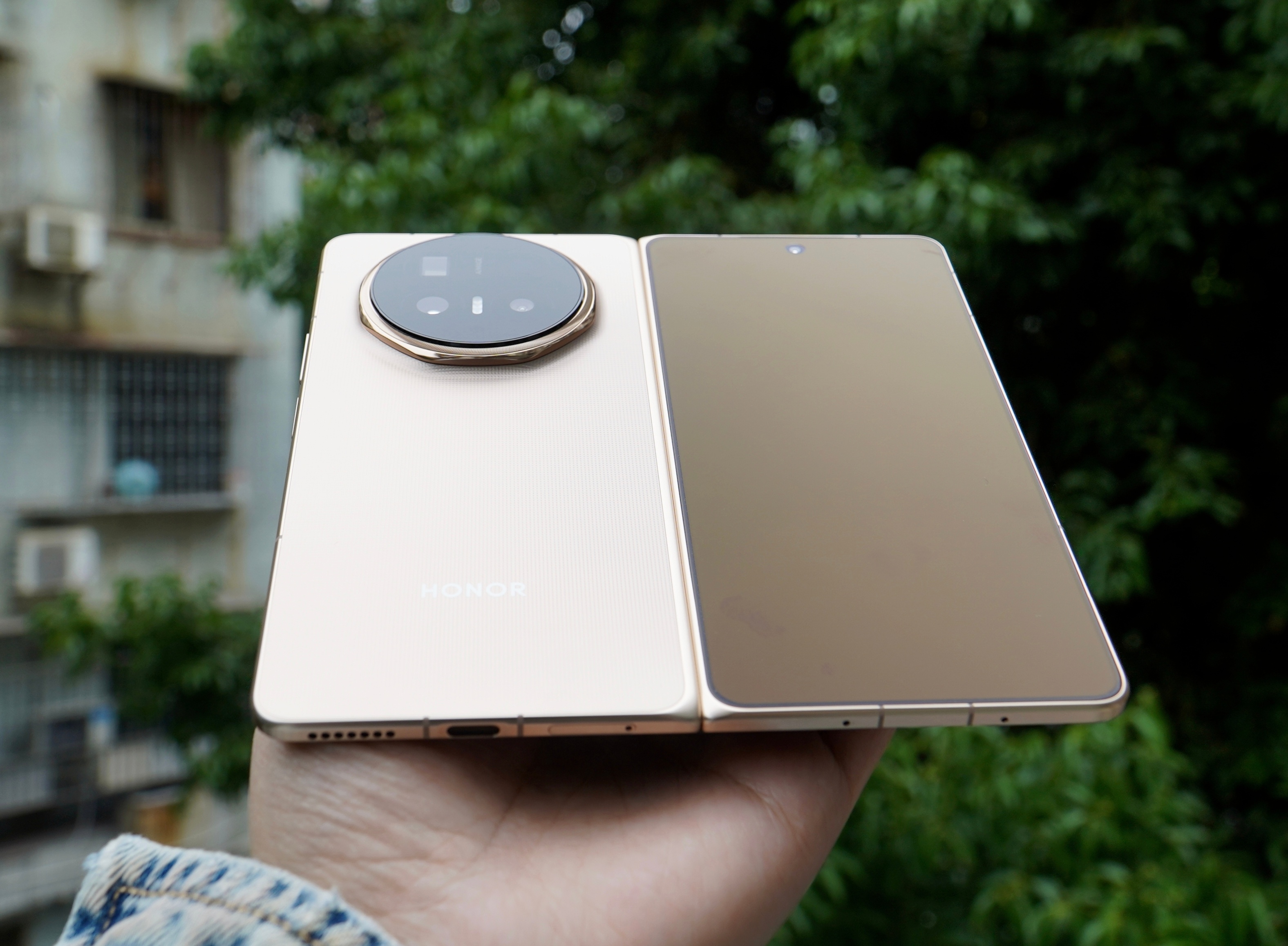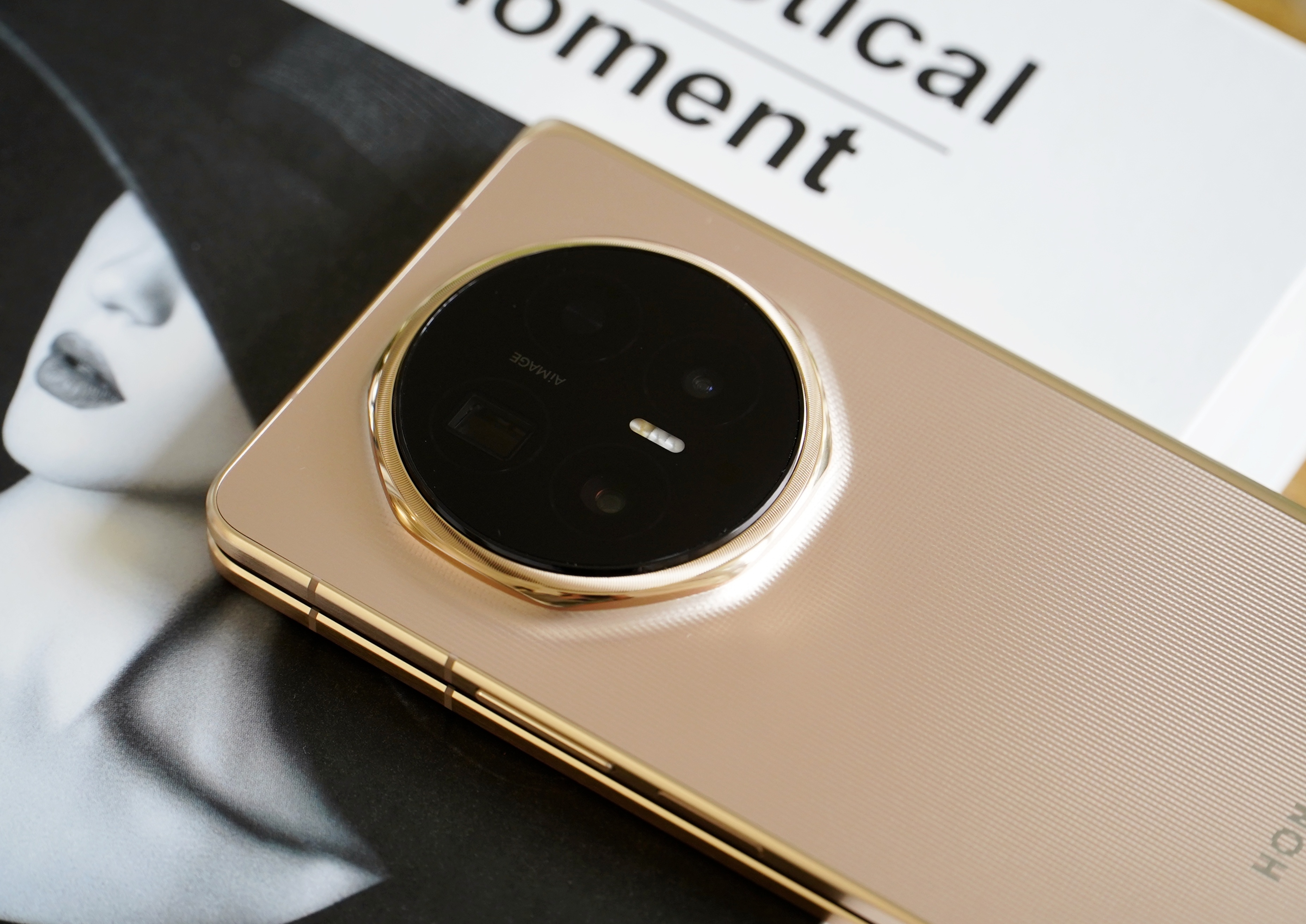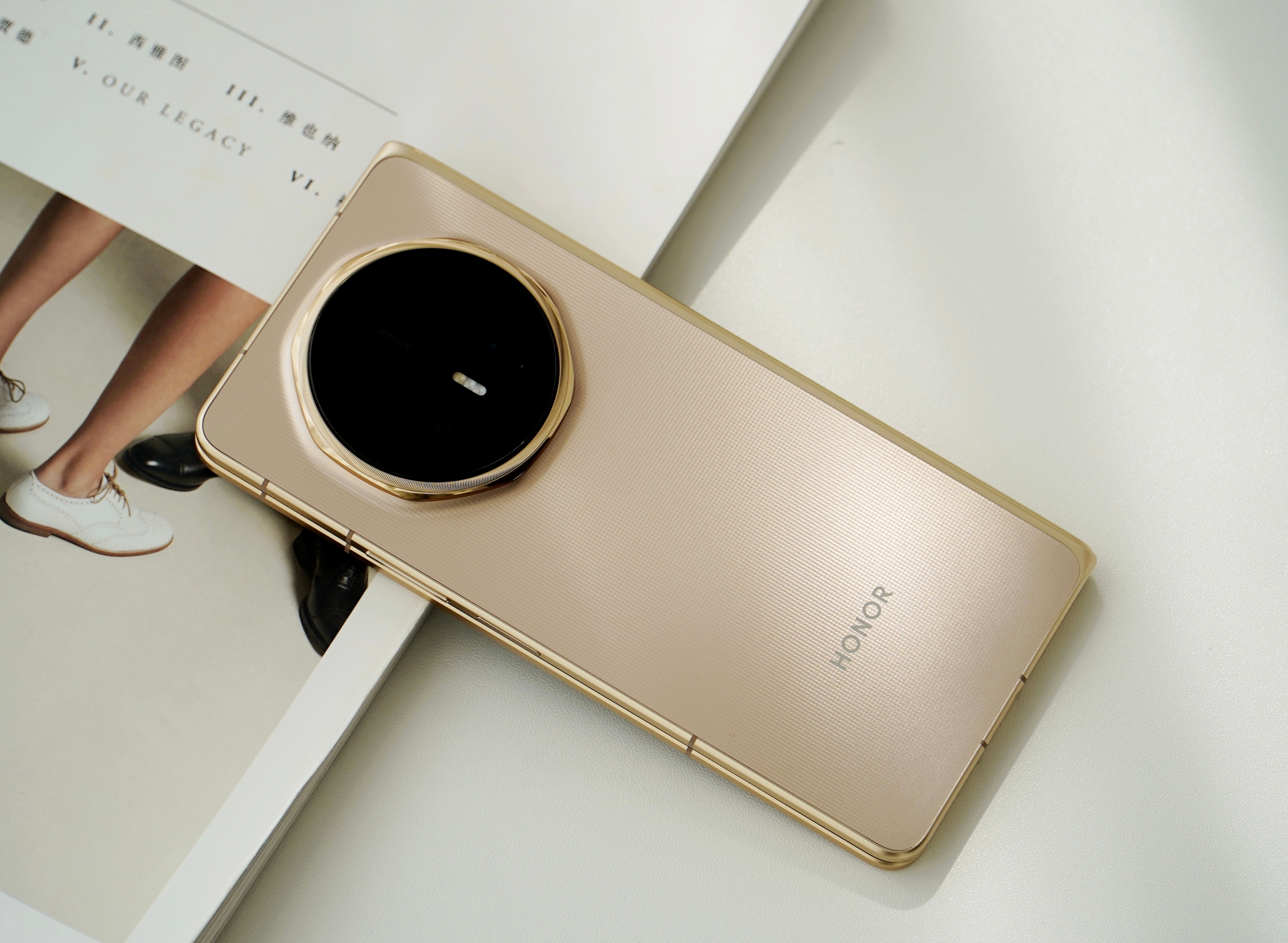 荣耀Magic V6旭日金真机上手图:真机的金色不是那种很艳丽的金色,而是有点香