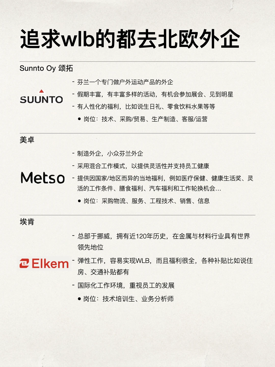如果你现在找工作的第一诉求是“别太累”,那北欧外企真的可以重点看看。整体风格就是不卷、不鼓励加班,工作生活平衡 很多公司都支持wlb,基本 955、双休,年假12-15天起,还有各种各样的关怀假期、弹性办公、远程这些也很常见,下班后也是真的没人找你 而且福利不是那种一次性的,而是长期型的,比如培训、健康保障、家庭友好政策这些。待久了会发现是真的很舒服 坚持日更✊🏻,对外企感兴趣的欢迎常来看看