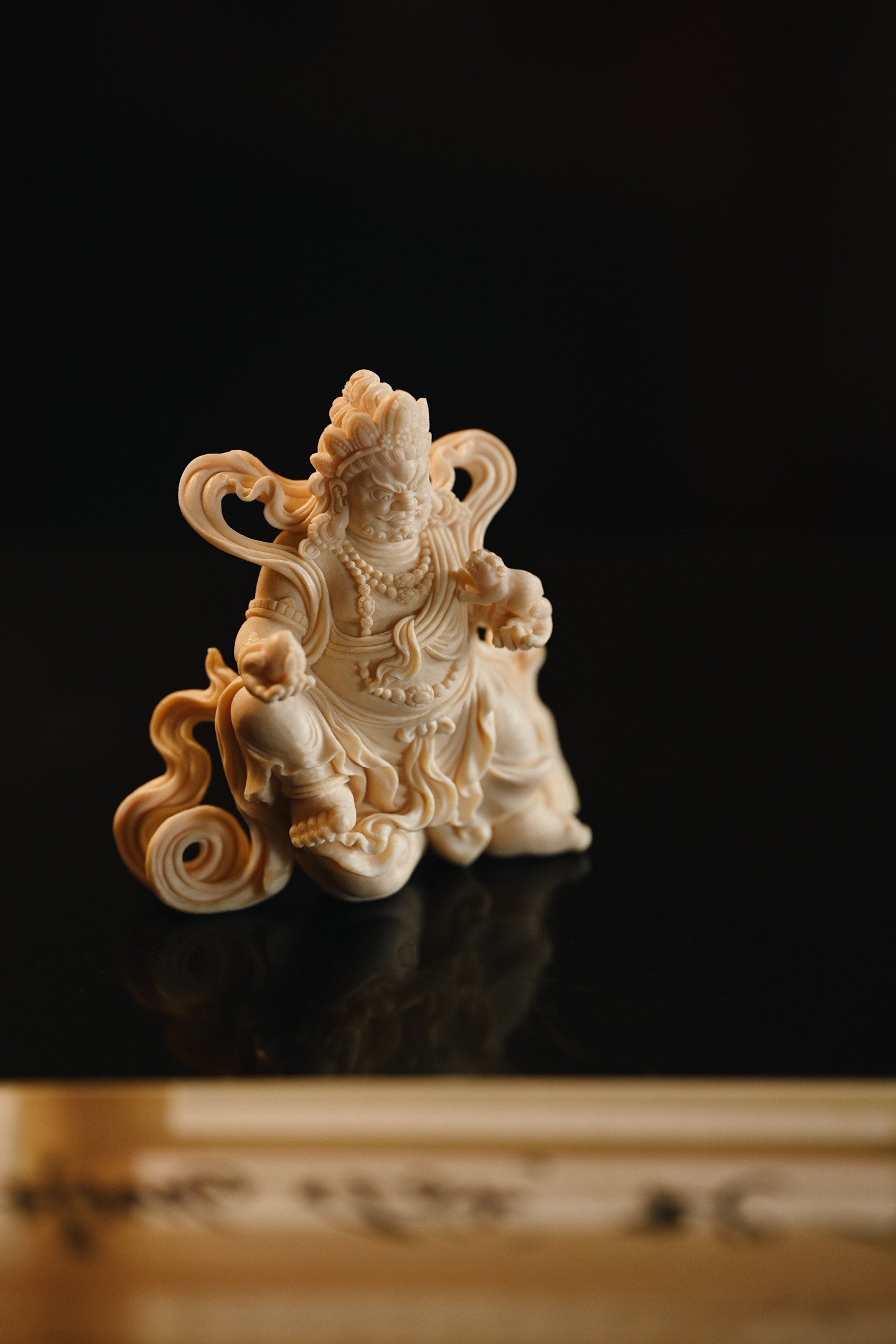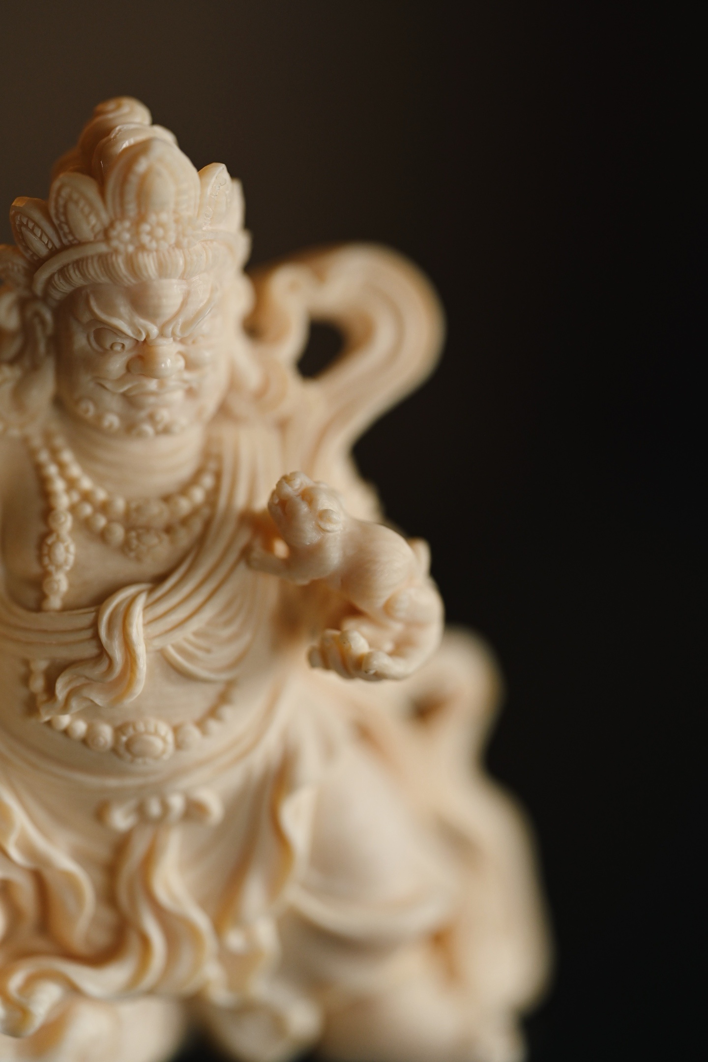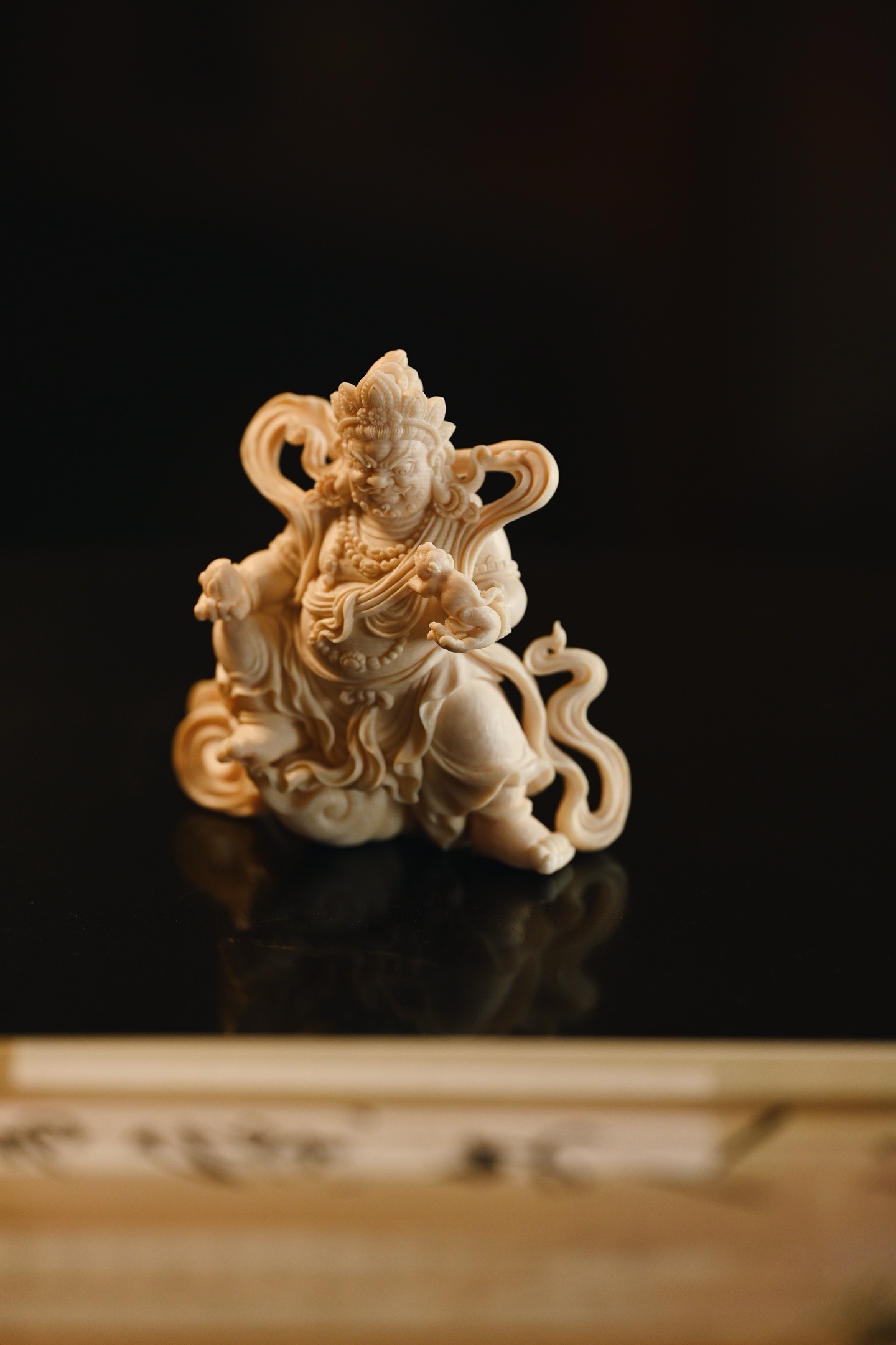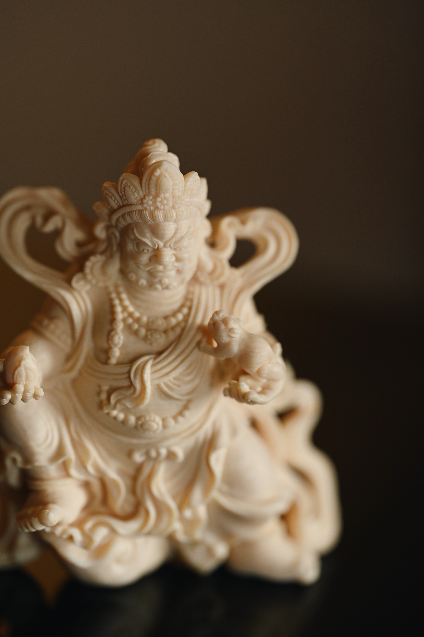 料质温润细腻,黄财神威严肃穆,怒目圆睁,眉骨高耸,宝冠层叠,璎珞遍身,左手托吐宝鼠,右手握摩尼宝,衣袂飘卷如云,足下祥云流转,尽显财神之威严与富贵气象。