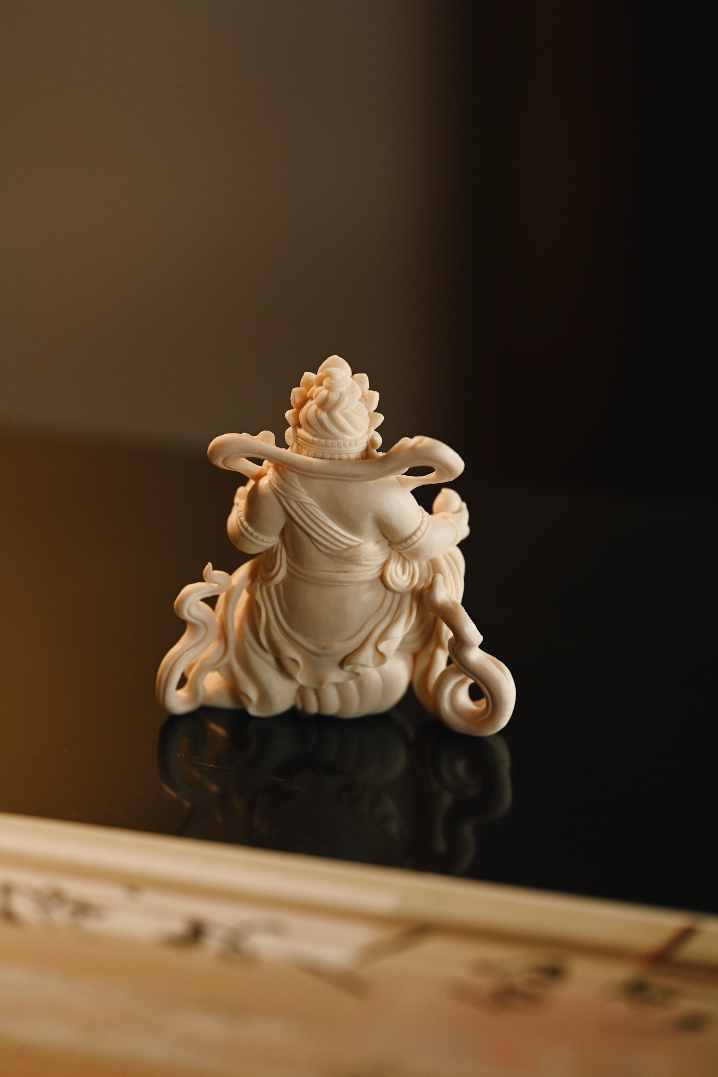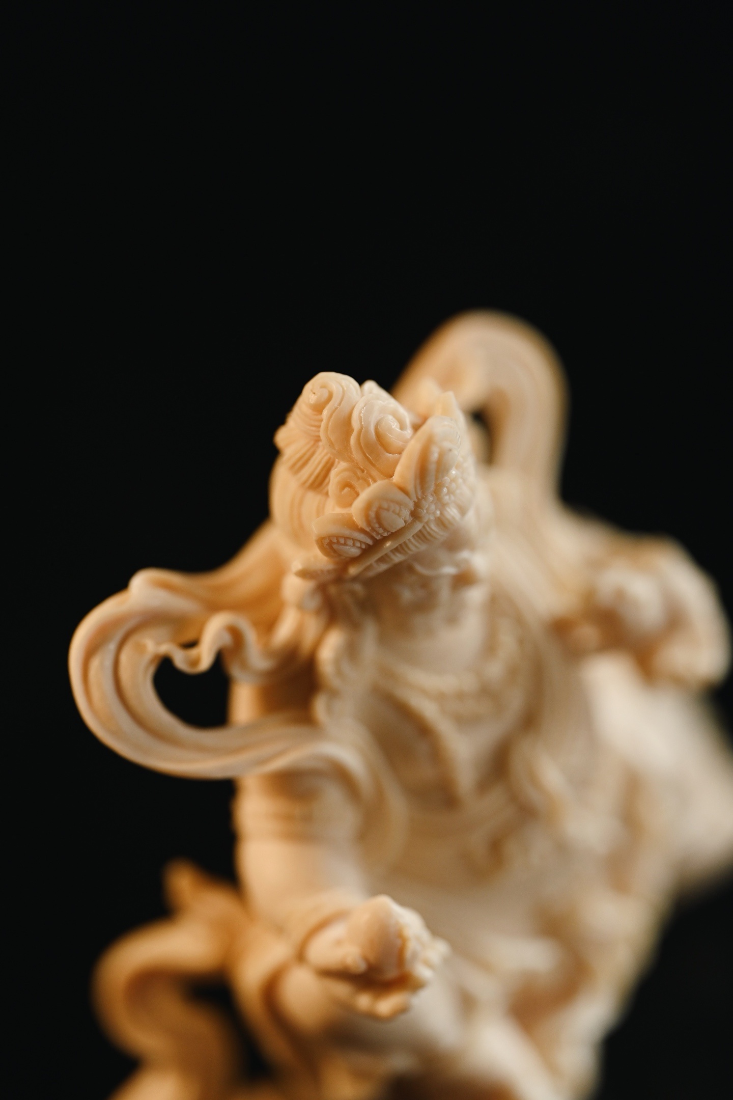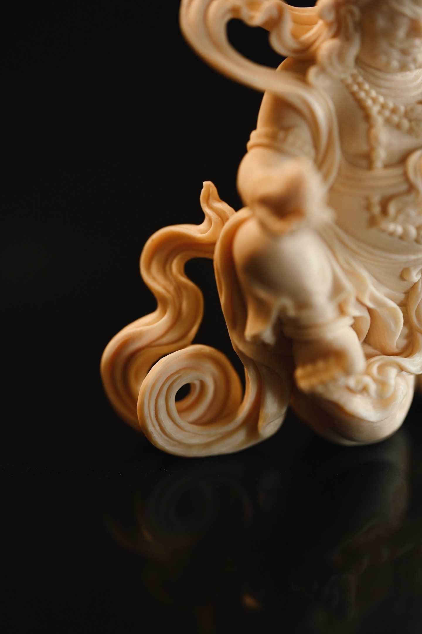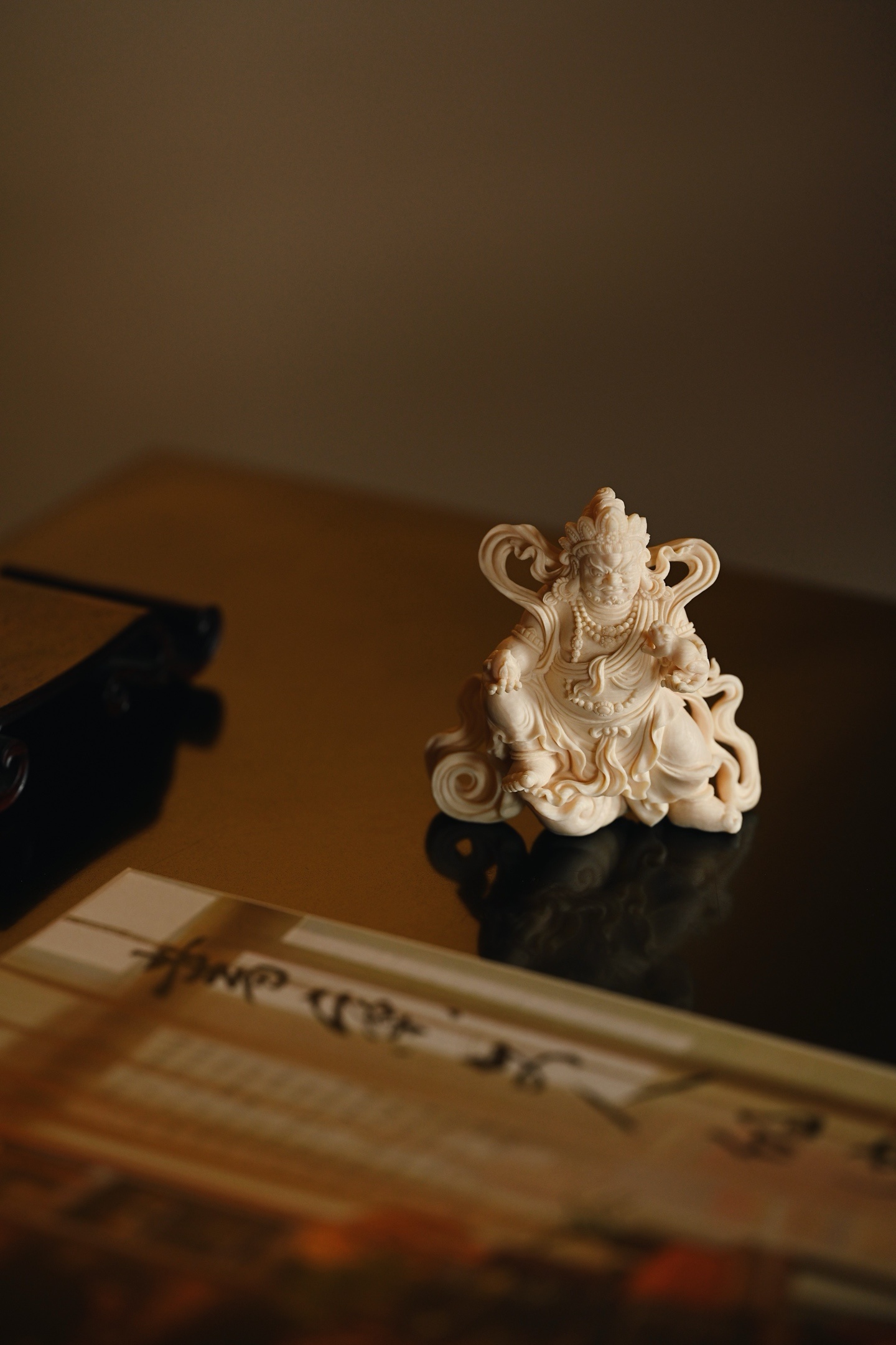 料质温润细腻,黄财神威严肃穆,怒目圆睁,眉骨高耸,宝冠层叠,璎珞遍身,左手托吐宝鼠,右手握摩尼宝,衣袂飘卷如云,足下祥云流转,尽显财神之威严与富贵气象。
