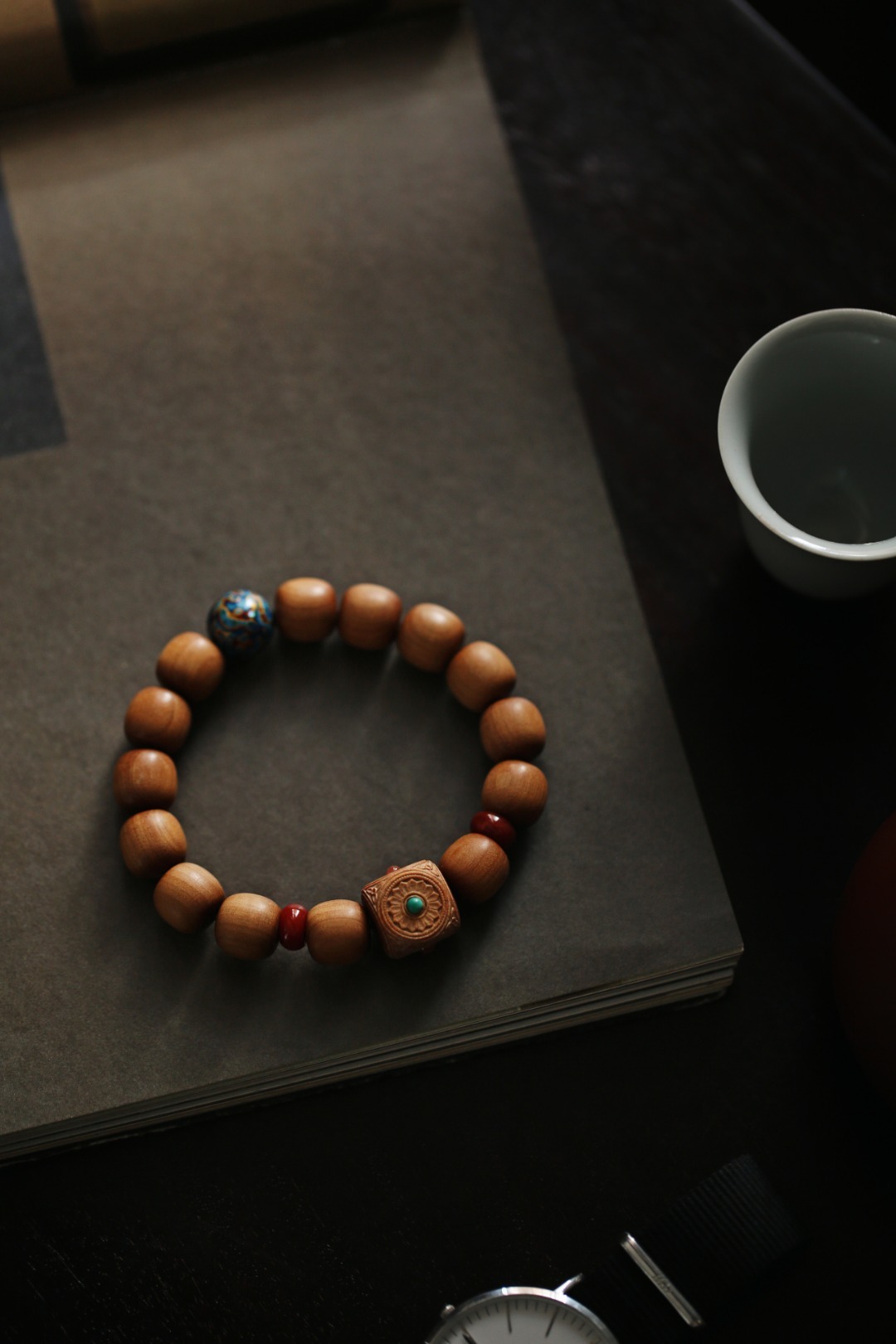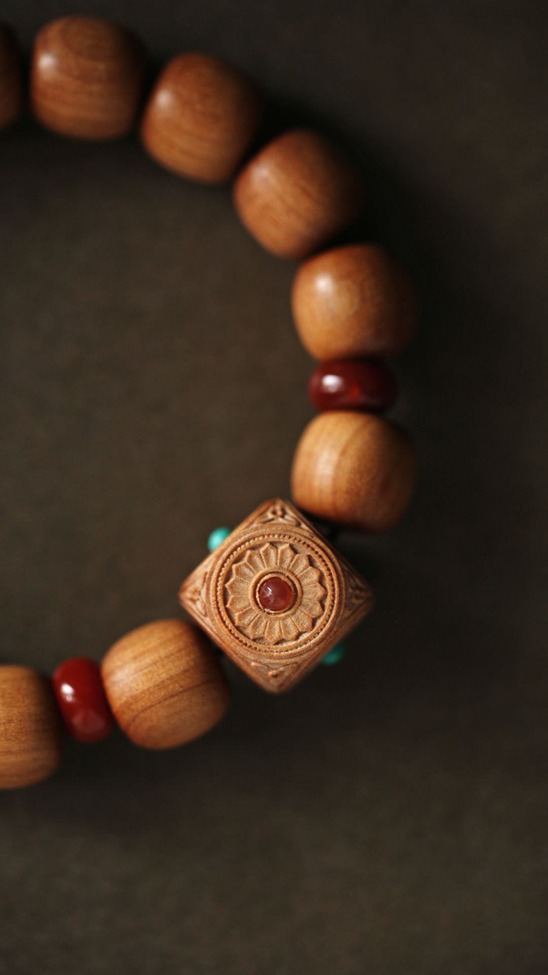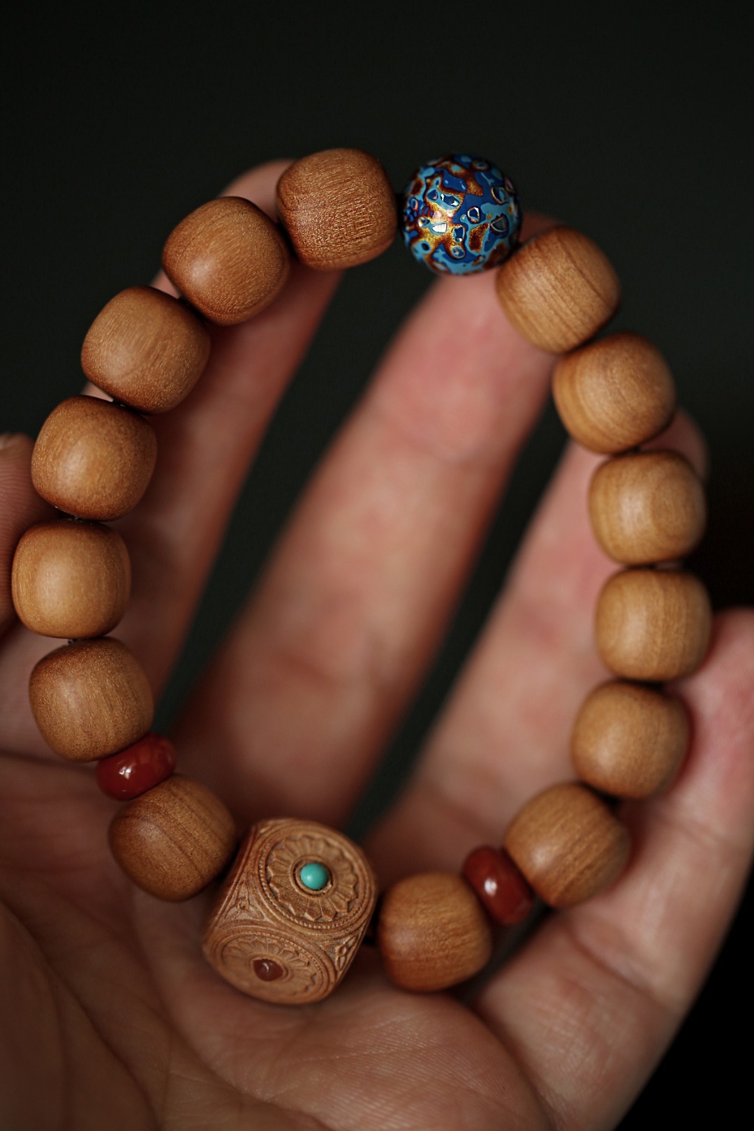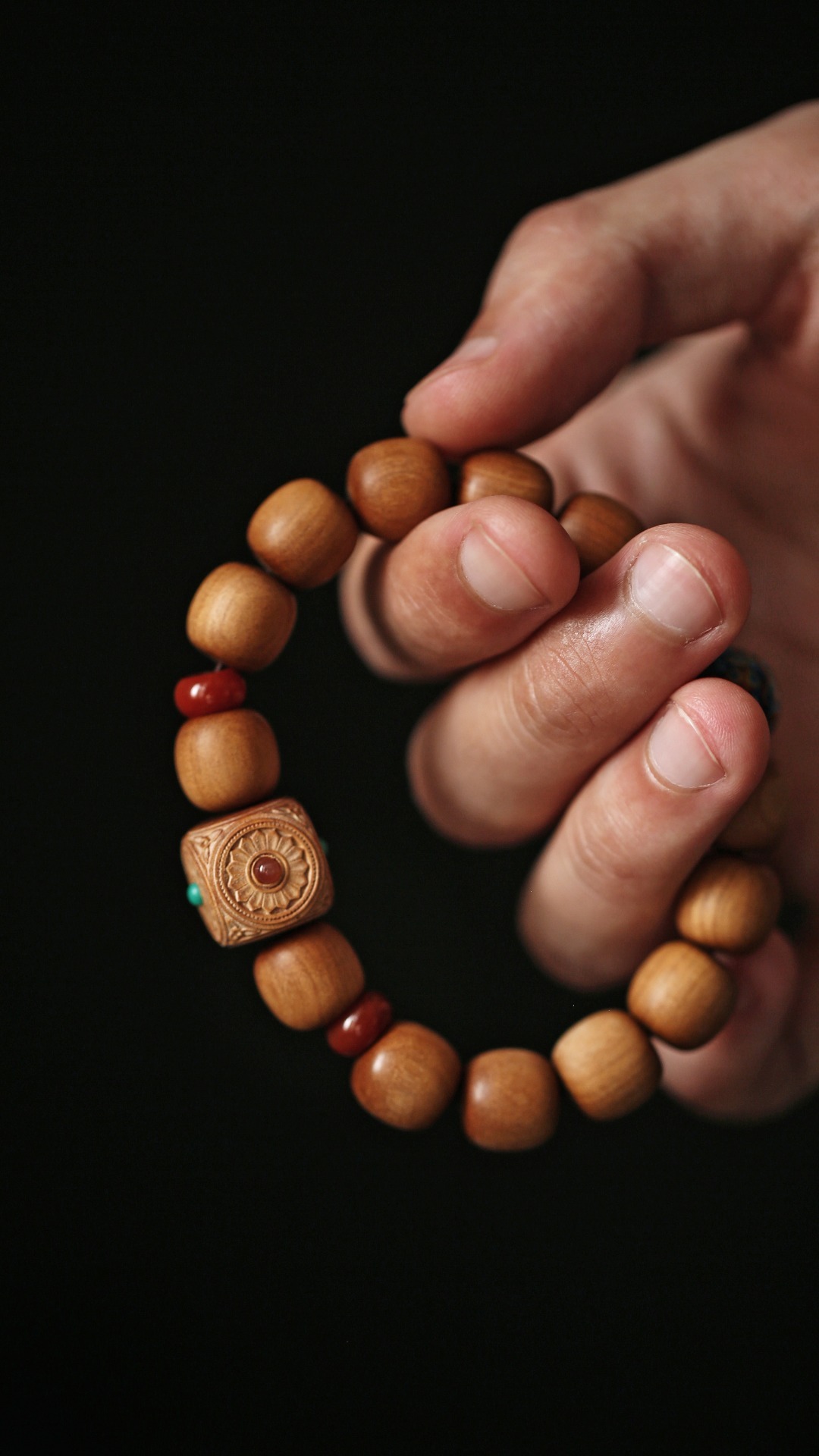 清新的配珠色调,点缀于珠串之间,增加了老山檀香端庄的气度,佩戴时高雅别致。