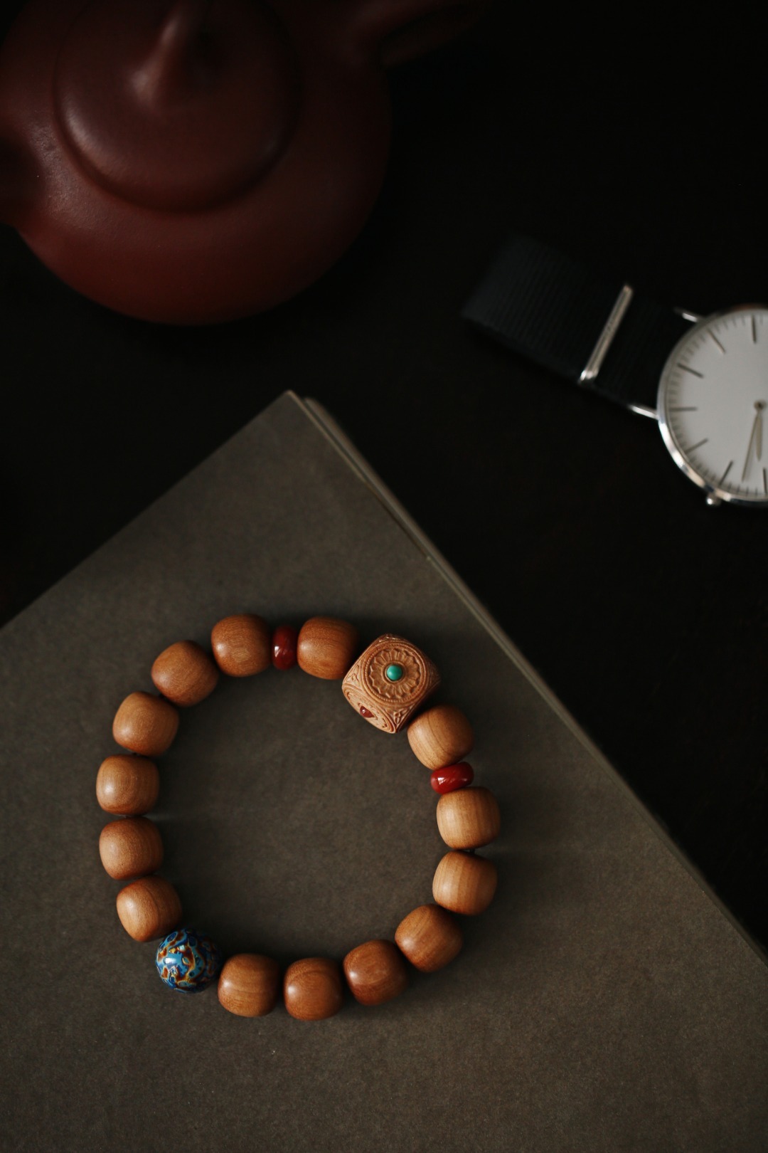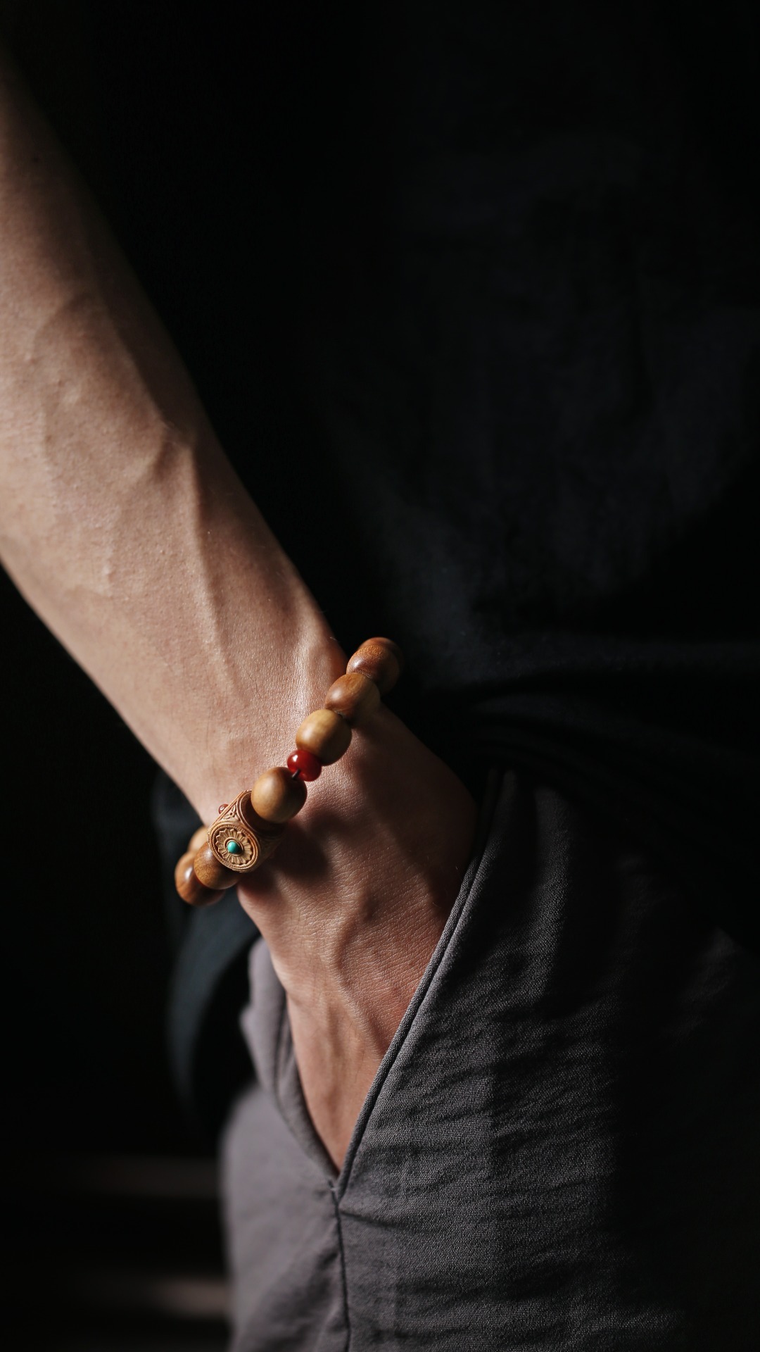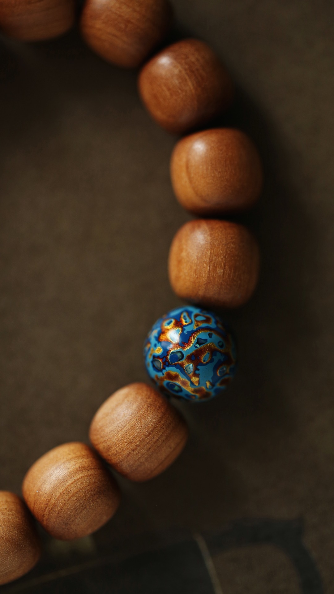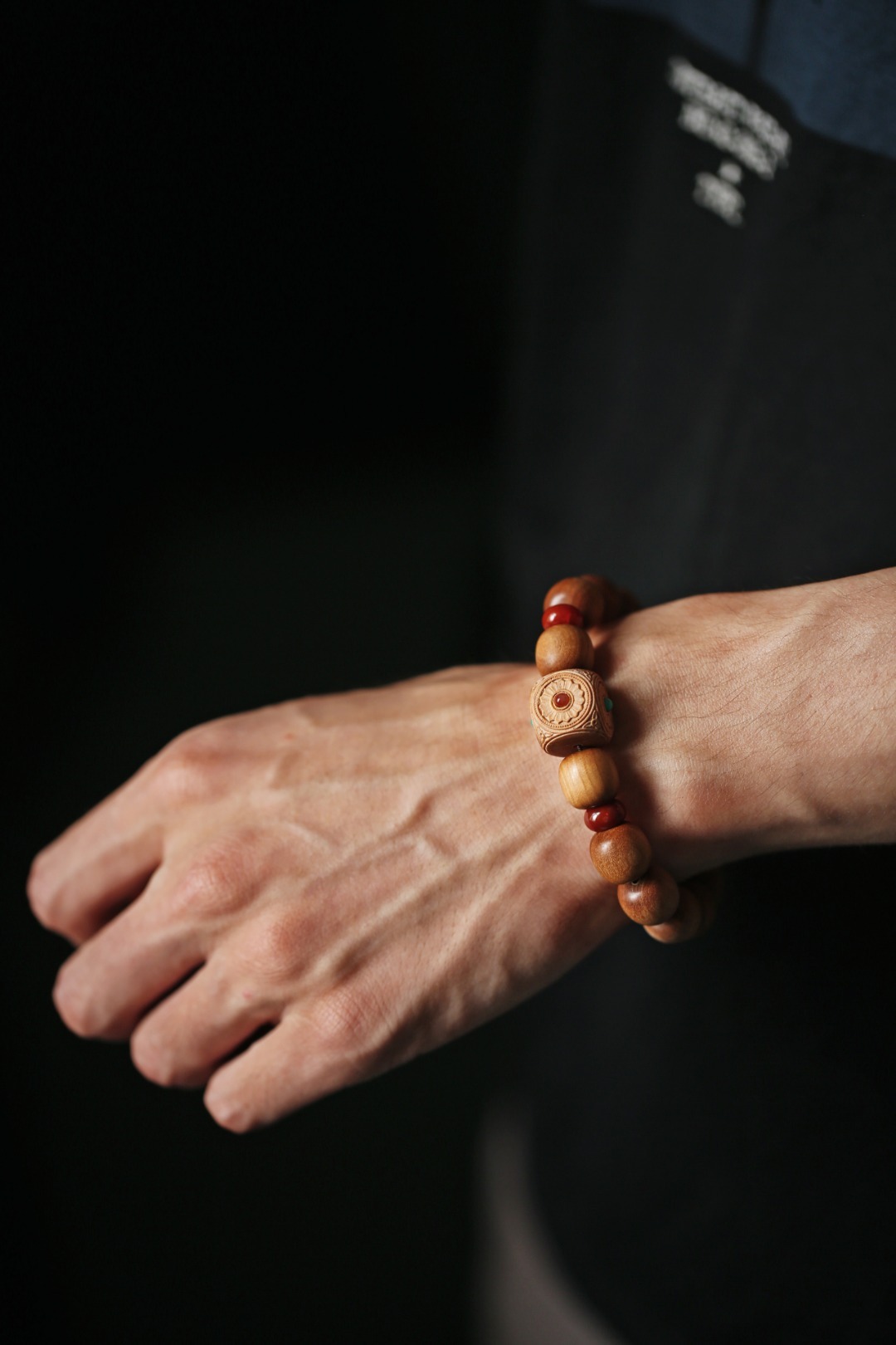 清新的配珠色调,点缀于珠串之间,增加了老山檀香端庄的气度,佩戴时高雅别致。