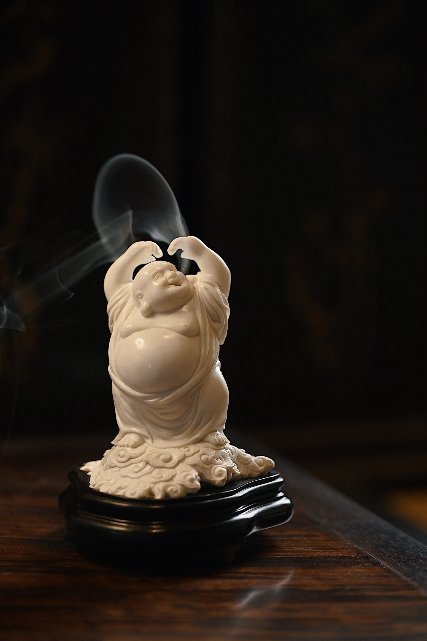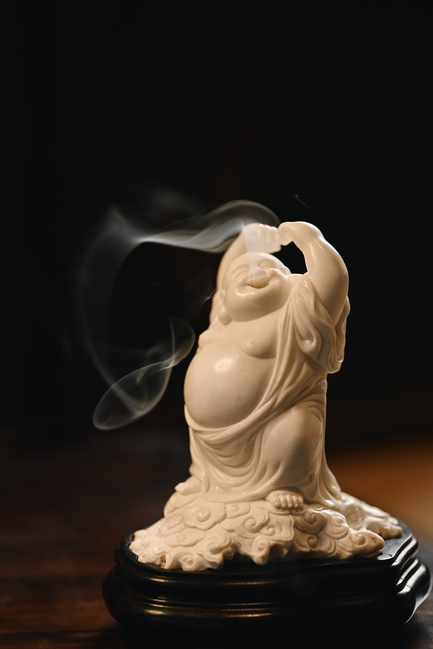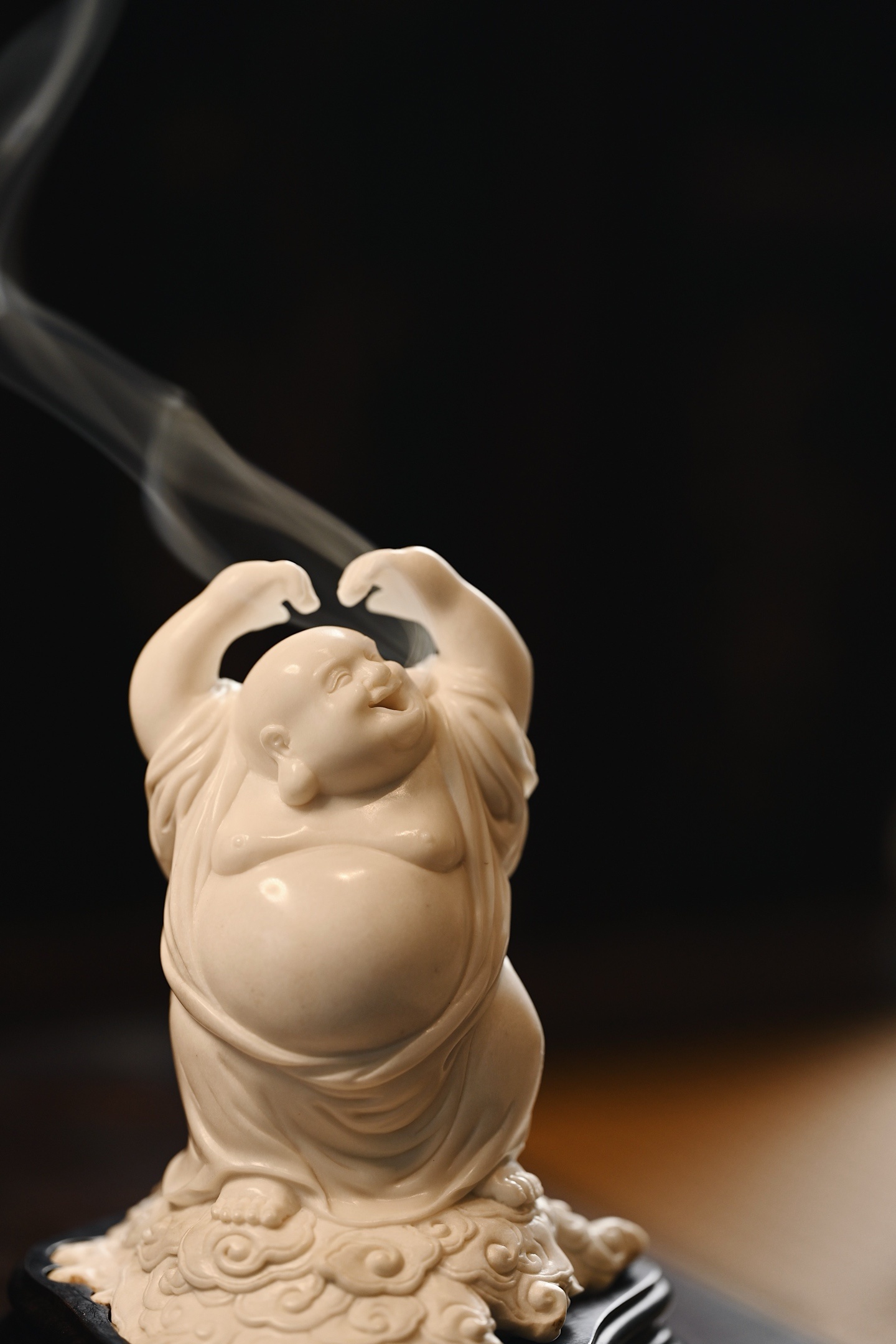 弥勒袒腹露怀,笑口大开,双臂高举比心,憨态可掬,尽显“大肚能容,笑对天下”之豁达意趣。祥云纹线条婉转流畅,烟气袅袅而出,趣意盎然。