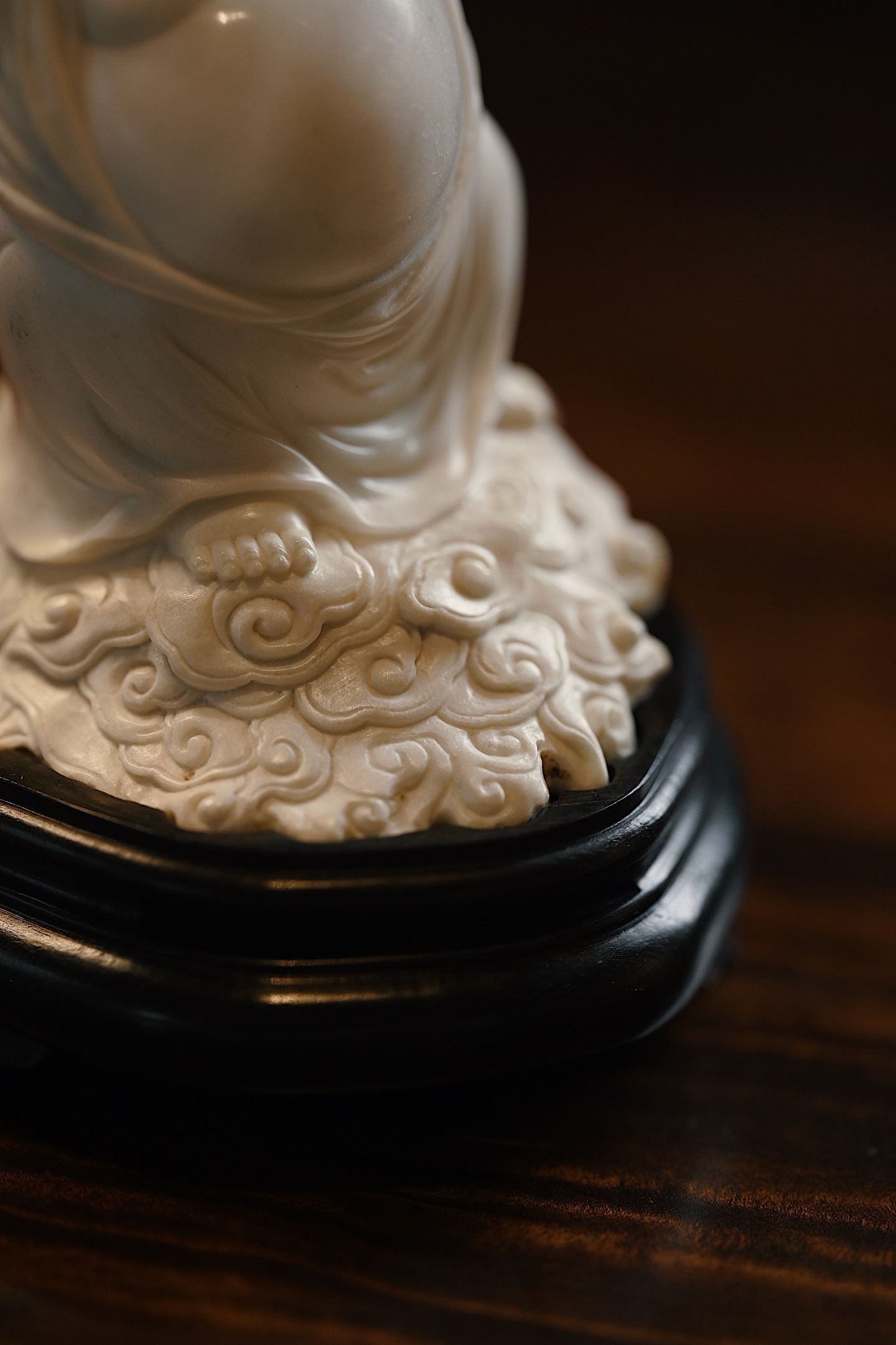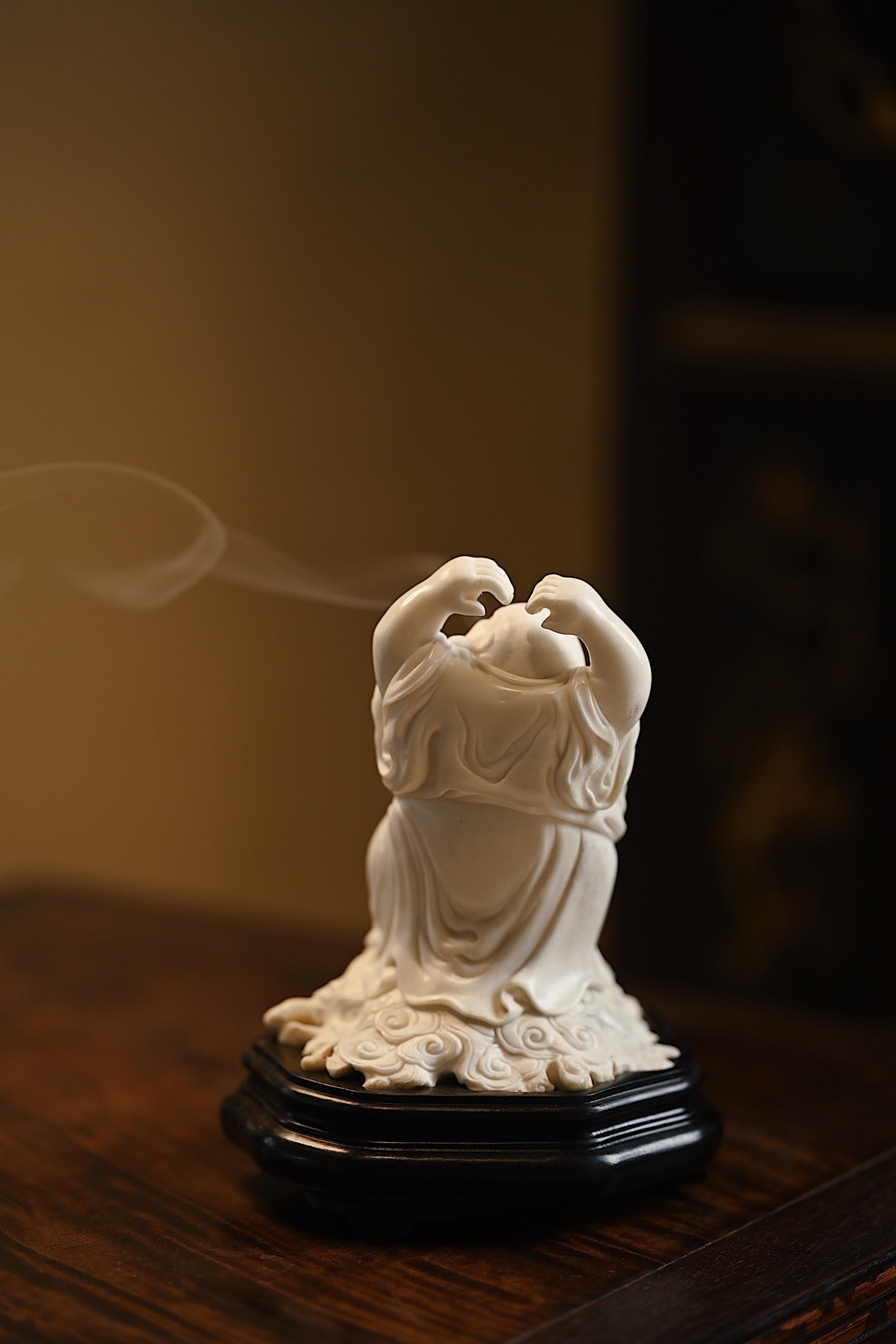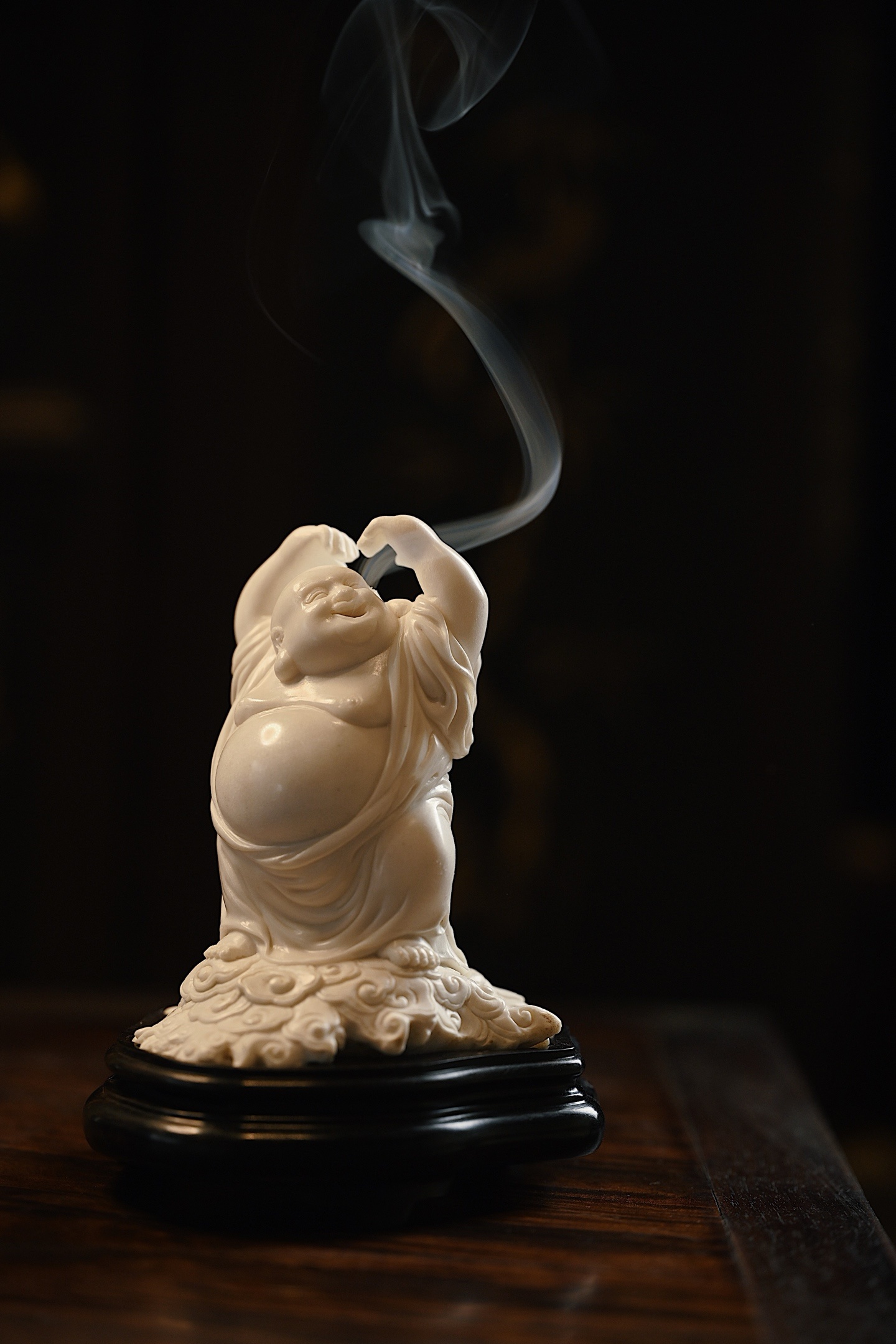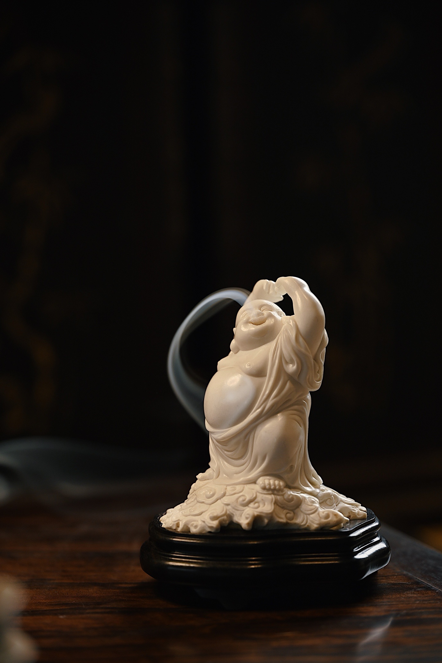 弥勒袒腹露怀,笑口大开,双臂高举比心,憨态可掬,尽显“大肚能容,笑对天下”之豁达意趣。祥云纹线条婉转流畅,烟气袅袅而出,趣意盎然。