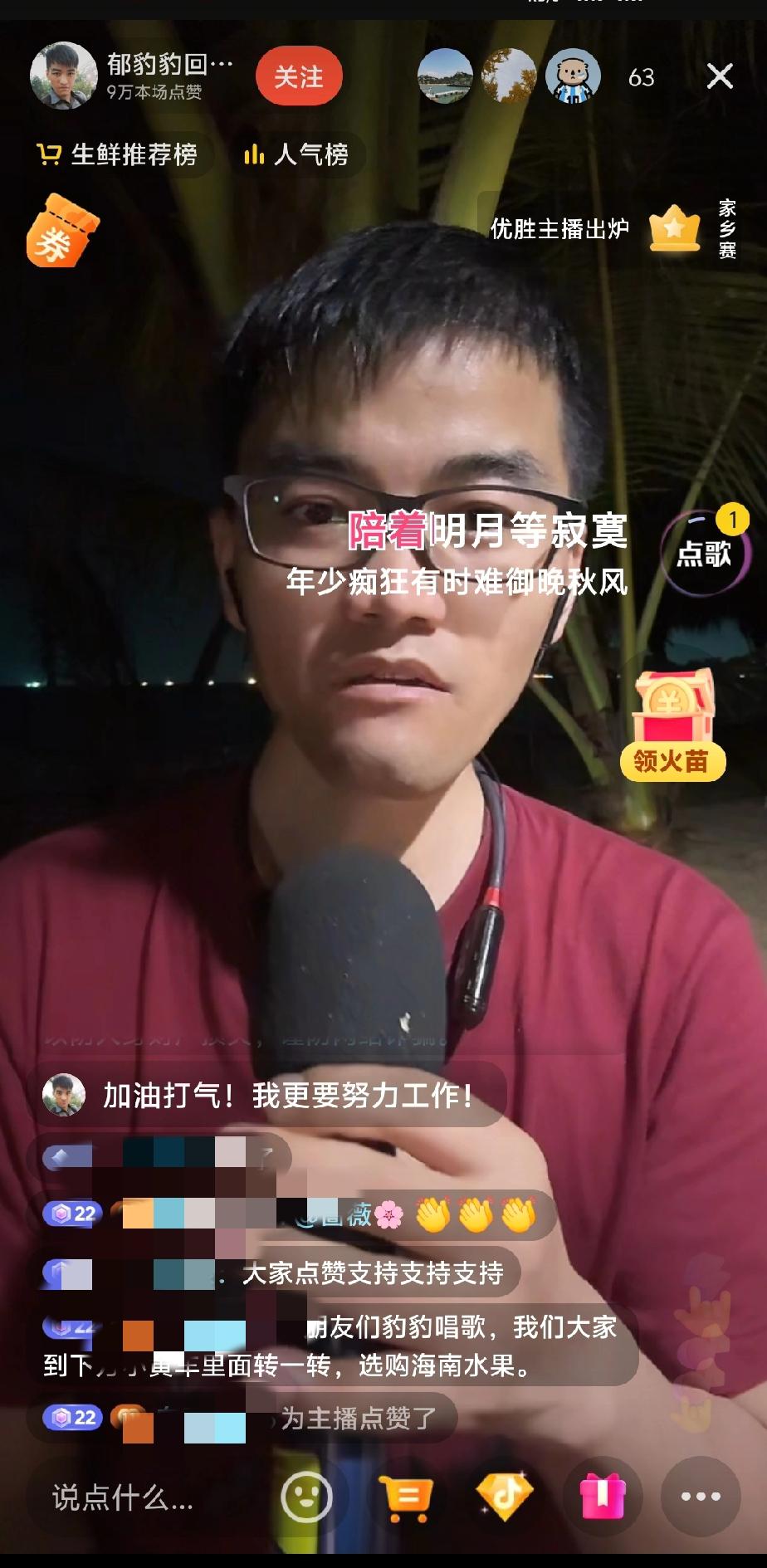 郁豹豹在海南带货当季水果的大直播间里,手持麦克风唱起了比较伤感的歌曲。他祝福自己终于迈出家门,开启新的人生旅程,还表示自己要加油,更加努力地工作,改变现有的生活状况。他的铁粉都特别支持他。 然而,他的账号似乎被限流,直播间人气不太旺。但希望他能被更多好心人看到,喜欢他的可以支持他一单。祝福他前程似锦,好人有好报!