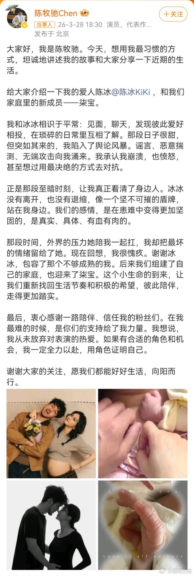 陈牧驰陈冰结婚生子28日演员官宣与歌手结婚生子,两人的孩子名叫“柒宝”,陈牧驰称她和陈冰相识于平常,在自己陷入舆论风暴的时候是陈冰陪在他身边,陪伴他一起扛外界的压力。