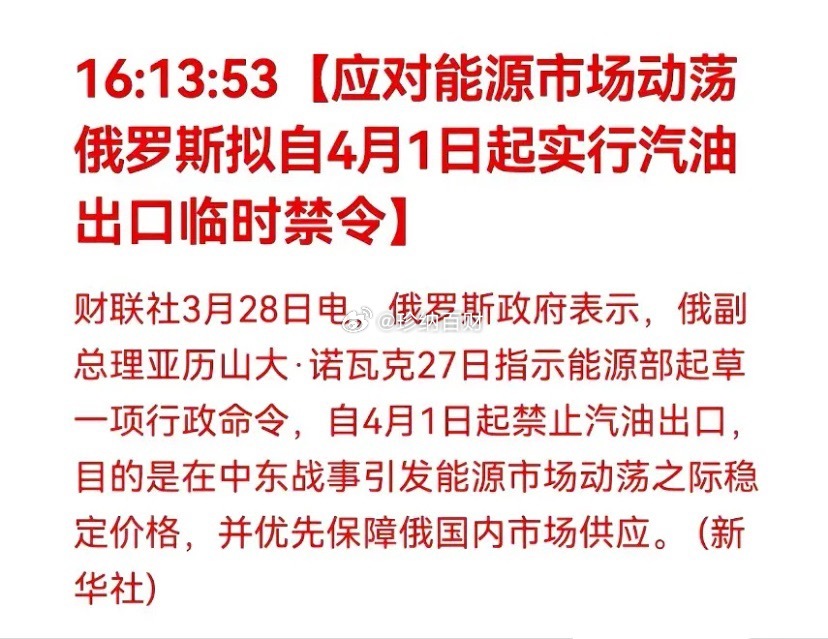 俄罗斯4月1日起禁止汽油出口4月1日起,俄罗斯突然“断供”,全球油价又要变天?全球能源市场,又起波澜!当地时间3月27日,俄罗斯政府宣布,将从4月1日起全面禁止汽油出口!作为全球能源巨头,俄罗斯这一“自断财路”的举动,瞬间引爆市场。这背后,发生了什么?表面上,是为了稳定国内物价;但深层原因,是内外交困下的无奈之举。一方面,中东持续冲突导致国际油价飙升至100美元以上,巨大的价差诱惑着每一滴汽油流向海外。另一方面,乌克兰的持续打击,让俄罗斯炼油厂和出口港口频频“受伤”,产能大减,出口通道受阻。更关键的是,4月是俄罗斯的春耕大忙季节,农机用油是粮食安全的命脉。业内专家预判,与其冒着国内供应短缺、物价飞涨的风险去赚取可能昙花一现的外汇,不如先稳住国内基本盘。这并非俄罗斯首次采取此类措施,但每一次都牵动着全球市场的神经!在全球能源供应链本就脆弱的当下,俄罗斯的“断供”无疑会加剧供应紧张的预期,为高企的国际油价再添一把火。油价又要上涨,你看好哪些投资机会?投资股票中东