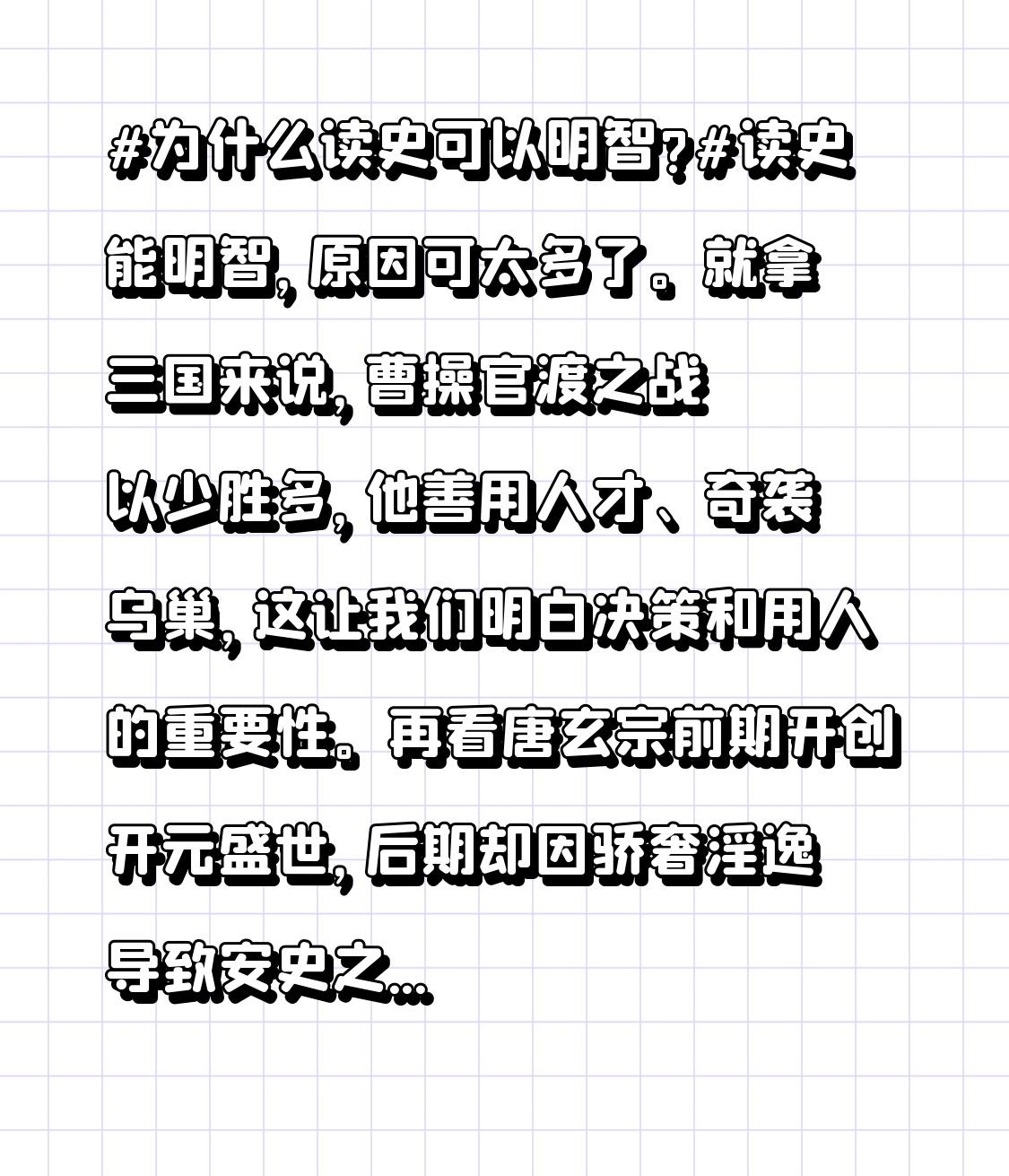 为什么读史可以明智?读史能明智,原因可太多了。就拿三国来说,曹操官渡之战以少胜多,他善用人才、奇袭乌巢,这让我们明白决策和用人的重要性。再看唐玄宗前期开创开元盛世,后期却因骄奢淫逸导致安史之乱,这警示我们要居安思危,不能被眼前的繁荣冲昏头脑。 历史就像一面镜子,记录着无数的兴衰成败。我们能从古人的经历中总结经验教训,少走弯路。无论是治国理政,还是为人处世,历史都能给我们提供借鉴,让我们在面对问题时更理智、更有智慧。