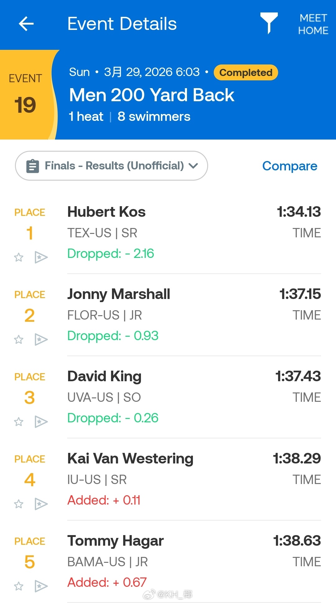 NCAA DI Men's Championships 男200码仰泳决赛Hubert Kos 1:34.13小幅刷新自己的NCAA和全美公开纪录! 正好自己生日这天打破这项纪录!Happy Birthday!🎉🎉🎉🎉