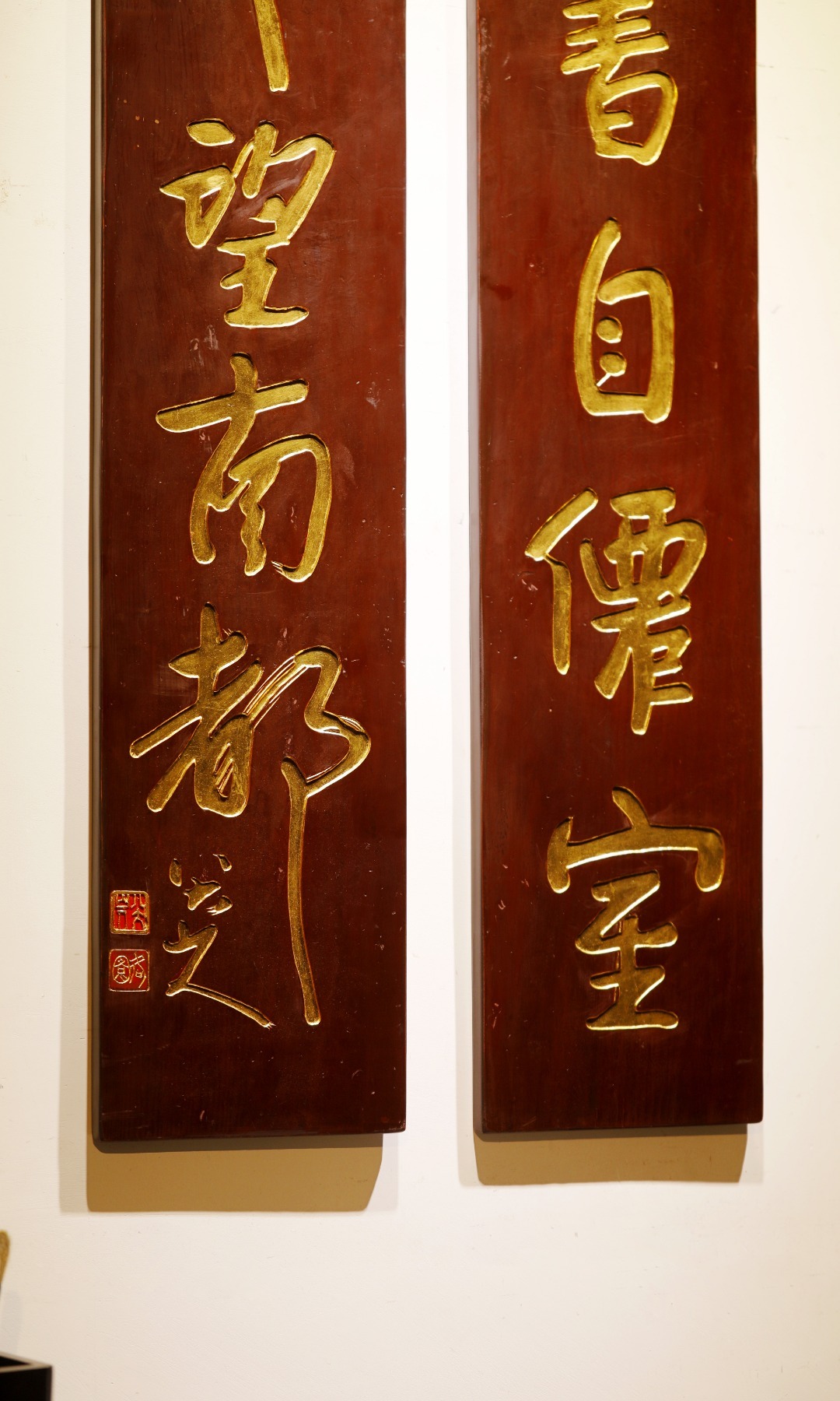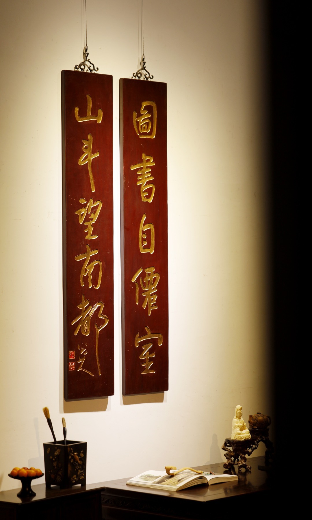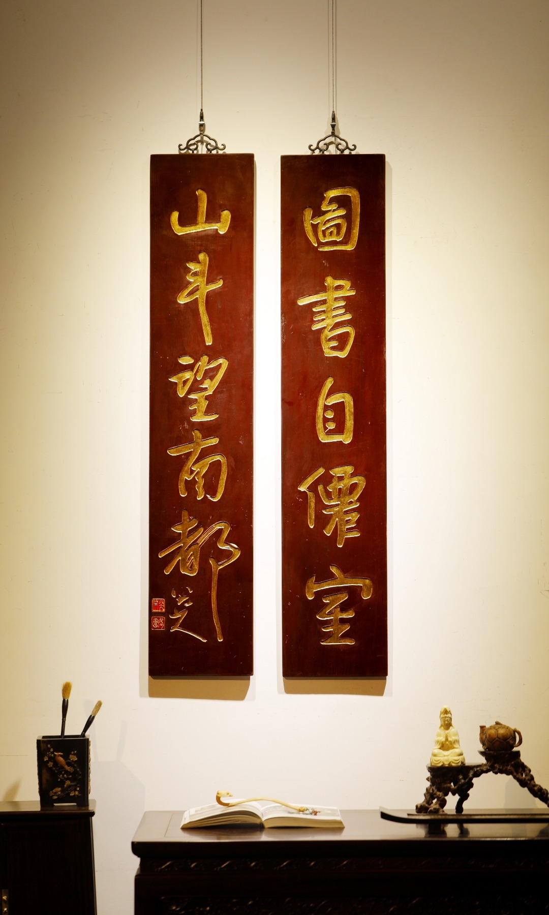 八大山人|老物件 五言联老楠木新作,手工阴刻贴真金箔,题识:“图书自仙室,山斗望