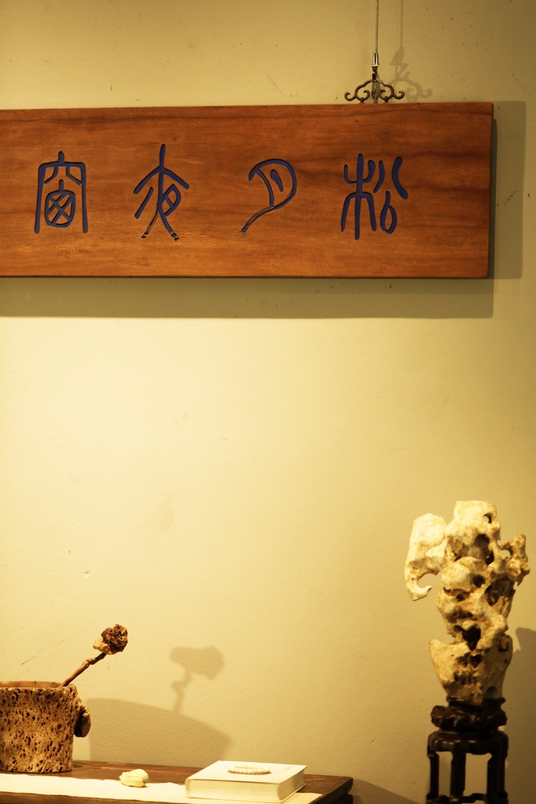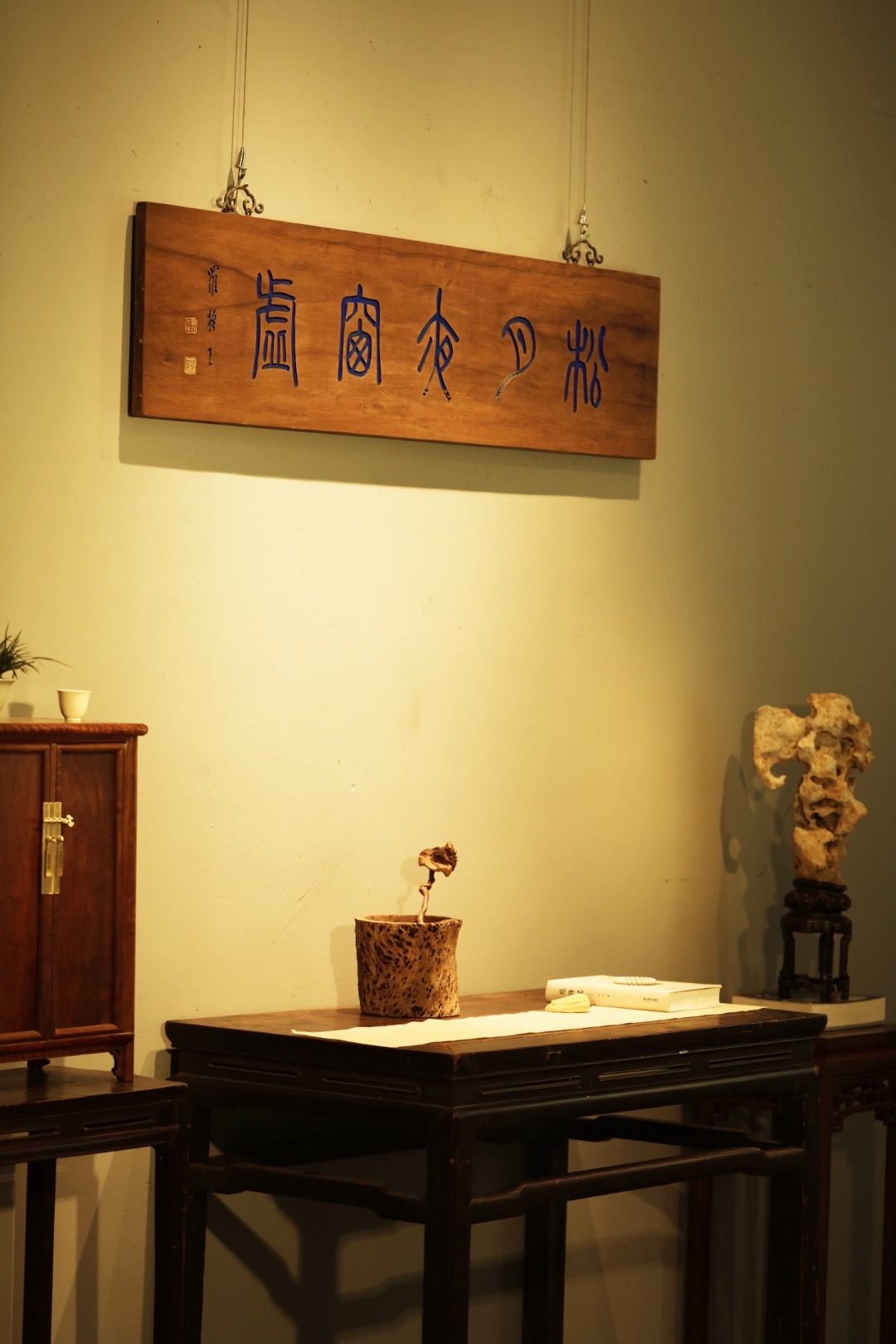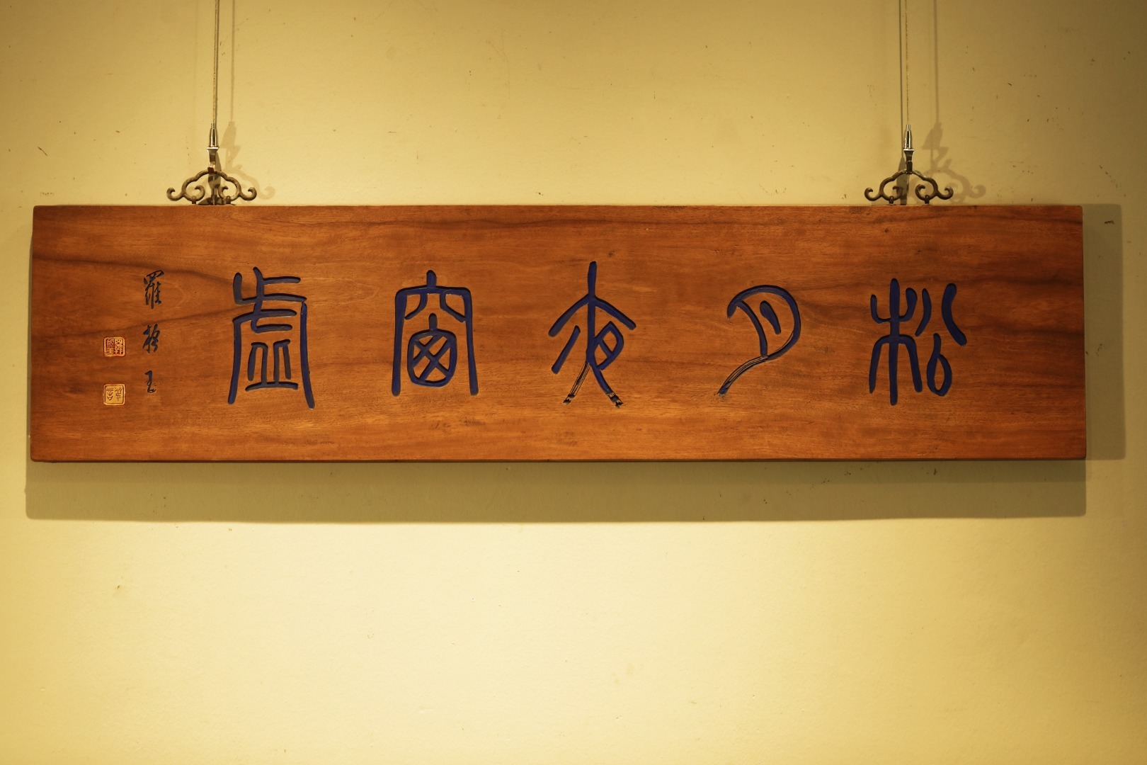 老楠木板新做,质地古朴,题字“松月夜窗虚”,手工刻画,后又矿彩漆绘,悬于厅堂文房,精致有韵。