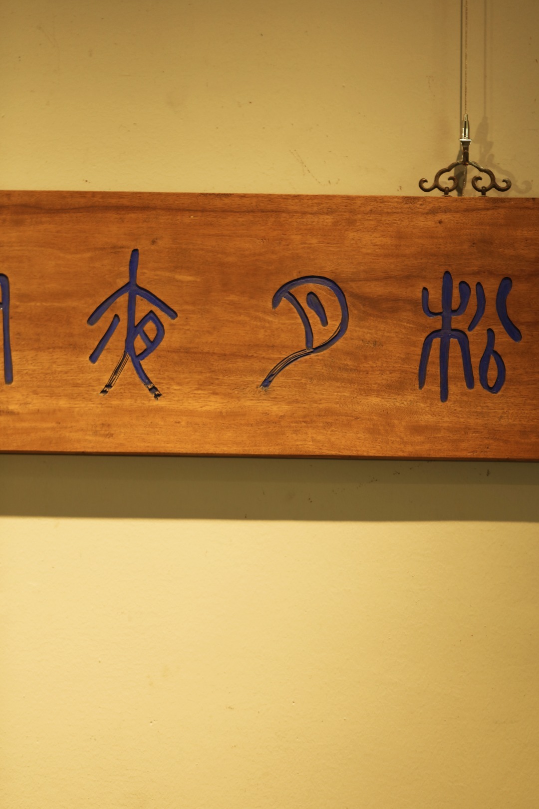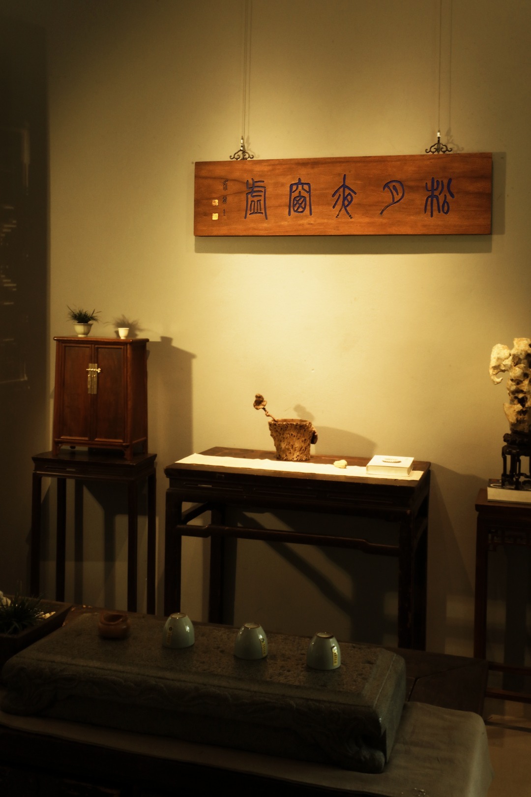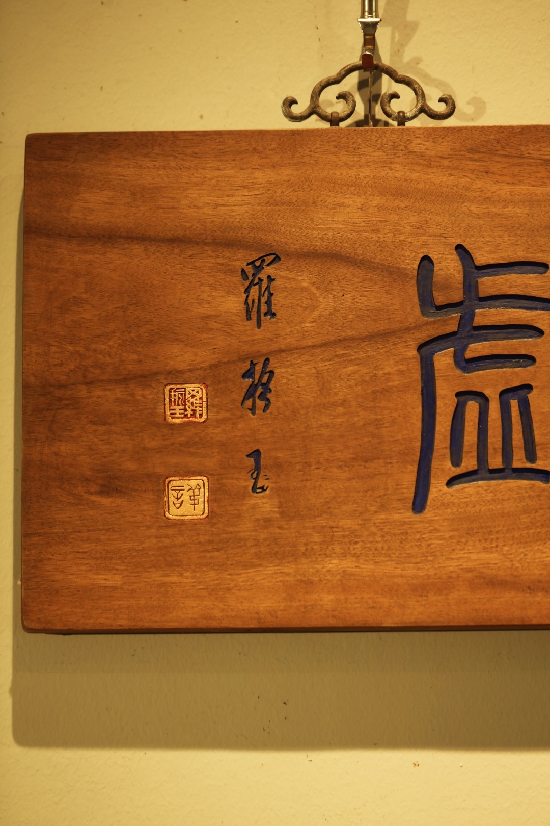 老楠木板新做,质地古朴,题字“松月夜窗虚”,手工刻画,后又矿彩漆绘,悬于厅堂文房,精致有韵。