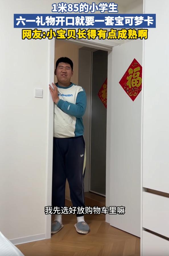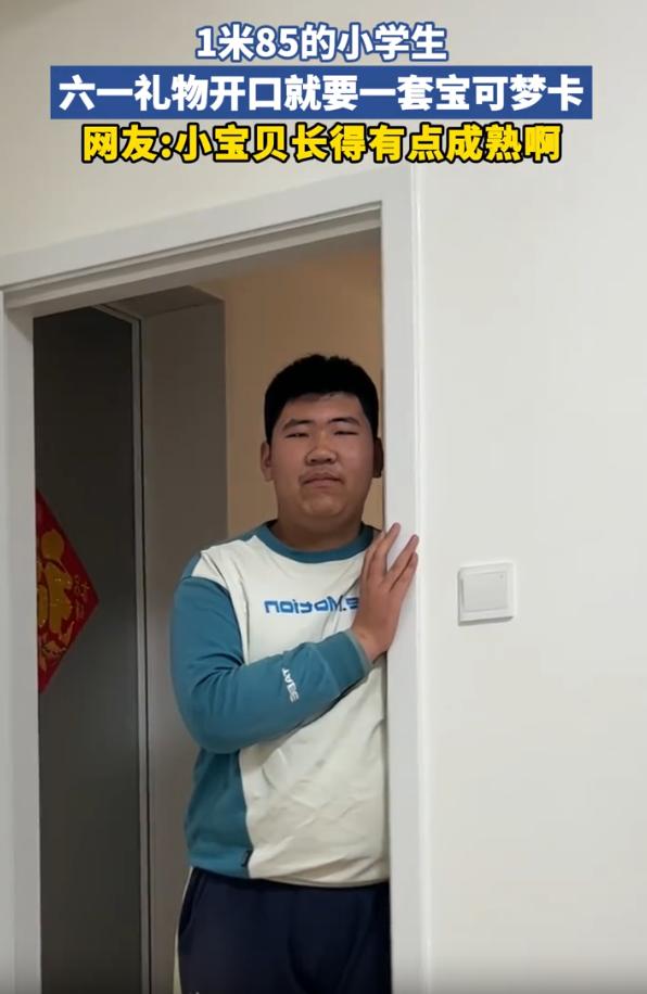 伤害性不高,侮辱性很强!安徽,一位妈妈在网上晒出六年级的儿子提前朝她要六一儿童节礼物,不过网友却把注意力都放在了男孩一米八五的身高和长相上面。网友:你家小宝贝长得有点成熟啊 视频中,男孩靠在门框上,一米八五的大高个,往那一站,已经像个成年人了。可他一开口,语气却特别反差,软软地跟妈妈说,想要一套宝可梦卡 妈妈逗他,说六一还早呢。孩子也不急,撒娇似的接了一句:我先放购物车里嘛 单听对话,确实是小学生和妈妈之间的日常拉锯。但再看那张脸,那个身高,那股成熟劲儿,怎么看怎么像一个大人在撒娇要玩具 有网友调侃:别买宝可梦了,回头给孩子办个老年卡吧 还有网友说:我儿子也是六年级,现在才157,还胖,但看着不成熟,稚嫩。如果像长这样,在外面他叫我妈妈我都不敢应他 这话乍一听是玩笑,细想其实挺真实 现在的小孩,尤其是六年级这一批,正好卡在儿童和少年的交界线上。有的还像小朋友,有的已经长得比成年人还高。但这种生理上的超前,和心理上的滞后,常常会形成一个特别微妙的阶段,外表看起来能打工了,内心还在等儿童节礼物 这件事有意思的地方就在这里 很多人看到这个男孩的第一反应,是用成年人的标准去打量他。觉得他长得这么高、这么成熟,不应该再玩宝可梦卡,甚至不应该再过儿童节。但仔细想想,他确实才上六年级,确实还是个孩子。喜欢宝可梦、想要儿童节礼物,这些需求和身高没有关系 我倒是觉得,六一儿童节的意义,本来就不在于年龄,也不在于身高,而在于一个人还能不能理直气壮地当一个孩子。哪怕一米八五,哪怕已经开始变声,哪怕看起来能打工了,只要他还愿意开口要一套宝可梦卡,那就说明他的童年还在。这本身是一件挺好的事