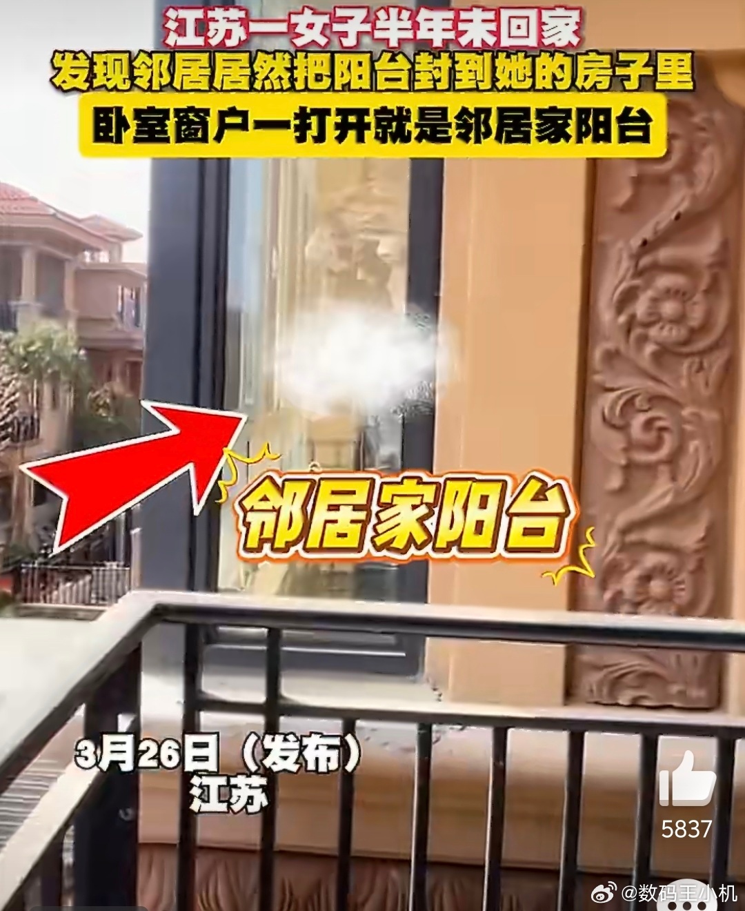 女子半年没回家卧室开窗变邻居阳台看到图一阳台外面我觉得还行,离他们家阳台还有一点