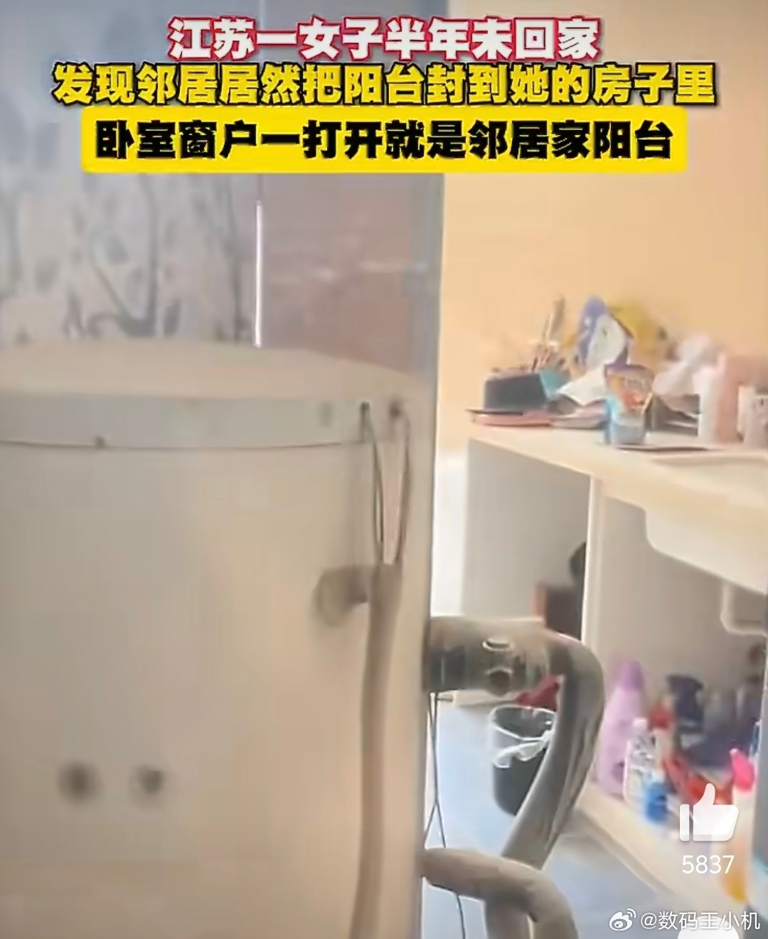 女子半年没回家卧室开窗变邻居阳台看到图一阳台外面我觉得还行,离他们家阳台还有一点距离,但是图二从屋内的窗户打开还是邻居家阳台我就绷不住了,这不就是违规安装建筑侵占他人空间吗