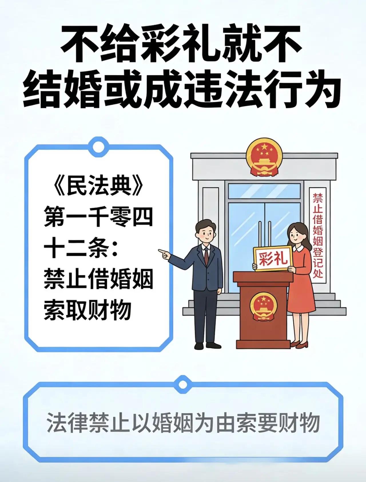现在又有人在渲染,讲述最高法新规,再次强调“不给彩礼就不结婚,属于违法行为”。但是最高法的规定是依据于民法典第1042条,这一条在2022年颁布之后,一直没有改变,已经实施近4年了。有明文规定,“禁止包办、买卖婚姻,禁止借婚姻索取财物”。 这就说明了,正常的财物索要是可以的,也是被民法典允许的。但是超过承受能力的金额彩礼索要,法律是可以不认可的。这种索要是不受法律保护的,假如将来男方家庭在事后起诉,找出依据表明,这些彩礼早已超出了自己家庭的承受范围,而且还是借贷支付,那么很有可能法院会判决多付的彩礼无效,要求返还。同样如果提出证据,女方有逼迫行为,例如发话“不给够就不领证”,那也是违法,不受法律保护!后续法院有可能要求彩礼部分返还。 但其实这仅仅是法律方面的道德引导,我们想想,假如出现这种法律诉讼的情况,一般来说,有可能男女方早已走到离婚的边缘,所以才翻起旧账去法院诉讼。如果小夫妻俩婚姻还很幸福,而男方老人去法院起诉,那小夫妻俩还能过得好吗? 不过这也给很多女方提了醒,即使在当初强要拿到了很高的彩礼,未来有可能日子过不下去,男方仍然可以举证向法院起诉,要回一部分彩礼,只要可以举证出女方强行索要,或者男方没有那么高的支付能力即可。 彩礼确实是自愿给付的,真的不应该作为女孩子身价的给付!高额彩礼的婚姻不会更稳固,而会更加脆弱!