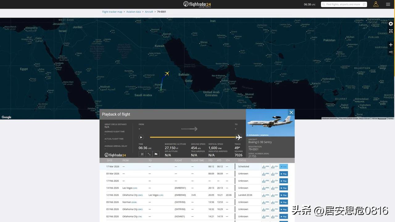 图片显示,美国E-3G“哨兵”机载预警和控制(AEW&C)飞机81-0005的总损失。 在昨天伊朗弹道导弹和无人机袭击沙特阿拉伯苏丹王子空军基地后,空军第552空中控制联队驻扎在俄克拉荷马州廷克空军基地。 袭击似乎故意瞄准了E-3最重要的部分,即飞机的后部,该部分容纳了旋转雷达圆顶,其中包含几个敏感仪器,包括E-3的AN/APY-2监控雷达系统的天线。🇺🇸 USAF E-3G 哨兵机队(16 架);最后报告位置时间:2026 年 3 月 2 日 77-0351 AE11DF正在加勒比地区开展行动,具体行动方式为THNDR07 ;可能涉及更多法外处决,行动地点包括墨西哥🇲🇽 、古巴🇨🇺或委内瑞拉🇻🇪 。无论如何,他们试图利用 LADD 来掩盖其行动。 苏丹王子 AB 🇸🇦 (6) ➢ 🇺🇸 82-0007 AE11F0 ➢ 🇺🇸 75-0556 AE11D6 ➢ 🇺🇸 76-1605 AE11DC ➢ 🇺🇸 79-0001 AE11E7 ➢ 🇺🇸 81-0005 AE11EE ➢ 🇺🇸 76-1604 AE11DB 埃尔门多夫空军基地🇺🇸 (1) ➢ 🇺🇸 80-0137