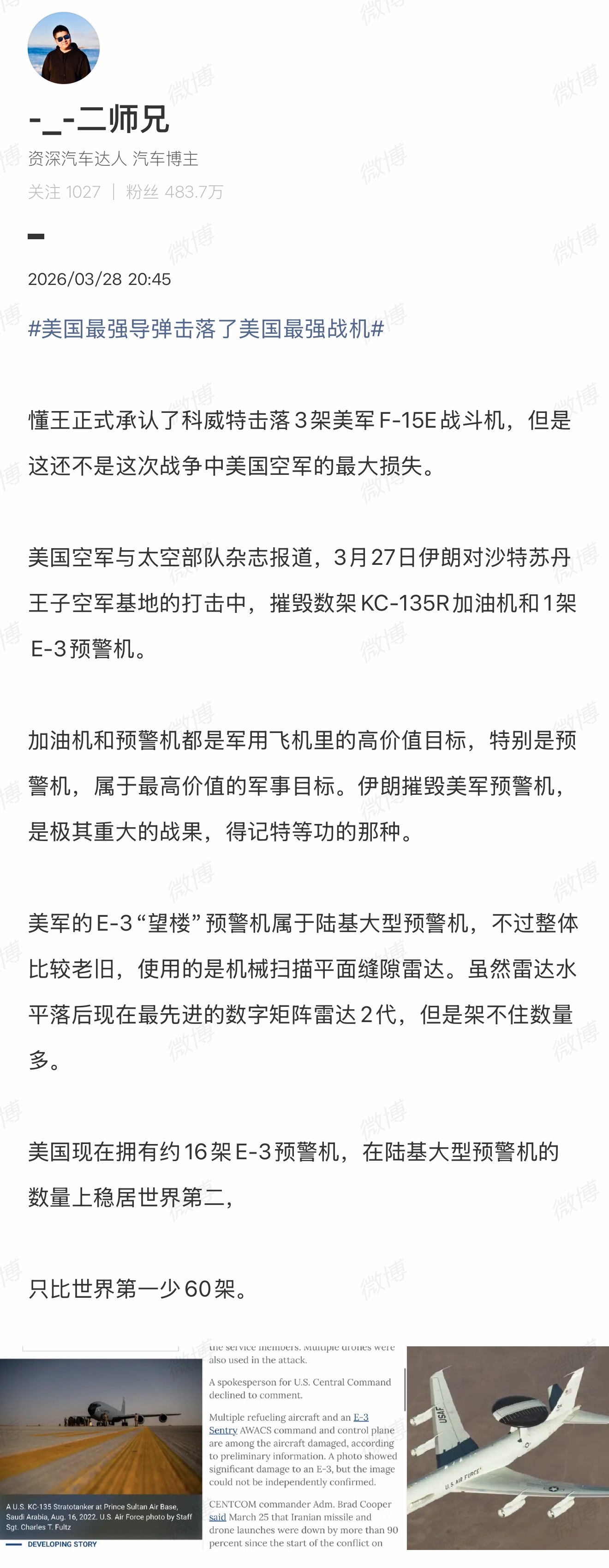 伊朗连遭重创绝地反击昨天师兄说的伊朗干掉美军一架E-3预警机的事儿,有图了。美军