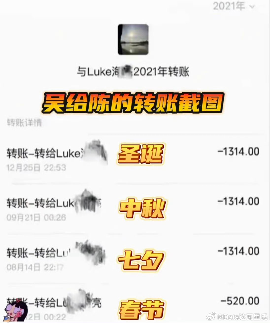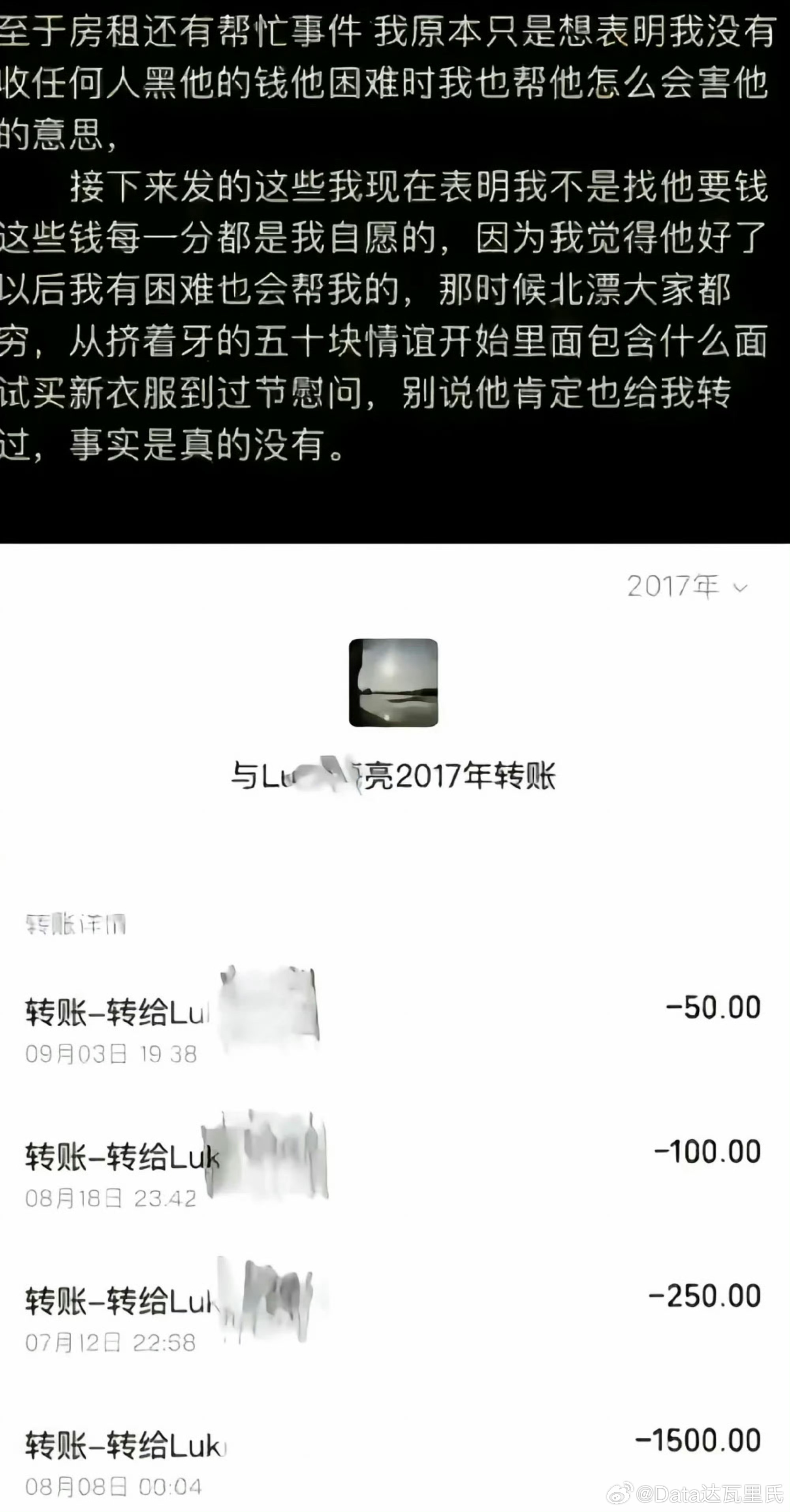 吴楚一晒出2017-2023年转账记录,520、1314等特殊金额频现,覆盖陈牧驰北漂房租、医疗费,甚至借呗套现垫付医药费。