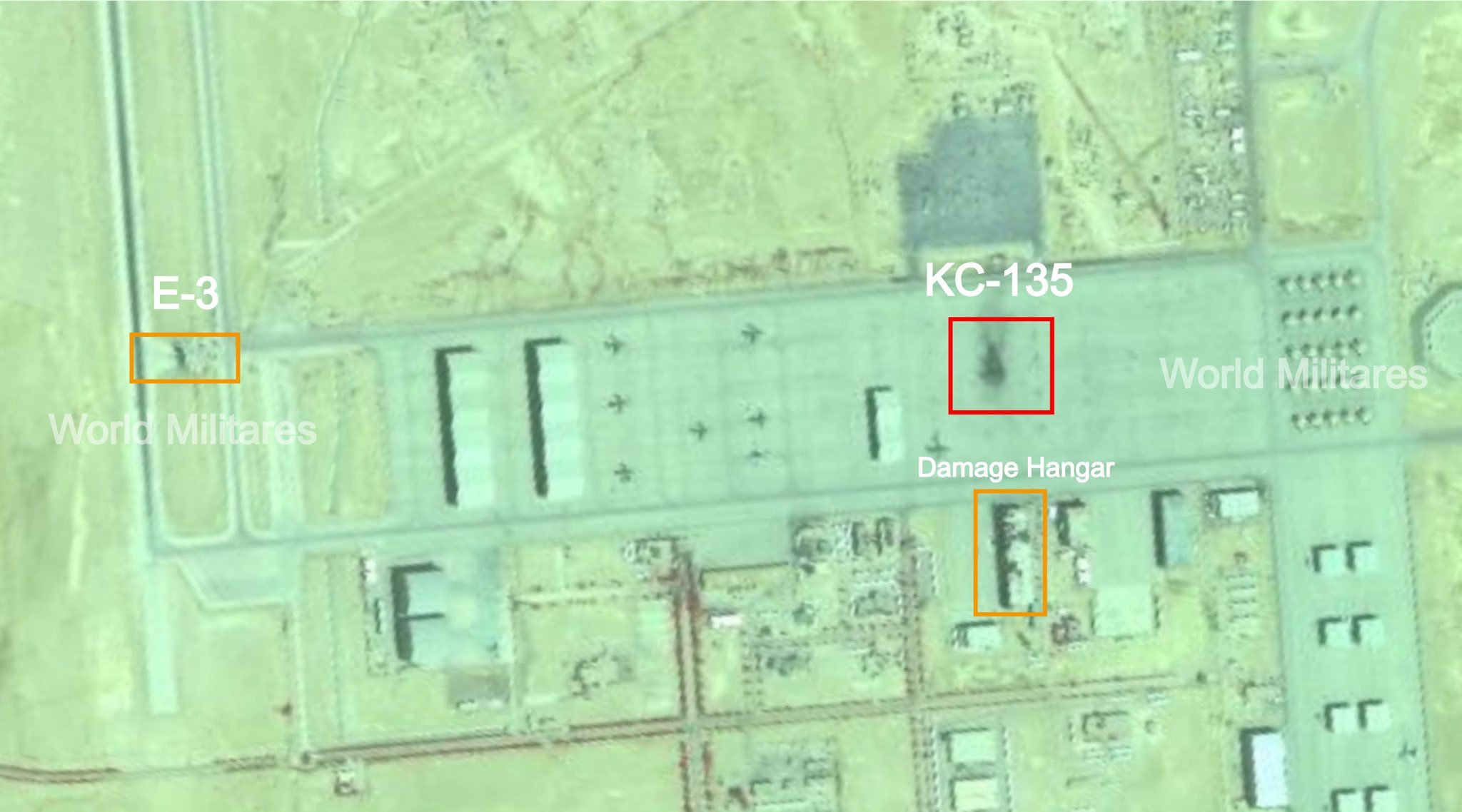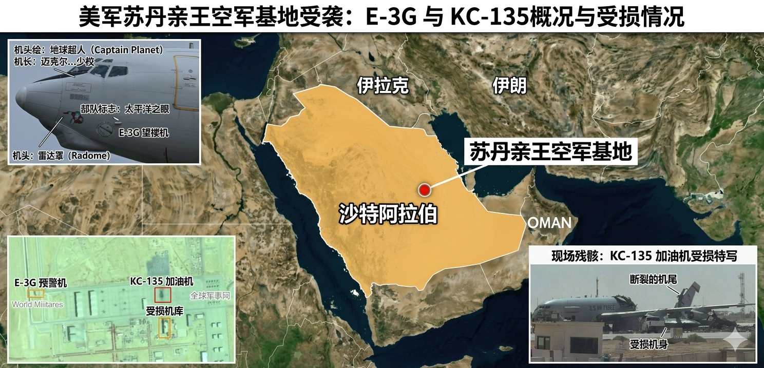 【杀死“地球超人”】因伊朗袭击而被摧毁的MD二等人E-3G“望楼”预警机(81-0005),伊朗周五向沙特阿拉伯苏丹王子空军基地发射了6枚弹道导弹和29架无人机,造成至少15名美军士兵受伤,其中5人伤势严重。军事ai新视野美伊以冲突