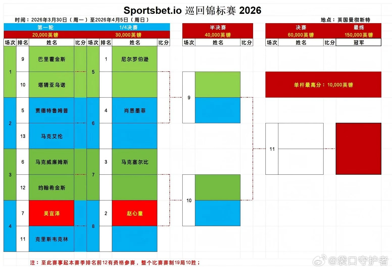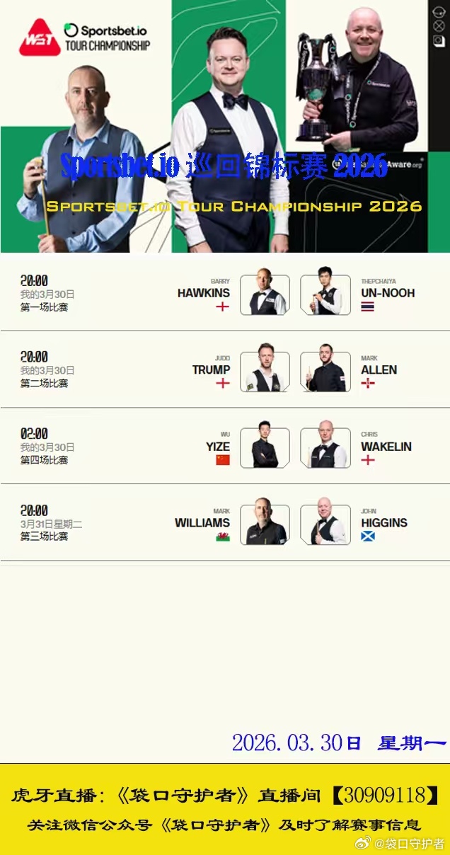 2026斯诺克巡回锦标赛明日开赛 赛制11局10胜2026.3.30日 星期一20:00 直播 贾德特鲁姆普VS马克艾伦2026.3.31日 星期二2:00 直播 吴宜泽VS克里斯韦克林