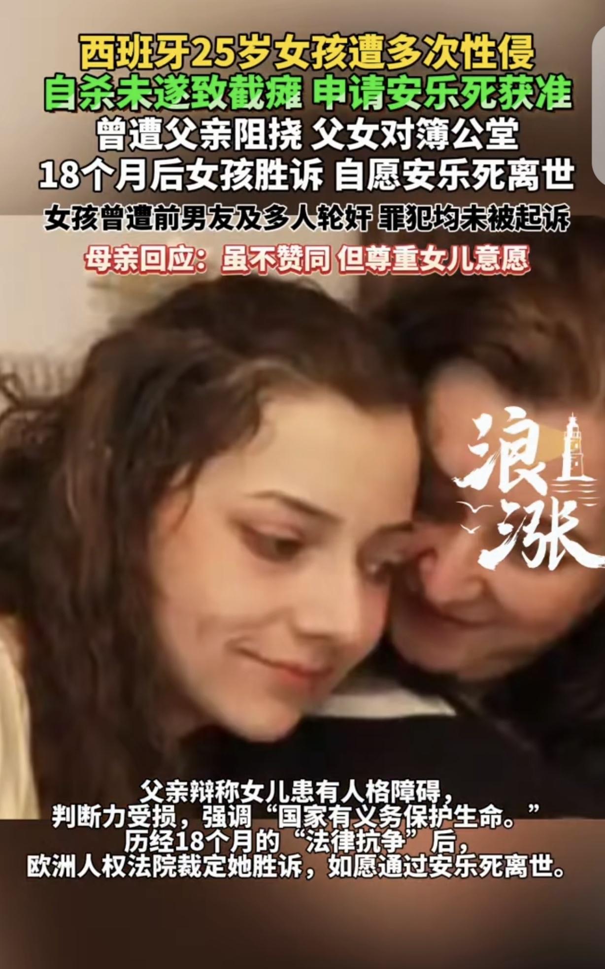 “死的资格都没有?”一25岁女子被前男友,还有多人数次侵犯,崩溃之下,她自杀未遂导致截瘫,女子觉得活着太痛苦,申请安乐被批准,父亲却说啥都不同意,女子无奈把父亲推上被告席,18个月后,她胜诉,终于为自己争取到死亡的资格,让人匪夷所思的是,罪犯却都没被起诉。女子母亲一句话,听了让人泪目。 在西班牙,有个25岁的女子被前男友伙同多人,数次侵犯。 噩梦般的经历,让她精神彻底崩溃。在绝望之中,她选择了自杀。 可命运弄人,自杀未遂的她却因此导致截瘫,从此只能躺在床上,生活无法自理,这让她的生活雪上加霜,生不如死。 身体的残疾加上心灵的创伤,让女子觉得活着每一秒都是煎熬。 她觉得死亡或许才是解脱,于是向相关部门申请安乐。 幸运的是,她的申请得到了批准。可这一决定却遭到了父亲的强烈反对。 父亲认为女儿患有人格障碍,没了判断力,才钻牛角尖,好死不如赖活着,应该忘记伤害,好好活着,不能让他们白发人送黑发人。 而且,父亲觉得相关部门就不该批准女儿的安乐申请,公民的生命应该得到保护。 一边是女子求死的决心,一边是父亲坚决的阻拦,女子无奈之下,只能将父亲告上法庭。 这场官司一打就是18个月,这18个月里,女子承受着身体和精神的双重折磨,每一天都过得度日如年。 但她始终没有放弃,因为她太渴望摆脱痛苦了,在她看来,父母生养自己一场,她应该陪伴父母,并膝下尽孝,但生活出现这么大变故,她无法承受,只想快点解脱。 父母一厢情愿的挽留她,一点都不自己考虑,未免太自私了。 终于,法院做出了判决,女子胜诉了。她终于为自己争取到了“死亡”的资格。 这个结果让人既心酸又无奈,一个年轻的生命,本该未来可期,前途似锦,却因为那些罪犯的恶行,走到了这一步。 更让人匪夷所思的是,那些侵犯女子的罪犯,竟然都没有被起诉。他们逍遥法外,而女子却要在痛苦中挣扎,甚至为了结束痛苦,还要和父亲对簿公堂。 女子的母亲在这件事上,虽然不认同女儿的选择,但她尊重女儿的意愿。 她心里明白,女儿这些年过得太苦了,那种痛苦是常人无法体会的。 她曾私下里说:“我多想替她承受这一切,可我做不到,只能看着她这么痛苦地活着或者选择离开。”这句话听了让人忍不住泪目。 一个母亲,看着自己的女儿遭受如此磨难,却无能为力,该是多么的心痛啊。 而这场悲剧的背后,是法律的漏洞,还是人性的冷漠?那些罪犯为什么能逃脱法律的制裁? 根据西班牙2021年通过的《安乐死合法化法案》,任何患有“严重且无法治愈”或“导致持续且无法忍受痛苦”的疾病,且在申请时具备完全民事行为能力的人,均有权申请协助死亡。 本案中,法院支持女子胜诉的核心在于:尽管父亲以女儿患有“人格障碍”为由质疑其判断力? 但医疗评估和多级法院最终认定,她的截瘫与精神创伤已造成不可逆的极端痛苦,且她具备清醒的自主意志。 法律在此处倾向于保护个体的“自我决定权”,而非强制性的生命延续。 对此,你怎么看? 关注@运良说法 学法律知识不迷路