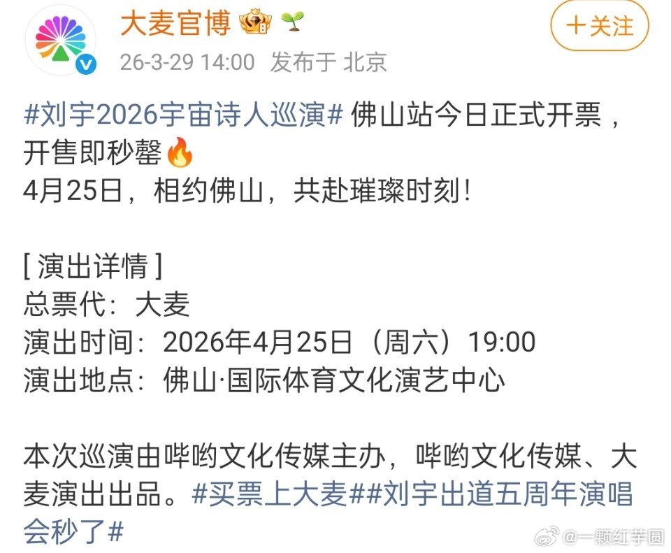 刘宇 宇宙诗人巡演佛山站开售即秒磬!号召力牛!