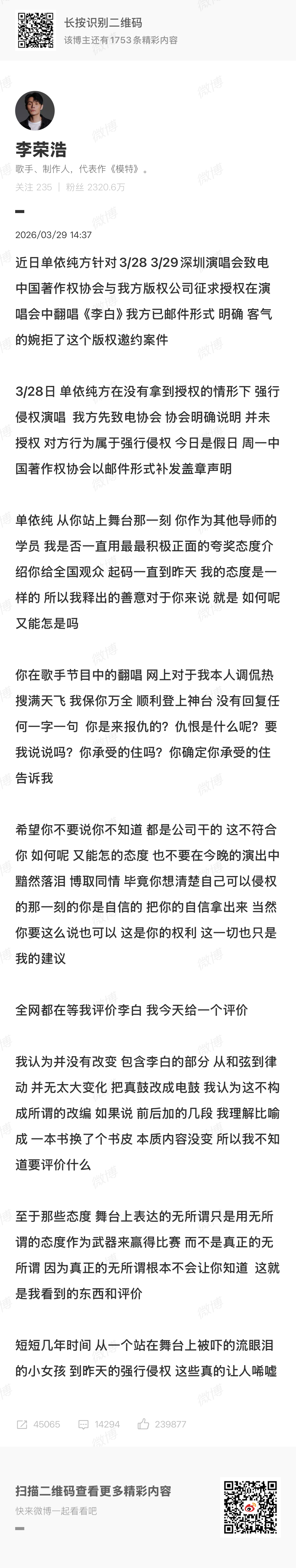 强势围观!李荣浩发文控诉单依纯强行侵权演唱他的作品李白,还说了:你是来报仇的?仇恨是什么?